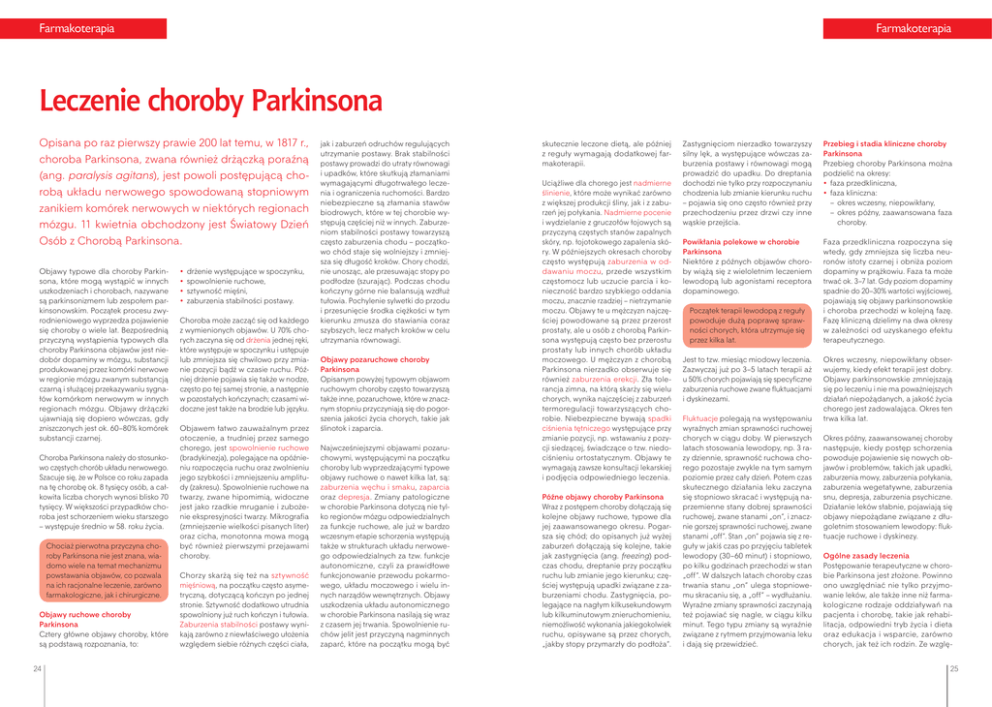 Farmakoterapia Farmakoterapia Leczenie choroby Parkinsona Opisana po raz pierwszy prawie 200 lat temu, w 1817 r., choroba Parkinsona, zwana również drżączką poraźną (ang. paralysis agitans), jest powoli postępującą cho robą układu nerwowego spowodowaną stopniowym zanikiem komórek nerwowych w niektórych regionach mózgu. 11 kwietnia obchodzony jest Światowy Dzień Osób z Chorobą Parkinsona. Objawy typowe dla choroby Parkin sona, które mogą wystąpić w innych uszkodzeniach i chorobach, nazywane są parkinsonizmem lub zespołem par kinsonowskim. Początek procesu zwy rodnieniowego wyprzedza pojawienie się choroby o wiele lat. Bezpośrednią przyczyną wystąpienia typowych dla choroby Parkinsona objawów jest nie dobór dopaminy w mózgu, substancji produkowanej przez komórki nerwowe w regionie mózgu zwanym substancją czarną i służącej przekazywaniu sygna łów komórkom nerwowym w innych regionach mózgu. Objawy drżączki ujawniają się dopiero wówczas, gdy zniszczonych jest ok. 60–80% komórek substancji czarnej. Choroba Parkinsona należy do stosunko wo częstych chorób układu nerwowego. Szacuje się, że w Polsce co roku zapada na tę chorobę ok. 8 tysięcy osób, a cał kowita liczba chorych wynosi blisko 70 tysięcy. W większości przypadków cho roba jest schorzeniem wieku starszego – występuje średnio w 58. roku życia. Chociaż pierwotna przyczyna cho roby Parkinsona nie jest znana, wia domo wiele na temat mechanizmu powstawania objawów, co pozwala na ich racjonalne leczenie, zarówno farmakologiczne, jak i chirurgiczne. Objawy ruchowe choroby Parkinsona Cztery główne objawy choroby, które są podstawą rozpoznania, to: 24 • drżenie występujące w spoczynku, • spowolnienie ruchowe, • sztywność mięśni, • zaburzenia stabilności postawy. Choroba może zacząć się od każdego z wymienionych objawów. U 70% cho rych zaczyna się od drżenia jednej ręki, które występuje w spoczynku i ustępuje lub zmniejsza się chwilowo przy zmia nie pozycji bądź w czasie ruchu. Póź niej drżenie pojawia się także w nodze, często po tej samej stronie, a następnie w pozostałych kończynach; czasami wi doczne jest także na brodzie lub języku. Objawem łatwo zauważalnym przez otoczenie, a trudniej przez samego chorego, jest spowolnienie ruchowe (bradykinezja), polegające na opóźnie niu rozpoczęcia ruchu oraz zwolnieniu jego szybkości i zmniejszeniu amplitu dy (zakresu). Spowolnienie ruchowe na twarzy, zwane hipomimią, widoczne jest jako rzadkie mruganie i zuboże nie ekspresyjności twarzy. Mikrografia (zmniejszenie wielkości pisanych liter) oraz cicha, monotonna mowa mogą być również pierwszymi przejawami choroby. Chorzy skarżą się też na sztywność mięśniową, na początku często asyme tryczną, dotyczącą kończyn po jednej stronie. Sztywność dodatkowo utrudnia spowolniony już ruch kończyn i tułowia. Zaburzenia stabilności postawy wyni kają zarówno z niewłaściwego ułożenia względem siebie różnych części ciała, jak i zaburzeń odruchów regulujących utrzymanie postawy. Brak stabilności postawy prowadzi do utraty równowagi i upadków, które skutkują złamaniami wymagającymi długotrwałego lecze nia i ograniczenia ruchomości. Bardzo niebezpieczne są złamania stawów biodrowych, które w tej chorobie wy stępują częściej niż w innych. Zaburze niom stabilności postawy towarzyszą często zaburzenia chodu – początko wo chód staje się wolniejszy i zmniej sza się długość kroków. Chory chodzi, nie unosząc, ale przesuwając stopy po podłodze (szurając). Podczas chodu kończyny górne nie balansują wzdłuż tułowia. Pochylenie sylwetki do przodu i przesunięcie środka ciężkości w tym kierunku zmusza do stawiania coraz szybszych, lecz małych kroków w celu utrzymania równowagi. Objawy pozaruchowe choroby Parkinsona Opisanym powyżej typowym objawom ruchowym choroby często towarzyszą także inne, pozaruchowe, które w znacz nym stopniu przyczyniają się do pogor szenia jakości życia chorych, takie jak ślinotok i zaparcia. Najwcześniejszymi objawami pozaru chowymi, występującymi na początku choroby lub wyprzedzającymi typowe objawy ruchowe o nawet kilka lat, są: zaburzenia węchu i smaku, zaparcia oraz depresja. Zmiany patologiczne w chorobie Parkinsona dotyczą nie tyl ko regionów mózgu odpowiedzialnych za funkcje ruchowe, ale już w bardzo wczesnym etapie schorzenia występują także w strukturach układu nerwowe go odpowiedzialnych za tzw. funkcje autonomiczne, czyli za prawidłowe funkcjonowanie przewodu pokarmo wego, układu moczowego i wielu in nych narządów wewnętrznych. Objawy uszkodzenia układu autonomicznego w chorobie Parkinsona nasilają się wraz z czasem jej trwania. Spowolnienie ru chów jelit jest przyczyną nagminnych zaparć, które na początku mogą być skutecznie leczone dietą, ale później z reguły wymagają dodatkowej far makoterapii. Uciążliwe dla chorego jest nadmierne ślinienie, które może wynikać zarówno z większej produkcji śliny, jak i z zabu rzeń jej połykania. Nadmierne pocenie i wydzielanie z gruczołów łojowych są przyczyną częstych stanów zapalnych skóry, np. łojotokowego zapalenia skó ry. W późniejszych okresach choroby często występują zaburzenia w od dawaniu moczu, przede wszystkim częstomocz lub uczucie parcia i ko nieczność bardzo szybkiego oddania moczu, znacznie rzadziej – nietrzymanie moczu. Objawy te u mężczyzn najczę ściej powodowane są przez przerost prostaty, ale u osób z chorobą Parkin sona występują często bez przerostu prostaty lub innych chorób układu moczowego. U mężczyzn z chorobą Parkinsona nierzadko obserwuje się również zaburzenia erekcji. Zła tole rancja zimna, na którą skarży się wielu chorych, wynika najczęściej z zaburzeń termoregulacji towarzyszących cho robie. Niebezpieczne bywają spadki ciśnienia tętniczego występujące przy