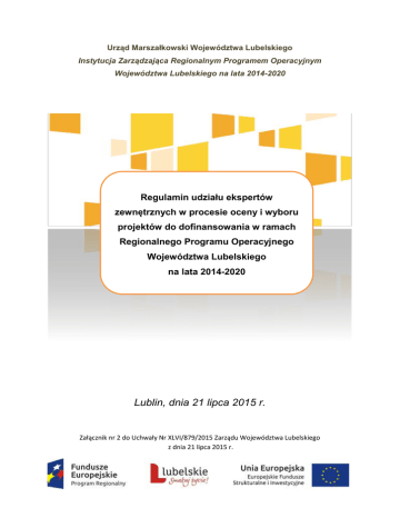 Urząd Marszałkowski Województwa Lubelskiego Instytucja Zarządzająca Regionalnym Programem Operacyjnym Województwa Lubelskiego na lata 2014-2020 Regulamin udziału ekspertów zewnętrznych w procesie oceny i wyboru projektów do dofinansowania w ramach Regionalnego Programu Operacyjnego Województwa Lubelskiego na lata 2014-2020 Lublin, dnia 21 lipca 2015 r. Załącznik nr 2 do Uchwały Nr XLVI/879/2015 Zarządu Województwa Lubelskiego z dnia 21 lipca 2015 r. WYKAZ SKRÓTÓW: DW EFRR DW EFS DZ RPO IOK IP IZ RPO KPA LAWP RPO WL UMWL WUP ZWL Departament Wdrażania Europejskiego Funduszu Rozwoju Regionalnego Departament Wdrażania Europejskiego Funduszu Społecznego Departament Zarządzania Regionalnym Programem Operacyjnym Instytucja organizująca konkurs tj.: Departament Wdrażania EFRR, Departament Wdrażania EFS, Lubelska Agencja Wspierania Przedsiębiorczości w Lublinie, Wojewódzki Urząd Pracy w Lublinie Instytucja Pośrednicząca w realizacji Regionalnego Programu Operacyjnego Województwa Lubelskiego na lata 2014-2020 Instytucja Zarządzająca Regionalnym Programem Operacyjnym Województwa Lubelskiego na lata 2014-2020 Kodeks Postępowania Administracyjnego Lubelska Agencja Wspierania Przedsiębiorczości w Lublinie Regionalny Program Operacyjny Województwa Lubelskiego na lata 2014-2020 Urząd Marszałkowski Województwa Lubelskiego w Lublinie Wojewódzki Urząd Pracy w Lublinie Zarząd Województwa Lubelskiego UŻYTE W DOKUMENCIE OKREŚLENIA OZNACZAJĄ: Ustawa wdrożeniowa Wykaz Ustawa z dnia 11 lipca 2014 r. o zasadach realizacji programów w zakresie polityki spójności finansowanych w perspektywie finansowej 2014-2020 Wykaz kandydatów na ekspertów (o którym mowa w art. 49 ust. 10 ustawy wdrożeniowej) w ramach Regionalnego Programu Operacyjnego Województwa Lubelskiego na lata 2014-2020 2/14 §1 Postanowienia ogólne 1. W wybór projektów do dofinansowania mogą być zaangażowani eksperci zewnętrzni, o których mowa w art. 49 ustawy z dnia 11 lipca 2014 r. o zasadach realizacji programów w zakresie polityki spójności finansowanych w perspektywie finansowej 2014-2020 (zwanej dalej ustawą wdrożeniową). 2. Udział ekspertów, o których mowa powyżej, w wyborze projektów do dofinansowania jest w szczególności uzasadniony w sytuacji, gdy niezbędna jest specjalistyczna wiedza w danej dziedzinie lub w sytuacji, gdy liczba projektów zagraża terminowemu dokonaniu oceny wyłącznie przez pracowników właściwej instytucji ogłaszającej konkurs (IOK). 3. Ekspertów do udziału w wyborze projektów do dofinansowania wyznacza właściwa IOK. Zasady pracy ekspertów i ich wynagradzania za udział w ocenie i wyborze projektów do dofinansowania zostaną uregulowane w umowie podpisanej pomiędzy Instytucją Zarządzającą (IZ RPO) Regionalnym Programem Operacyjnym na lata 2014-2020 (RPO WL, Programem) lub Instytucją Pośredniczącą (IP), a kandydatem na ekspertem. 4. Udział eksperta w wyborze projektów do dofinansowania oznacza możliwość zaangażowania eksperta we wszelkie czynności związane z wyborem projektów do dofinansowania określone w umowie pomiędzy IZ RPO/IP a ekspertem, począwszy od zgłoszenia projektu do objęcia dofinansowaniem, do jego wybrania do dofinansowania albo odrzucenia. 5. Rola eksperta ma charakter: a) rozstrzygający, co oznacza, że wynik oceny przeprowadzonej przez eksperta, odnośnie spełnienia albo niespełnienia danego kryterium lub przyznania danej liczby punktów, wraz ze sporządzonym uzasadnieniem powyższej oceny, jest wiążący dla IOK, lub b) opiniodawczo-doradczy, co oznacza, że ekspert przedstawia swoją opinię na temat danego projektu lub jego wybranych elementów pracownikom właściwej instytucji lub innym ekspertom oceniającym projekt, wraz ze stosownym uzasadnieniem lub przekazuje rady lub rekomendacje w odniesieniu do sposobu oceny danego projektu lub wybranych aspektów związanych z oceną danego projektu, pracownikom właściwej instytucji lub innym ekspertom oceniającym projekt. Opinia, rada lub rekomendacje nie mają charakteru wiążącego. Niezależnie od charakteru roli eksperta wynik oceny projektu i jego uzasadnienie są formułowane na wyłączną odpowiedzialność IOK i są jej stanowiskiem. 6. IOK może zlecić ekspertowi ocenę lub wystąpić o wyrażenie opinii na temat określonego zakresu projektu np. jego części finansowej. Ocenę/wyrażenie opinii w zakresie pozostałych elementów projektu IOK może zlecić innemu ekspertowi lub w przypadku trybu pozakonkursowego innym osobom. 7. Status eksperta uzyskuje kandydat na eksperta, z którym IZ RPO/IP zawarła umowę dotyczącą udziału w wyborze projektów. 3/14 §2 Wykaz kandydatów na ekspertów 1. Zarząd Województwa Lubelskiego (ZWL), jako IZ RPO, poprzez opracowanie jednolitych zasad, zapewnia funkcjonowanie przejrzystego i konkurencyjnego systemu naboru kandydatów na ekspertów w ramach Programu. 2. Nabór, o którym mowa w ust. 1 prowadzony jest w celu utworzenia „Wykazu kandydatów na ekspertów w ramach Regionalnego Programu Operacyjnego Województwa Lubelskiego na lata 2014-2020” (Wykaz). 3. Wykaz, stanowi listę kandydatów na ekspertów (zwanych dalej kandydatami) mogących brać udział w procesie oceny i wyboru wniosków do dofinansowania i specjalizujących się w ocenie/opiniowaniu projektów w ramach dziedzin wymienionych w Załączniku nr 1 do niniejszego Regulaminu pn. „Zestawienie specjalizacji ekspertów biorących udział w ocenie/opiniowaniu projektów w ramach RPO WL 2014 – 2020 oraz wymagań szczegółowych wobec kandydatów na ekspertów” (zwane dalej Zestawieniem). 4. W ramach IZ RPO Wykaz prowadzony jest przez Departament Zarządzania Regionalnym Programem Operacyjnym (DZ RPO) Urzędu Marszałkowskiego Województwa Lubelskiego w Lublinie (UMWL). 5. Z Wykazu korzystają jednostki i podmioty prowadzące ocenę wniosków o dofinansowanie w ramach RPO WL tj.: Departament Wdrażania Europejskiego F
