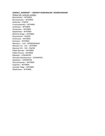 OSIEDLE „MORSKIE” – ODPADY KOMUNALNE I SEGREGOWANE Wykaz ulic i placów osiedla: Bosmańska – WTOREK Bursztynowa – WTOREK Dokerów – PIĄTEK Franciszkańska – WTOREK Jachtowa – WTOREK Jantarowa – WTOREK Kapitańska – WTOREK Martina Kinga – WTOREK Kosynierów – PIĄTEK Krańcowa – WTOREK Kutrowa – WTOREK Morska 1 - 110 – PONIEDZIAŁEK Morska 111 - 151 – WTOREK Morska 153 - 155 - PIĄTEK Pablo Nerudy – WTOREK Pablo Picassa - WTOREK Rybacka – CZWARTEK Henryka Sienkiewicza – CZWARTEK Spokojna – CZWARTEK Stoczniowców – WTOREK Szyprów – WTOREK Leonida Teligi – WTOREK Wydmowa – WTOREK