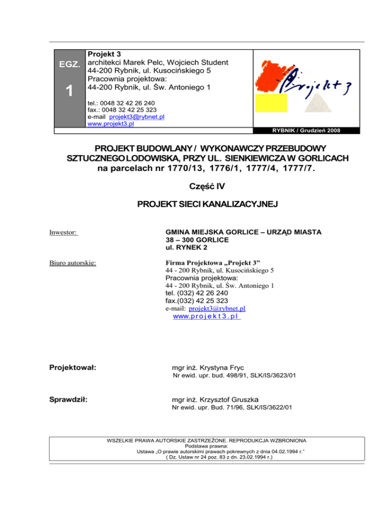 Projekt 3 EGZ. architekci Marek Pelc, Wojciech Student 44-200 Rybnik, ul. Kusocińskiego 5 Pracownia projektowa: 44-200 Rybnik, ul. Św. Antoniego 1 1 tel.: 0048 32 42 26 240 fax.: 0048 32 42 25 323 e-mail [email protected] www.projekt3.pl RYBNIK / Grudzień 2008 PROJEKT BUDOWLANY / WYKONAWCZY PRZEBUDOWY SZTUCZNEGO LODOWISKA, PRZY UL. SIENKIEWICZA W GORLICACH na parcelach nr 1770/13, 1776/1, 1777/4, 1777/7. Część IV PROJEKT SIECI KANALIZACYJNEJ Inwestor: GMINA MIEJSKA GORLICE – URZĄD MIASTA 38 – 300 GORLICE ul. RYNEK 2 Biuro autorskie: Firma Projektowa „Projekt 3” 44 - 200 Rybnik, ul. Kusocińskiego 5 Pracownia projektowa: 44 - 200 Rybnik, ul. Św. Antoniego 1 tel. (032) 42 26 240 fax.(032) 42 25 323 e-mail: [email protected] www.p r o j e k t 3 . p l Projektował: mgr inŜ. Krystyna Fryc Nr ewid. upr. bud. 498/91, SLK/IS/3623/01 Sprawdził: mgr inŜ. Krzysztof Gruszka Nr ewid. upr. Bud. 71/96, SLK/IS/3622/01 WSZELKIE PRAWA AUTORSKIE ZASTRZEśONE. REPRODUKCJA WZBRONIONA Podstawa prawna: Ustawa „O prawie autorskimi prawach pokrewnych z dnia 04.02.1994 r.” ( Dz. Ustaw nr 24 poz. 83 z dn. 23.02.1994 r.) SPIS TREŚCI. I. OPIS TECHNICZNY. 1. Podstawa opracowania. 2. Zakres opracowania. 3. Dane ogólne. 4. Sieć kanalizacji deszczowej. 5. Wykonawstwo – wytyczne realizacji. 5.1. Roboty przygotowawcze 5.2. Roboty ziemne i odwodnienie wykopów. 5.3. Zabezpieczenie przejść dla pieszych i przejazdu. 5.4. MontaŜ kanałów ściekowych. 5.6. Próby odbiorowe. 5.7. Roboty wykończeniowe. 6. Uwagi końcowe. II. INFORMACJA DOTYCZĄCA BEZPIECZEŃSTWA I OCHRONY ZDROWIA. III. ZAŁĄCZNIKI: IV. RYSUNKI: 1. Plan sytuacyjny. 2. Profil kanalizacji. 3. Profil kanalizacji. 4. Szczegół podłączenia wpustu. 5. Studzienka kanalizacyjna Ø 1200 – rys. typowy. 1. Podstawa opracowania. − − − − Umowa z Inwestorem; Podkład geodezyjny w skali 1:500; Obowiązujące normy i przepisy; Uzgodnienia braznŜowe. 2. Zakres opracowania. Przedmiotem niniejszego opracowania jest: PROJEKT BUDOWLANY / WYKONAWCZY PRZEBUDOWY SZTUCZNEGO LODOWISKA, PRZY UL. SIENKIEWICZA W GORLICACH na parcelach nr 1770/13, 1776/1, 1777/4, 1777/7. Inwestor: GMINA MIEJSKA GORLICE – URZĄD MIASTA 38 – 300 GORLICE ul. RYNEK 2 3. Dane ogólne. Projektowana inwestycja realizowana będzie w miejscu istniejącego sztucznego lodowiska. Przedmiotem inwestycji jest przebudowa istniejącej płyty lodowiska wraz z infrastrukturą drogową 4. Sieć kanalizacji deszczowej. Ścieki deszczowe odprowadzono do istniejącej sieci kanalizacyjnej. Odpływ do kanalizacji wykonano z rur kielichowych PVC-U o średnicach: − z odwodnienia liniowego – Ø 160 x 4,7; Połączenia kielichowe rur na uszczelkę dwuwargową; głębokość ułoŜenia wg profili – rysunek nr 2 i 3 – w 30 cm obsypce Ŝwirowo-piaskowej. Obsypkę rur do wysokości 0,50m ponad wierzch rury naleŜy wykonać równieŜ jako piaskowoŜwirową. UŜyty materiał i sposób zasypania wykopu nie powinien spowodować uszkodzenia ułoŜonego przewodu. Materiał zasypki naleŜy starannie zagęścić po obu stronach rury. Grubość warstwy zagęszczanej nie powinna przekraczać 10 cm. Zasypywanie wykopów powyŜej rury naleŜy wykonać warstwami o grubości max. 25 cm z zagęszczeniem do osiągnięcia wskaźnika Is=1,03 pod drogami oraz placami. Woda z powierzchni dróg i chodników zbierana bedzie przy pomocy odwodnienia liniowego. Lokalizacja odwodnienia liniowego wg projektu zagospodarowania terenu. Na sieci i podłączeniach zaprojektowano studnie kanalizacyjne Ø 1200 betonowe wg rys. typowego. 5. Wykonawstwo – wytyczne realizacji. Całość prac wykonywać zgodnie z projektem oraz „Wytycznymi technicznymi wykonania i odbioru robót budowlano-wykończeniowych” - tom II oraz z normami wykonania. 5.1. Roboty przygotowawcze. Wykonawstwo sieci wraz z przyłączami rozpocząć od geodezyjnego wytyczenia tras poszczególnych sieci wraz z lokalizacją rozgałęzień. 5.2. Roboty ziemne o odwodnienie wykopów. Wykopy pod przewody wodociągowe wykonać o ścianach pionowych, umocnionych grodzicami stalowymi oraz dodatkowo w przypadku konieczności wypraskami stalowymi. Szerokość dna wykopu 0,6 – 1,1 w zaleŜności od średnicy układanego przewodu. Wykopy wykonać sprzętem mechanicznym. W obrębie skrzyŜowań z istniejącym uzbrojeniem podziemnym ( kable energetyczne i telekomunikacyjne, itp.) wykopy wykonać ręcznie. Przy wykonywaniu wykopów otwartych obowiązuje norma PM-B-10736-1999. 5.3. Zabezpieczenie przejść dla pieszych i przejazdu. W razie konieczności i zapewnienia moŜliwości przejścia lub przejazdu w miejscu wykonania robót ziemnych i montaŜu wodociągu nad wykopem zakładać przenośne mostki i kładki dla pieszych wielokrotnego uŜytku. Kładki i mostki powinny być zaopatrzone w poręcze o wysokości 1,1 m. 5.4. MontaŜ kanałów ściekowych. Po przygotowaniu wykopu i podłoŜa moŜna przystąpić do wykonania robót montaŜowych kanalizacyjnych. W celu zachowania prawidłowego postępu robót naleŜy przestrzegać zasady budowy kanalizacji od najniŜszego punktu w kierunku przeciwnym do spadku. Spadki i głębokości posadowienia kanałów powinny być zgodne z dokumentacją. Przy układaniu i łączeniu kanałów bezwzględnie przestrzegać zaleceń i wytycznych producenta rur. 5.5. Próby odbiorowe. Odbiór kanalizacji zgodnie z wytycznymi normy PN-92/B-10735; 5.6. Roboty wykończeniowe. Większość przewodów układana jest w terenie niezagospodarowanym. Po zasypaniu wykopów teren doprowadzić do stanu pierwotnego, z uwzględnieniem projektowanego zagospodarowania wokół obiektu. Ewentualnie uszkodzenia dróg i chodników odtworzyć, a na terenach zielonych zdjęty humus rozścielić, nadwyŜki gruntu rozplantować lub wywieźć na składowisko w porozumieniu z inwestorem. 6. Uwagi końcowe. 1. Całość prac wykonać zgodnie z projektem oraz „Wytycznymi technicznymi wykonania i odbioru robót budowlano-wykonawczych” - tom II. 2. Przed 