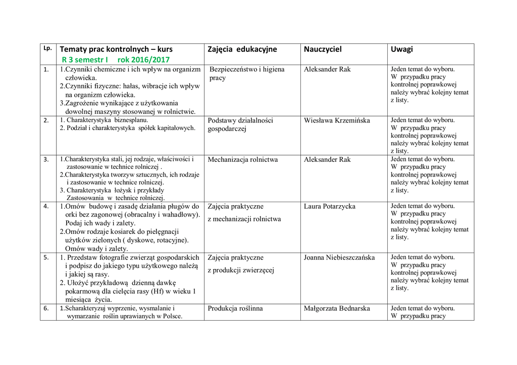 Lp. Tematy prac kontrolnych – kurs R 3 semestr I rok 2016/2017 Zajęcia edukacyjne Nauczyciel Uwagi 1. 1.Czynniki chemiczne i ich wpływ na organizm człowieka. 2.Czynniki fizyczne: hałas, wibracje ich wpływ na organizm człowieka. 3.Zagrożenie wynikające z użytkowania dowolnej maszyny stosowanej w rolnictwie. Bezpieczeństwo i higiena pracy Aleksander Rak Jeden temat do wyboru. W przypadku pracy kontrolnej poprawkowej należy wybrać kolejny temat z listy. 2. 1. Charakterystyka biznesplanu. 2. Podział i charakterystyka spółek kapitałowych. Podstawy działalności gospodarczej Wiesława Krzemińska 3. 1.Charakterystyka stali, jej rodzaje, właściwości i zastosowanie w technice rolniczej . 2.Charakterystyka tworzyw sztucznych, ich rodzaje i zastosowanie w technice rolniczej. 3. Charakterystyka łożysk i przykłady Zastosowania w technice rolniczej. Mechanizacja rolnictwa Aleksander Rak Jeden temat do wyboru. W przypadku pracy kontrolnej poprawkowej należy wybrać kolejny temat z listy. Jeden temat do wyboru. W przypadku pracy kontrolnej poprawkowej należy wybrać kolejny temat z listy. 4. 1.Omów budowę i zasadę działania pługów do orki bez zagonowej (obracalny i wahadłowy). Podaj ich wady i zalety. 2.Omów rodzaje kosiarek do pielęgnacji użytków zielonych ( dyskowe, rotacyjne). Omów wady i zalety. 1. Przedstaw fotografie zwierząt gospodarskich i podpisz do jakiego typu użytkowego należą i jakiej są rasy. 2. Ułożyć przykładową dzienną dawkę pokarmową dla cielęcia rasy (Hf) w wieku 1 miesiąca życia. Zajęcia praktyczne Laura Potarzycka Jeden temat do wyboru. W przypadku pracy kontrolnej poprawkowej należy wybrać kolejny temat z listy. Joanna Niebieszczańska Jeden temat do wyboru. W przypadku pracy kontrolnej poprawkowej należy wybrać kolejny temat z listy. 1.Scharakteryzuj wyprzenie, wysmalanie i wymarzanie roślin uprawianych w Polsce. Produkcja roślinna Małgorzata Bednarska Jeden temat do wyboru. W przypadku pracy 5. 6. z mechanizacji rolnictwa Zajęcia praktyczne z produkcji zwierzęcej 2. Wpływ nawożenia mineralnego i organicznego w produkcji roślinnej. 7. 8. 9. 1. Scharakteryzować klasy bonitacyjne własnego gospodarstwa. 2. Scharakteryzować typy gleb w Polsce. 3. Scharakteryzować objawy niedoborów makroelementów i mikroelementów w uprawach rzepaku, pszenicy, jęczmienia, kukurydzy, ziemniaka, buraka ( proszę wybrać 2 rośliny). 1. Proszę napisać list do działu sprzedaży dostawcy sprzętu rolniczego z prośbą o przesłanie aktualnego cennika części zamiennych oraz podanie kontaktu do autoryzowanego przedstawiciela/dealera bądź serwisu. Proszę zachować formę oficjalnego listu. 2.Proszę przygotować ofertę handlową na potrzeby sieci handlowej produkowanych przez Pana/i gospodarstwo (podając zalety, cenę, warunki płatności itp.) 1. Scharakteryzuj znaki ostrzegawcze. 2. Scharakteryzuj znaki zakazu. 3. Scharakteryzuj skrzyżowania podporządkowane. 4. Scharakteryzuj skrzyżowania równorzędne. kontrolnej poprawkowej należy wybrać kolejny temat z listy. Jeden temat do wyboru. W przypadku pracy kontrolnej poprawkowej należy wybrać kolejny temat z listy. Zajęcia praktyczne z produkcji roślinnej Maciej Mazurek Język obcy w agrobiznesiejęzyk angielski Ryszard Skotnicki Jeden temat do wyboru. W przypadku pracy kontrolnej poprawkowej należy wybrać kolejny temat z listy. Przepisy ruchu drogowego Grzegorz Wójtowicz Jeden temat do wyboru. W przypadku pracy kontrolnej poprawkowej należy wybrać kolejny temat z listy. LISTA TEMATÓW (ZADAŃ) 10. Przedmiot: Produkcja zwierzęca Nauczyciel: Joanna Niebieszczańska 1.Wymienić i opisać poszczególne części ciała na schematach u krowy, konia i świni; 2. Krótko scharakteryzować rolę białek, węglowodanów, tłuszczów, witamin i związków mineralnych w żywieniu zwierząt. Jeden temat do wyboru . W przypadku pracy kontrolnej poprawkowej należy wybrać kolejny temat z listy.