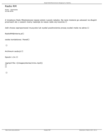 Zespół Szkół Ekonomiczno-Usługowych w Rybniku Radio RM Autor: Agnieszka 22.08.2016. Z inicjatywy Rady Młodzieżowej naszej szkoły ruszyło radyjko. Na razie możecie go usłuszeć na długich przerwach ale z czasem mamy nadzieje że nasze radio się rozwinie. Jeśli chcesz zaproponować muzyczke lub wysłać pozdrowienia proszę wysłać maila na adres: [email protected] osoba kontaktowa: Paweł Archiwum audycji: Spocik 1.3v: {jgmp3 file:=[images/stories/1mix.mp3]} http://www.zseu.pl/strona Kreator PDF Utworzono 2 March, 2017, 22:11