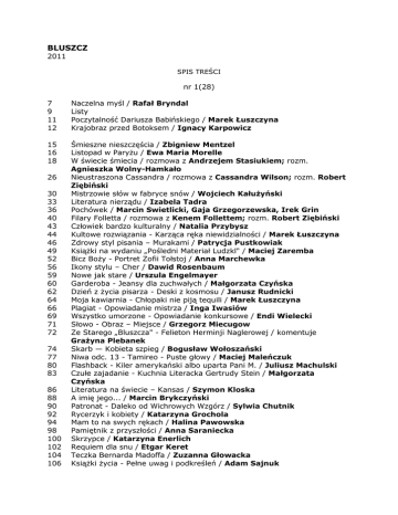 BLUSZCZ 2011 SPIS TREŚCI nr 1(28) 7 9 11 12 Naczelna myśl / Rafał Bryndal Listy Poczytalność Dariusza Babińskiego / Marek Łuszczyna Krajobraz przed Botoksem / Ignacy Karpowicz 15 16 18 Śmieszne nieszczęścia / Zbigniew Mentzel Listopad w ParyŜu / Ewa Maria Morelle W świecie śmiecia / rozmowa z Andrzejem Stasiukiem; rozm. Agnieszka Wolny-Hamkało Nieustraszona Cassandra / rozmowa z Cassandra Wilson; rozm. Robert Ziębiński Mistrzowie słów w fabryce snów / Wojciech KałuŜyński Literatura nierządu / Izabela Tadra Pochówek / Marcin Swietlicki, Gaja Grzegorzewska, Irek Grin Filary Folletta / rozmowa z Kenem Follettem; rozm. Robert Ziębiński Człowiek bardzo kulturalny / Natalia Przybysz Kultowe rozwiązania - Karząca ręka niewidzialności / Marek Łuszczyna Zdrowy styl pisania – Murakami / Patrycja Pustkowiak KsiąŜki na wydaniu „Pośledni Materiał Ludzkl" / Maciej Zaremba Bicz BoŜy - Portret Zofii Tołstoj / Anna Marchewka Ikony stylu – Cher / Dawid Rosenbaum Nowe jak stare / Urszula Engelmayer Garderoba - Jeansy dla zuchwałych / Małgorzata Czyńska Dzień z Ŝycia pisarza - Deski z kosmosu / Janusz Rudnicki Moja kawiarnia - Chłopaki nie piją tequili / Marek Łuszczyna Plagiat - Opowiadanie mistrza / Inga Iwasiów Wszystko umorzone - Opowiadanie konkursowe / Endi Wielecki Słowo - Obraz – Miejsce / Grzegorz Miecugow Ze Starego „Bluszcza" - Felieton Herminji Naglerowej / komentuje GraŜyna Plebanek Skarb — Kobieta szpieg / Bogusław Wołoszański Niwa odc. 13 - Tamireo - Puste głowy / Maciej Maleńczuk Flashback - Kiler amerykański albo uparta Pani M. / Juliusz Machulski Czułe zajadanie - Kuchnia Literacka Gertrudy Stein / Małgorzata Czyńska Literatura na świecie – Kansas / Szymon Kloska A imię jego... / Marcin Brykczyński Patronat - Daleko od Wichrowych Wzgórz / Sylwia Chutnik Rycerzyk i kobiety / Katarzyna Grochola Mam to na swych rękach / Halina Pawowska Pamiętnik z przyszłości / Anna Saraniecka Skrzypce / Katarzyna Enerlich Requiem dla snu / Etgar Keret Teczka Bernarda Madoffa / Zuzanna Głowacka KsiąŜki Ŝycia - Pełne uwag i podkreśleń / Adam Sajnuk 26 30 33 36 40 43 44 46 49 52 56 59 60 62 64 66 69 71 72 74 77 80 83 86 88 90 92 94 98 100 102 104 106 108 112 114 117 120 121 122 124 126 127 128 129 142 143 144 145 146 147 148 Jestem z miasta - Styczniowa czerwień / Dawid Rosenbaum Zielnik literacki / Szymon Kloska, Tomasz Pindel Uzdrowić system / Marek Łuszczyna Dialogi filmowe - Włoch o świcie / Lech Kurpiewski, Robert Ziębiński Rozwierszowanie - Zemsta z zaświatów / Agnieszka Wolny-Hamkało Świąteczny imperatyw, czyli niepotrzebni / Wojciech KrzyŜaniak Nowy rozdział - Los antykwariusza / z Piotrem Jagielskim rozm. Marta Szarejko Sztukateria - Ciało czyta ksiąŜkę / Katarzyna Rój Radujmy się, powiedział błazen / Izabela Szok Instrukcja uŜycia dziecka / Łukasz Drewniak Bajki z Ŝycia wzięte / Roman Kurkiewicz Recenzje. KsiąŜki, filmy, muzyka Półliteratura warszawska / Krzysztof Płyta Cisza po chichocie / Alicja Resich-Modlińska Cytadela BB, czyli Bluszcz bajka / Rafał Bryndal Zapowiedzi Horoskop Chwaściki nr 2(29) 7 9 11 12 14 20 22 27 32 35 36 38 40 42 46 49 50 52 54 56 57 60 62 64 67 69 70 72 75 78 81 84 86 88 94 96 98 100 102 104 108 110 113 116 118 120 Naczelna myśl / Rafał Bryndal Listy Poczytalność Michała Ogórka / Marek Łuszczyna Nieszczelność / Ignacy Karpowicz Ofelia w Olsztynie / rozmowa z Krystyną Janda; rozm. Marta Szarejko, Rafał Bryndal Geniusz w mundurze / Zbigniew Mentzel Wykorzenianie – ReportaŜ / Marek Łuszczyna Zostawiłem Boga w spokoju / rozmowa z Wojciechem Tochmanem; rozm. Marta Szarejko Zjazd / Gaja Grzegorzewska Filmowa przygoda / Ewa Maria Morelle Kultowe słodycze - Gorzki smak bombonierki / Marek Łuszczyna Sara i Hagar, czyli matki rywalizują / Bella Szwarcman-Czarnota Włóczykij - Choinka w buszu / Andrzej Meller KsiąŜki na wydaniu – Saturn / Jacek Dehnel Ikony stylu – Sade / Dawid Rosenbaum Władza niespodzianki / Urszula Engelmayer Garderoba - Bestiariusz Manolo Blahnika / Małgorzata Czyńska Moja kawiarnia - Strzały na dancingu / Marek Łuszczyna Madam Bator Fly - Wróć, Godzillo / Joanna Bator Człowiek bardzo kulturalny / Katarzyna Pakosińska Literatura pijaństwa / Izabela Tadra Dzień z Ŝycia pisarza - Pudełko z treścią Ŝycia / Anna Bolecka Chodź, opowiedz mi bajeczkę / Agnieszka Wolny-Hamkało Czeski przyjaciel - Opowiadanie mistrza / Daniel Odija Światło z naprzeciwka - Opowiadanie konkursowe / Marcin Gryglik Słowo - Obraz – Miejsce / Rafał Rutkowski Ze Starego „Bluszcza" - Felieton Natalii Jastrzebskiej / komentuje Krystyna Kofta La Payita - Kobieta szpieg / Bogusław Wołoszański Niwa odc. 14 - Stanisław Kaper / Maciej Maleńczuk Flashback - Kino moralnie niespokojne / Juliusz Machulski Piwem namaszczony - Kuchnia Literacka Bohumila Hrabala / Małgorzata Czyńska Fizylierka / Stanisław Ledóchowski Kaprys / Katarzyna Grochola U trzech olbrzymów / Halina Pawlowska Taryfa ulgowa / Anna Saraniecka Makowa panienka / Katarzyna Enerlich Zobaczyć jaszczurkę / Etgar Keret Krótka definicja szaleństwa / Zuzanna Głowacka Podstawowy instynkt / Natalia Iwanowa Jestem z miasta — Luty na zielono / Dawid Rosenbaum Zielnik literacki / Szymon Kloska, Tomasz PIndel Niekulturalne zachowanie - Tajemnice poliszynela / Marek Łuszczyna Dialogi filmowe / Lech Kurpiewski, Robert Ziębiński Literacki atlas świata – Tanger / Szymon Kloska Pręgierz literacki – Tombak / Cyprian Brukowski Rozwierszowanie - Gęsia skórka / Agnieszka Wolny-Hamkało 121 123 124 140 142 143 144 145 146 147 148 Za długi felieton / Łukasz Drewniak Sformatowany brak pomysłów / Wojciech KrzyŜaniak Recenzja ksiąŜki, filmy, komiksy, muzyka Konkurs par skocznych / Alicja Resich-Modlińska Cytadela Konkurs - Teoria pięciu palców Klancyk - Teatr improwizowany BB, czyli Bluszcz bajka Zapowiedzi Horoskop Chwaściki nr 3(30) 5 8 9 10 12 18 20 22 26 