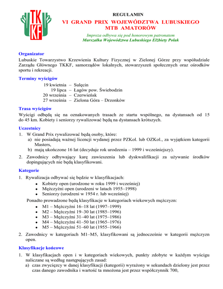 REGULAMIN VI GRAND PRIX WOJEWÓDZTWA LUBUSKIEGO MTB AMATORÓW Impreza odbywa się pod honorowym patronatem Marszałka Województwa Lubuskiego Elżbiety Polak Organizator Lubuskie Towarzystwo Krzewienia Kultury Fizycznej w Zielonej Górze przy współudziale Zarządu Głównego TKKF, samorządów lokalnych, stowarzyszeń społecznych oraz ośrodków sportu i rekreacji. Terminy wyścigów 19 kwietnia 19 lipca 20 września 27 września – – – – Sulęcin Łagów pow. Świebodzin Czerwieńsk Zielona Góra – Drzonków Trasa wyścigów Wyścigi odbędą się na oznakowanych trasach ze startu wspólnego, na dystansach od 15 do 45 km. Kobiety i seniorzy rywalizować będą na dystansach krótszych. Uczestnicy 1. W Grand Prix rywalizować będą osoby, które: a) nie posiadają ważnej licencji wydanej przez PZKol. lub OZKol., za wyjątkiem kategorii Masters, b) mają ukończone 16 lat (decyduje rok urodzenia – 1999 i wcześniejszy). 2. Zawodnicy odbywający karę zawieszenia lub dyskwalifikacji za używanie środków dopingujących nie będą klasyfikowani. Kategorie 1. Rywalizacja odbywać się będzie w klasyfikacjach: Kobiety open (urodzone w roku 1999 i wcześniej) Mężczyźni open (urodzeni w latach 1955–1998) Seniorzy (urodzeni w 1954 r. lub wcześniej) Ponadto prowadzone będą klasyfikacje w kategoriach wiekowych mężczyzn: M1 – Mężczyźni 16–18 lat (1997–1999) M2 – Mężczyźni 19–30 lat (1985–1996) M3 – Mężczyźni 31–40 lat (1975–1986) M4 – Mężczyźni 41–50 lat (1965–1976) M5 – Mężczyźni 51–60 lat (1955–1966) 2. Zawodnicy w kategoriach M1–M5, klasyfikowani są jednocześnie w kategorii mężczyzn open. Klasyfikacje końcowe 1. W klasyfikacjach open i w kategoriach wiekowych, punkty zdobyte w każdym wyścigu naliczane są według następujących zasad: a) czas zwycięzcy w danej klasyfikacji (kategorii) wyrażony w sekundach dzielony jest przez czas danego zawodnika i wartość ta mnożona jest przez współczynnik 700, b) pierwszych trzydziestu zawodników w klasyfikacji mężczyzn open otrzymuje dodatkowe punkty: 1 – 100 pkt, 2 – 80 pkt, 3 – 60 pkt, 4 –55 pkt, 5 – 50 pkt, 6 – 45 pkt, 7 – 42 pkt, 8 – 39 pkt, 9 – 36 pkt, 10 – 33 pkt, 11 – 30 pkt, 12 – 28 pkt, 13 – 26 pkt, 14 –24 pkt, 15 – 22 pkt 16 – 20 pkt, 17 – 18, 18 – 16 pkt, 19 – 14 pkt, 20 – 12 pkt, 21 – 10 pkt, 22 – 9 pkt, 23 – 8 pkt, 24 – 7 pkt, 25 – 6 pkt, 26 – 5 pkt, 27 – 4 pkt, 28 – 3 pkt, 29 – 2 pkt, 30 – 1 pkt. c) pierwszych piętnastu zawodników klasyfikacji kobiet open, seniorów oraz w kategoriach wiekowych M1–M5 otrzymuje dodatkowe punkty: 1 – 100 pkt, 2 – 80 pkt, 3 – 60 pkt, 4 –50 pkt, 5 – 40 pkt, 6 – 35 pkt, 7 – 30 pkt, 8 – 26 pkt, 9 – 22 pkt, 10 – 18 pkt, 11 – 15 pkt, 12 – 12 pkt, 13 – 9 pkt, 14 –6 pkt, 15 – 3 pkt. d) zawodnik, który wystartuje ale nie dotrze do mety otrzymuje 210 punktów. 2. Zwycięzcą Grand Prix i tym samym amatorskim mistrzem MTB województwa lubuskiego zostanie zawodnik, który w przekroju całego sezonu zgromadzi najwięcej punktów w trzech najlepszych startach. Nagrody Po zakończeniu cyklu, trzech pierwszych zawodników w każdej kategorii otrzyma puchary (statuetki), a sześciu pierwszych zawodników dyplomy. Kary 1. W przypadku naruszenia zasad fair play, na wniosek organizatora wyścigu zawodnik może być ukarany przez organizatora GP: – utratą 210 pkt., – utratą 700 pkt., – wykluczeniem z cyklu GP. 2. Jeśli decyzja o dyskwalifikacji zapadnie po zakończeniu cyklu, nie przewiduje się odbierania pucharów (statuetek), medali i dyplomów oraz zmiany punktacji innych zawodników. Postanowienia końcowe 1. Poszczególne wyścigi przeprowadzone zostaną w oparciu o regulaminy opracowane przez bezpośrednich organizatorów. 2. Klasyfikacje GP będą prowadzone przez Biuro Lubuskiego TKKF na podstawie komunikatów końcowych uzyskanych od organizatorów wyścigów. 3. Aktualne wyniki GP będą publikowane na stronie internetowej www.tkkf.zgora.pl.