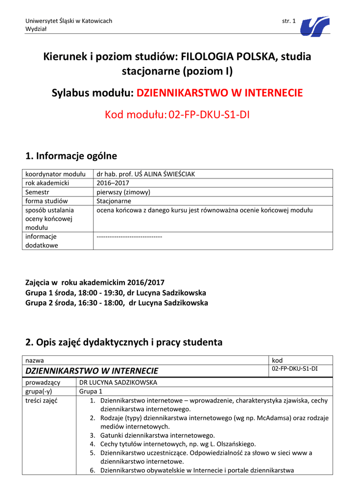 Uniwersytet Śląski w Katowicach Wydział str. 1 Kierunek i poziom studiów: FILOLOGIA POLSKA, studia stacjonarne (poziom I) Sylabus modułu: DZIENNIKARSTWO W INTERNECIE Kod modułu: 02-FP-DKU-S1-DI 1. Informacje ogólne koordynator modułu rok akademicki Semestr forma studiów sposób ustalania oceny końcowej modułu informacje dodatkowe dr hab. prof. UŚ ALINA ŚWIEŚCIAK 2016–2017 pierwszy (zimowy) Stacjonarne ocena końcowa z danego kursu jest równoważna ocenie końcowej modułu ------------------------------ Zajęcia w roku akademickim 2016/2017 Grupa 1 środa, 18:00 - 19:30, dr Lucyna Sadzikowska Grupa 2 środa, 16:30 - 18:00, dr Lucyna Sadzikowska 2. Opis zajęć dydaktycznych i pracy studenta nazwa kod DZIENNIKARSTWO W INTERNECIE 02-FP-DKU-S1-DI prowadzący grupa(-y) treści zajęć DR LUCYNA SADZIKOWSKA Grupa 1 1. Dziennikarstwo internetowe – wprowadzenie, charakterystyka zjawiska, cechy dziennikarstwa internetowego. 2. Rodzaje (typy) dziennikarstwa internetowego (wg np. McAdamsa) oraz rodzaje mediów internetowych. 3. Gatunki dziennikarstwa internetowego. 4. Cechy tytułów internetowych, np. wg L. Olszańskiego. 5. Dziennikarstwo uczestniczące. Odpowiedzialność za słowo w sieci www a dziennikarstwo internetowe. 6. Dziennikarstwo obywatelskie w Internecie i portale dziennikarstwa Uniwersytet Śląski w Katowicach Wydział str. 2 obywatelskiego. 7. Portal internetowy jako nowe medium. Największe polskie portale internetowe – budowa i historia portali. 8. Blogi dziennikarskie i publicystyka w Internecie. 9. Newslatter, flash, news – warsztat. 10. Największe polskie wortale polityczne – fachowe dziennikarstwo polityczne w sieci. 11. Warsztaty tworzenia i redagowania materiałów w portalach, np. tekstów informacyjnych. 12. Tworzenie materiałów publicystycznych (komentarz). 13. Dziennikarstwo internetowe a niebezpieczeństwo dezinformacji, anonimowości. 14. Udział użytkowników w powstawaniu portali internetowych. Publikacje komentarzy. metody prowadzenia zajęć liczba godzin dydaktycznych (kontaktowych) liczba godzin pracy własnej studenta opis pracy własnej studenta organizacja zajęć literatura obowiązkowa literatura uzupełniająca adres strony Ćwiczenia 30 60 Przygotowanie do zajęć; napisanie relacji z wybranego, aktualnego wydarzenia społecznego, kulturalnego, politycznego itp. Kurs obejmuje zajęcia o charakterze ćwiczeniowym. L. Olszański, Dziennikarstwo internetowe, Warszawa 2006. L. Olszański, Media i dziennikarstwo internetowe, Warszawa 2012. J. Grzenia, Komunikacja językowa w Internecie, Warszawa 2007. Dziennikarstwo internetowe: teoria i praktyka, red. G. Habrajska, J. Mikosz, Łódź 2010. Gatunki i formaty we współczesnych mediach, red. W. Godzic, A. Kozieł, J. SzylkoKwas, Warszawa 2015. S. Alllan, Newsy w sieci, Kraków 2008. Media i społeczeństwo, red. M. Sokołowski, Toruń 2008. Z. Bauer, Dziennikarstwo wobec nowych mediów: historia, teoria, praktyka, Kraków 2009. Internetowe gatunki dziennikarskie, red. K. Wolny-Zmorzyński, W. Furman, Warszawa 2010. S. Allan, Kultura newsów, Kraków 2006. Słownik wiedzy o mediach, red. E. Chudziński, Warszawa–Bielsko-Biała 2007. Z. Bauer, Dziennikarstwo i świat mediów. Nowa edycja, Kraków 2008. Słownik terminologii medialnej, red. W. Pisarek, Kraków 2006. Współczesny dziennikarz i nadawca, red. M. Gierula, Sosnowiec 2006. Uniwersytet Śląski w Katowicach Wydział str. 3 www zajęć informacje dodatkowe 3. Opis sposobów weryfikacji efektów kształcenia modułu Nazwa kod DZIENNIKARSTWO W INTERNECIE 02-FP-DKU-S1-DI kod zajęć osoba przeprowadzająca weryfikację Grupa wymagania merytoryczne kryteria oceny przebieg procesu weryfikacji informacje dodatkowe 02-FP-DKU-S1-DI DR LUCYNA SADZIKOWSKA Grupa 1 Student wie, na czym polega specyfika dziennikarstwa internetowego i jakie są typowe dla niego środki przekazu; zna cechy i rodzaje dziennikarstwa internetowego, mediów internetowych, gatunki dziennikarstwa internetowego, cechy tytułów internetowych; wie, czym jest dziennikarstwo uczestniczące. Zaliczenie pisemnej relacji (artykułu, recenzji, itp.) nt. aktualnego wydarzenia społecznego, politycznego, kulturalnego itd. oraz zaliczenie na podstawie przygotowania i udziału w ćwiczeniach. Praca pisemna musi zostać złożona do 31 grudnia 2016 roku. Końcowa ocena z kursu zostanie wystawiona na ostatnich zajęciach. 2. Opis zajęć dydaktycznych i pracy studenta nazwa kod DZIENNIKARSTWO W INTERNECIE 02-FP-DKU-S1-DI prowadzący grupa(-y) treści zajęć DR LUCYNA SADZIKOWSKA Grupa 2 15. Dziennikarstwo internetowe – wprowadzenie, charakterystyka zjawiska, cechy dziennikarstwa internetowego. 16. Rodzaje (typy) dziennikarstwa internetowego (wg np. McAdamsa) oraz rodzaje mediów internetowych. 17. Gatunki dziennikarstwa internetowego. 18. Cechy tytułów internetowych, np. wg L. Olszańskiego. 19. Dziennikarstwo uczestniczące. Odpowiedzialność za słowo w sieci www a dziennikarstwo internetowe. 20. Dziennikarstwo obywatelskie w Internecie i portale dziennikarstwa obywatelskiego. 21. Portal internetowy jako nowe medium. Największe polskie portale internetowe – budowa i historia portali. Uniwersytet Śląski w Katowicach Wydział str. 4 22. Blogi dziennikarskie i publicystyka w Internecie. 23. Newslatter, flash, news – warsztat. 24. Największe polskie wortale polityczne – fachowe dziennikarstwo polityczne w sieci. 25. Warsztaty tworzenia i redagowania materiałów w portalach, np. tekstów informacyjnych. 26. Tworzenie materiałów publicystycznych (komentarz). 27. Dziennikarstwo internetowe a niebezpieczeństwo dezinformacji, anonimowości. 28. Udział użytkowników w powstawaniu portali internetowych. Publikacje komentarzy. metody prowadzenia zajęć liczba godzin dydaktycznych (kontaktowych) liczba godzin pracy własnej studenta opis pracy własnej studenta organizacja zajęć literatura obowiązkowa literatura uzupełniająca adres strony www zajęć inform