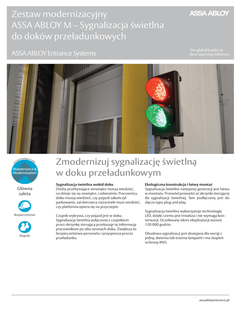 Zestaw modernizacyjny ASSA ABLOY M – Sygnalizacja świetlna do doków przeładunkowych ASSA ABLOY Entrance Systems Zmodernizuj sygnalizację świetlną w doku przeładunkowym Główna zaleta Bezpieczeństwo Wygoda Sygnalizacja świetlna wokół doku Osoby przebywające wewnątrz muszą wiedzieć, co dzieje się na zewnątrz, i odwrotnie. Pracownicy doku muszą wiedzieć, czy pojazd zakończył parkowanie, zaś kierowca ciężarówki musi wiedzieć, czy platforma opiera się na przyczepie. Czujnik wykrywa, czy pojazd jest w doku. Sygnalizacja świetlna połączona z czujnikiem przez skrzynkę sterującą przekazuje tę informację pracownikom po obu stronach doku. Zwiększa to bezpieczeństwo personelu i przyspiesza proces przeładunku. Ekologiczna konstrukcja i łatwy montaż Sygnalizacja świetlna następnej generacji jest łatwa w montażu. Przewód prowadzi ze skrzynki sterującej do sygnalizacji świetlnej. Tam podłączony jest do złącza typu plug and play. Sygnalizacja świetlna wykorzystuje technologię LED, dzięki czemu jest trwalsza i nie wymaga konserwacji. Oczekiwany okres eksploatacji wynosi 120 000 godzin. Obudowa sygnalizacji jest dostępna dla wersji z jedną, dwiema lub trzema lampami i ma stopień ochrony IP65. assaabloyentrance.pl Przegląd Zalety Pusty dok Jeżeli dok przeładunkowy jest pusty, na zewnątrz świeci się zielone światło. Podstawka klinowa pod koła Natychmiast po umieszczeniu podstawki klinowej pod kołem ciężarówki, włączy się czerwone światło na zewnątrz, sygnalizujące kierowcy, żeby nie zmieniać położenia pojazdu. Wewnątrz zapali się światło zielone, informujące pracowników doku, że pojazd zakończył dokowanie. Po usunięciu podstawki klinowej kolory świateł zmieniają się. Nazwa Typ Uwagi Światło zielone LED, 230 V Tylko zielone światło sygnalizacyjne Często używane wewnątrz budynku, informuje, że w doku przeładunkowym trwa praca Światło żółte LED, 230 V Tylko żółte światło sygnalizacyjne Często używane wewnątrz budynku, informuje, że doku przeładunkowego nie można używać Światło czerwone LED, 230 V Tylko czerwone światło sygnalizacyjne Często używane wewnątrz budynku, informuje, że doku przeładunkowego nie można używać Światło zielone i czerwone LED, 230 V Zielone i czerwone światło sygnalizacyjne w jednej obudowie Zazwyczaj montowane na zewnątrz dla kierowcy ciężarówki Światło zielone, żółte i czerwone LED, 230 V Do Crawford Eye Instalowane na zewnątrz jako pomoc dla kierowcy podczas parkowania ciężarówki Światło zielone LED, 24V Tylko zielone światło sygnalizacyjne Często używane wewnątrz budynku, informuje, że w doku przeładunkowym trwa praca Światło żółte LED, 24V Tylko żółte światło sygnalizacyjne Często używane wewnątrz budynku, informuje, że doku przeładunkowego nie można używać Światło czerwone LED, 24V Tylko czerwone światło sygnalizacyjne Często używane wewnątrz budynku, informuje, że doku przeładunkowego nie można używać Światło zielone i czerwone LED, 24V Zielone i czerwone światło sygnalizacyjne w jednej obudowie Zazwyczaj montowane na zewnątrz dla kierowcy ciężarówki Światło zielone, żółte i czerwone LED, 24V Do Crawford Eye Instalowane na zewnątrz jako pomoc dla kierowcy podczas parkowania ciężarówki Główne zalety: ■■ Bezpieczeństwo wokół bramy ■■ Ekologiczna technologia LED ■■ Zapobiega niepotrzebnemu otwieraniu bramy ASSA ABLOY Entrance Systems [email protected] assaabloyentrance.pl ASSA ABLOY, Besam, Crawford, Megadoor i Albany, jako słowa i logotypy, to przykłady znaków towarowych będących własnością ASSA ABLOY Entrance Systems lub firm należących do ASSA ABLOY Group. PL/MOM.TLD/1506 Dostępne zestawy ASSA ABLOY M – Sygnalizacja świetlna dla doków przeładunkowych Pomoc przy parkowaniu W połączeniu z Crawford Eye, sygnalizacja świetlna zielony – żółty – czerwony wskazuje odległość pojazdu od budynku. W miarę zbliżania się ciężarówki, światła zmieniają się z zielonego na żółte, a następnie czerwone. © ASSA ABLOY Entrance Systems AB Obecność ciężarówki, światło zielone lub czerwone wewnątrz Fotokomórka wykrywa obecność pojazdu w doku przeładunkowym. Wewnątrz zapala się zielona lampa albo gaśnie czerwona/żółta (wybór klienta).