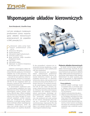 Wspomaganie układów kierowniczych Marek Matejkowski, Schaeffler Group LuK jest wiodącym światowym producentem pomp wspomagania układów kierowniczych przeznaczonych do pojazdów o DMC powyżej 3,5 t. • • • • • • • • Zadaniem wspomagania układu kierowniczego jest umożliwienie kierowcy zmiany kierunku jazdy przy minimalnym nakładzie siły na koło kierownicy. Ustawodawca zaleca tzw. lekkość kierowania – warunek ten jest spełniony, kiedy moment obrotowy, zmierzony na zewnętrznej krawędzi kierownicy, nie przekracza 250 Nm. W celu osiągnięcia takich parametrów, konieczne jest zastosowanie wysokociśnieniowej pompy. W samochodach użytkowych pompa wspomagania napędzana jest przez układ pasowy silnika. Hydrauliczny układ wspomagania zawiera: pompę ciśnieniową, zbiornik oleju z filtrem, przekładnię mechaniczną i hydrauliczną, cylinder roboczy oraz zawór sterujący. W nowoczesnych pojazdach, pompa wspomagania jest zintegrowana ze sprężarką powietrza, co pozwala uniknąć zastosowania osobnego układu napędzającego. Przekładnia mechaniczna, zawór sterujący oraz cylinder roboczy są na ogół zamontowane we wspólnej obudowie. 46 fot.: LuK P odstawowe zalety pomp łopatkowych produkowanych przez LuK to: ciśnienie do 180 barów, wysoka sprawność, niski poziom drgań hydraulicznych, minimalny pobór mocy, długa żywotność, dzięki niewielkim obciążeniom łożysk, mały ciężar, niski poziom hałasu, odporność na zmienne temperatury od -40°C do +135°C. W obu przypadkach, wskazane jest zastosowanie pompy łopatkowej, z uwagi na jej równomierny i stały wydatek przez cały okres eksploatacji. Układ kierowniczy jest napędzany olejem hydraulicznym podawanym przez pompę łopatkową. Podczas obracania kierownicą otwiera się zawór przekładni kierowniczej i w zależności od kierunku obrotu, olej wywiera nacisk na lewą lub prawą stronę tłoczka w cylindrze roboczym. W rezultacie powstaje siła wspomagająca skręcanie przednich kół. W tym czasie ciśnienie wewnątrz układu kierowniczego dochodzi do 100 barów. Na krótko przed skrajnym wychyleniem kół następuje otwarcie zaworu granicznego, powodując odprowadzenie oleju i redukcję ciśnienia. Przy neutralnym położeniu kierownicy, olej podawany jest przez pompę do tzw. zaworu sterującego, który kieruje go z powrotem do zbiorniczka wyrównawczego. Stąd poprzez filtr, olej spływa bezpośrednio do pompy, zamykając w ten sposób obwód w układzie wspomagania hydraulicznego. Płukanie układów kierowniczych Na skutek mechanicznego obciążenia układu kierowniczego dochodzi do jego zanieczyszczenia mikroopiłkami. Z tej przyczyny konieczne jest gruntowne płukanie całego układu przed zamontowaniem nowej pompy wspomagania. Wiele układów kierowniczych ma zawór spustowy, jednakże nie gwarantuje on odprowadzenia całej zawartości płynu hydraulicznego. Proces płukania: 1. podnieść pojazd uwalniając nacisk na przednie koła, co zmniejszy opór w układzie kierowniczym zapobiegając pienieniu się płynu i pojawianiu się powietrza, 2. odkręcić pokrywę zbiornika płynu, 3. odłączyć przewód powrotny z pompy; wyciekający olej zebrać do osobnego pojemnika, zapobiegając jego przedostaniu się do środowiska, 4. uruchomić silnik; obracać kołem kierownicy w lewo i prawo; wyciekający olej zebrać do osobnego pojemnika; uzupełniać olej w zbiorniku wyrównawczym, 6/2009 5. po dwukrotnym płukaniu wyłączyć silnik; zdemontować zbiorniczek wyrównawczy i wymyć go dokładnie płynem do czyszczenia hamulców; filtr ze zbiornika dokładnie wymyć lub wymienić na nowy, 6. zamontować zbiorniczek wyrównawczy oraz przewód powrotny, zwracając uwagę na ich właściwe ułożenie, 7. napełnić zbiorniczek i uruchomić silnik, 8. odpowietrzyć układ przez przekręcanie kołem kierownicy 20 razy w lewo i prawo, 9. zamknąć zbiorniczek wyrównawczy, sprawdzić czy poziom oleju nie spadł poniżej stanu minimalnego, 10. opuścić pojazd, 11. przeprowadzić jazdę próbną. Ważna wskazówka Stosować wyłącznie płyny hydrauliczne zgodne ze specyfikacją producenta pojazdu, opisane w instrukcji użytkownika. rys. M. Zając 14 • zdemontować • • • 1 pasek oraz wszystkie urządzenia i elementy konieczne do odkręcenia pompy, w razie konieczności podnieść samochód na podnośniku, odłączyć przewody hydrauliczne od pompy – wyciekający olej odprowadzić do przygotowanego wcześniej zbiorniczka, odkręcić śruby mocujące i zdemontować pompę. Montaż pompy wspomagania • montaż pompy przebiega w odwrotnej kolejności do demontażu, ne połączenie wszystkich przewodów hydraulicznych, a w razie konieczności wymienić uszczelnienia, wypełnić układ kierowniczy właściwym olejem hydraulicznym (zgodnie ze specyfikacją producenta pojazdu) i przeprowadzić jego odpowietrzanie. Uwaga! Płyn z układu nie może przedostać się do środowiska naturalnego. Należy go odprowadzić tylko poprzez firmy dystrybuujące materiały smarne i oleje lub do punktu skupu odpadów niebezpiecznych. wej, smarowanej olejem hydraulicznym. Elementy te oddzielone są od siebie dwustronnym pierścieniem uszczelniającym. Dzięki temu, że ciśnienie wytwarzane przez pompę działa także na zewnętrzną stroną prawej płytki oporowej, pompa zachowuje doskonałą szczelność podczas pracy. W wyniku działania siły odśrodkowej, łopatki osadzone w wirniku przesuwają się na zewnątrz i są dociskane do eliptycz- nej powierzchni roboczej statora. W ten sposób pomiędzy każdą parą sąsiednich łopatek powstaje przestrzeń robocza o zmiennej objętości. W kierunku wzdłużnym przestrzeń ta jest ograniczona płytkami oporowymi. W ciągu jednego obrotu wałka objętość każdej przestrzeni roboczej zmienia się dwukrotnie. Ze względu na eliptyczny kształt statora w pierwszym etapie następuje wzrost objętości przestrzeni roboczej, wskutek czego wytwarza się pod