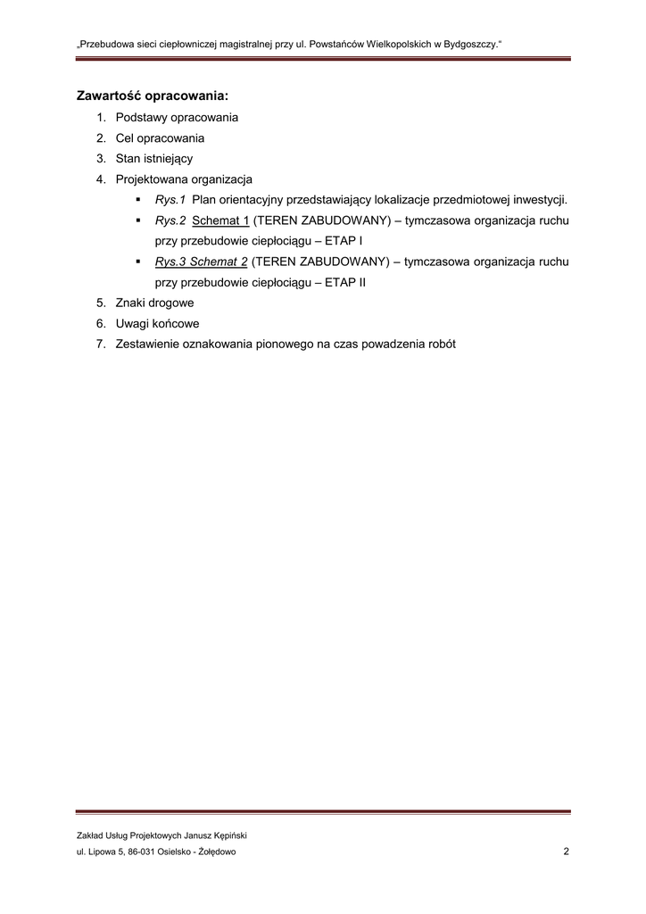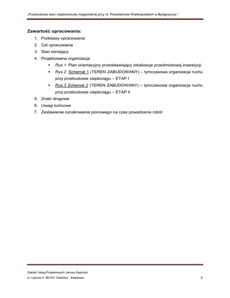 „Przebudowa sieci ciepłowniczej magistralnej przy ul. Powstańców Wielkopolskich w Bydgoszczy.“ Zawartość opracowania: 1. Podstawy opracowania 2. Cel opracowania 3. Stan istniejący 4. Projektowana organizacja Rys.1 Plan orientacyjny przedstawiający lokalizacje przedmiotowej inwestycji. Rys.2 Schemat 1 (TEREN ZABUDOWANY) – tymczasowa organizacja ruchu przy przebudowie ciepłociągu – ETAP I Rys.3 Schemat 2 (TEREN ZABUDOWANY) – tymczasowa organizacja ruchu przy przebudowie ciepłociągu – ETAP II 5. Znaki drogowe 6. Uwagi końcowe 7. Zestawienie oznakowania pionowego na czas powadzenia robót Zakład Usług Projektowych Janusz Kępiński ul. Lipowa 5, 86-031 Osielsko - Żołędowo 2 „Przebudowa sieci ciepłowniczej magistralnej przy ul. Powstańców Wielkopolskich w Bydgoszczy.“ Opis techniczny 1. Podstawa opracowania Ustawa z dnia 20 czerwca 1997 r. Prawo o ruchu drogowym (tekst jednolity Dz. U. z 2005 r. nr 108) Rozporządzenie Ministrów Infrastruktury oraz Spraw Wewnętrznych i Administracji z dnia 31 lipca 2002 r. w sprawie znaków i sygnałów drogowych (Dz. U. z 2002 r nr 170 poz. 1393) Rozporządzenie Ministra Infrastruktury z dnia 23 września 2003 r w sprawie szczegółowych warunków zarządzania ruchem na drogach oraz wykonywania nadzoru nad tym zarządzaniem (Dz. U. z 2003 r. nr 177 poz. 1729) Szczegółowe warunki techniczne dla znaków i sygnałów drogowych oraz urządzeń bezpieczeństwa ruchu drogowego i warunków ich umieszczania na drogach (załączniki 1- 4 do rozporządzenia Ministra Infrastruktury z dnia 3 lipca 2003 r. Dz. U. z 2003 r. nr 220 poz. 2181) Projekt budowlany: „Przebudowa sieci ciepłowniczej magistralnej przy ul. Powstańców Wielkopolskich w Bydgoszczy. 2. Cel opracowania Celem niniejszego opracowania jest wskazanie sposobu oznakowania umożliwiającego poprawne technicznie przeprowadzenie robót związanych z przebudową sieci ciepłowniczej magistralnej przy ul. Powstańców Wielkopolskich w Bydgoszczy w obrębie działek 14/1, 16/1, 18/1, 25/6 obręb 168. 3. Stan istniejący Rozpatrywana inwestycja położona jest na terenie miasta Bydgoszcz, powiat bydgoski, województwo kujawsko-pomorskie. Przedmiotem opracowania jest projekt tymczasowej organizacji ruchu dla projektu pn. „Przebudowa sieci ciepłowniczej magistralnej przy ul. Powstańców Wielkopolskich w obrębie działek 14/1, 16/1, 18/1, 25/6 obręb 168. Przebudowa sieci ciepłowniczej będzie polegać na: Zakład Usług Projektowych Janusz Kępiński ul. Lipowa 5, 86-031 Osielsko - Żołędowo 3 „Przebudowa sieci ciepłowniczej magistralnej przy ul. Powstańców Wielkopolskich w Bydgoszczy.“ 1) Demontażu istniejącej sieci 2x Dn 300 ułożonej w technologii tradycyjnej (kanał łupinowy) na odcinku od komory K-3/32 do komory K-615, a następnie ułożenie po tej samej trasie nowej sieci ciepłowniczej z rur preizolowanych. Demontażowi ulegnie również komora K-615. cieplna będzieprowadzona podziemnie z zastosowaniem technologii preizolowanej, bezkanałowej. Po demontażu kanałów oraz rurociągów sieci na dnie wykopów zostanie wykonana zagęszczona podsypka z piasku gr. 10 cm, na której zostaną ułożone projektowane rurociągi. Ulica Powstańców Wielkopolskich na przedmiotowym odcinku ma nawierzchnię bitumiczną, jezdnia jest w stanie dobrym, bez większych nierówności, spękań, czy łat. Po obu stronach ulicy występują liczne zabudowania wielorodzinne. Na rozpatrywanym odcinku po obu stronach występują chodniki, zatoki autobusowe oraz po jednej ze stron zatoki postojowe wyznaczone przy zabudowie wielorodzinnej. Odwodnienie jezdni jest do istniejących wpustów ulicznych i kanalizacji deszczowej. 4. Projektowana organizacja ruchu. Rys.2 schemat 1: Obejmuje odcinek ulicy Powstańców Wielkopolskich od działki 14/1 do działki 25/6, czyli w pobliżu skrzyżowania z ulicą Ogińskiego. Projektuje się całkowite wydzielenie strefy bezpieczeństwa wzdłuż przebudowywanej sieci ciepłowniczej na całym odcinku. Stosuje się zapory drogowe U-20b. W celu zapewnienia pełnej obsługi komunikacji publicznej zlokalizowano tymczasowy przystanek autobusowy w pobliżu ul. Niemcewicza. Natomiast przystanek istniejący przy skrzyżowaniu ul. Powstańców Wielkopolskich - ul. Ogińskiego na czas prowadzenia robót pierwszego etapu zostanie usunięty. W celu zapewnienia odpowiedniego poziomu bezpieczeństwa. Przewiduje się, że przedmiotowy etap będzie wykonany w okresie 3 -4 tygodni. Rys. 3 schemat 2: Obejmuje odcinek ulicy Powstańców Wielkopolskich w odległości ok. 90 metrów od skrzyżowania Powstańców Wielkopolskich – Ogińskiego, w kierunku ul. Niemcewicza. Etap 2 zakłada możliwość korzystania z istniejącej zatoki autobusowej. W związku z tym nie przewiduje się dyslokacji przystanku. Projektuje się całkowite wydzielenie strefy bezpieczeństwa wzdłuż przebudowywanej sieci ciepłowniczej na w/w odcinku. Stosuje się zapory drogowe U-20b. Zakład Usług Projektowych Janusz Kępiński ul. Lipowa 5, 86-031 Osielsko - Żołędowo 4 „Przebudowa sieci ciepłowniczej magistralnej przy ul. Powstańców Wielkopolskich w Bydgoszczy.“ 5. Znaki drogowe 5.1 Oznakowanie pionowe. Projektowane oznakowanie pionowe należy wykonać znakami o grupę wielkości większymi od istniejących (tj. znakami średnimi): - znaki ostrzegawcze (trójkąt) - o boku 900 mm - znaki zakazu i nakazu (okrągłe) - o średnicy 800 mm - znaki informacyjne – długość podstawy 600+150 mm - tablice uzupełniające - wymiarowane indywidualnie Wszystkie znaki należy wykonać z foli odblaskowej II generacji na podkładach z blachy stalowej. Znaki ustawiane na poboczu ziemnym należy wkopać i zastabilizować , natomiast znaki umieszczane na jezdni należy ustawiać na podstawach gumowych. Wysokość umieszczania znaków minimum 2,2 m nad poziomem terenu, o ile szczegółowe warunki techniczne nie stanowią inaczej. 5.2 Oznakowanie poziome. Nie przewiduje się zastosowani