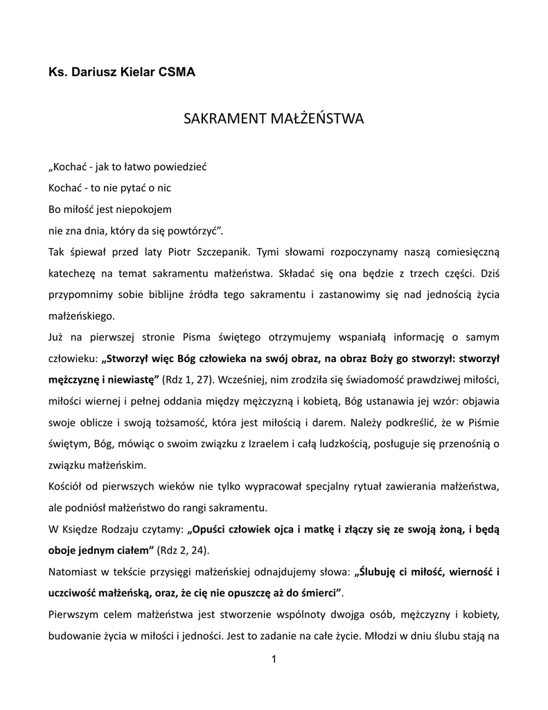 Ks. Dariusz Kielar CSMA SAKRAMENT MAŁŻEŃSTWA „Kochać - jak to łatwo powiedzieć Kochać - to nie pytać o nic Bo miłość jest niepokojem nie zna dnia, który da się powtórzyć”. Tak śpiewał przed laty Piotr Szczepanik. Tymi słowami rozpoczynamy naszą comiesięczną katechezę na temat sakramentu małżeństwa. Składać się ona będzie z trzech części. Dziś przypomnimy sobie biblijne źródła tego sakramentu i zastanowimy się nad jednością życia małżeńskiego. Już na pierwszej stronie Pisma świętego otrzymujemy wspaniałą informację o samym człowieku: „Stworzył więc Bóg człowieka na swój obraz, na obraz Boży go stworzył: stworzył mężczyznę i niewiastę” (Rdz 1, 27). Wcześniej, nim zrodziła się świadomość prawdziwej miłości, miłości wiernej i pełnej oddania między mężczyzną i kobietą, Bóg ustanawia jej wzór: objawia swoje oblicze i swoją tożsamość, która jest miłością i darem. Należy podkreślić, że w Piśmie świętym, Bóg, mówiąc o swoim związku z Izraelem i całą ludzkością, posługuje się przenośnią o związku małżeńskim. Kościół od pierwszych wieków nie tylko wypracował specjalny rytuał zawierania małżeństwa, ale podniósł małżeństwo do rangi sakramentu. W Księdze Rodzaju czytamy: „Opuści człowiek ojca i matkę i złączy się ze swoją żoną, i będą oboje jednym ciałem” (Rdz 2, 24). Natomiast w tekście przysięgi małżeńskiej odnajdujemy słowa: „Ślubuję ci miłość, wierność i uczciwość małżeńską, oraz, że cię nie opuszczę aż do śmierci”. Pierwszym celem małżeństwa jest stworzenie wspólnoty dwojga osób, mężczyzny i kobiety, budowanie życia w miłości i jedności. Jest to zadanie na całe życie. Młodzi w dniu ślubu stają na 1 początku drogi dojrzewania w miłości i jedności życia, które ma ich uczynić szczęśliwymi. O szczęściu marzą wszyscy, Bóg chce, by byli szczęśliwi. Jednak przyjęcie sakramentu małżeństwa nie jest automatycznym wejściem do raju. Wymaga wielu starań i zabiegów. Uczenia się, że coraz częściej trzeba mówić "my", a nie "ja". W czasie rozmów z narzeczonymi można usłyszeć pytanie: czy ja mogę ślubować miłość, bo przecież nie wiem, jakie będę mieć uczucia za rok, za parę lat? Pytanie: czy ślubuje się uczucia? One chodzą swoimi drogami jak koty i na pewno będą się zmieniać, jak pory roku. Narzeczeństwo jest jak wiosna, gdy wszystko kwitnie, rozwija się... Jednak kwiaty szybko opadną, przychodzi lato, potem jesień. Zaczyna się dojrzewania. Dobrze, jeśli są piękne uczucia, można i trzeba je wzmacniać, ale istotą miłości jest troska o dobro tej drugiej osoby, to "jestem przy tobie" w zdrowiu i w chorobie, w dobrej i złej doli, więź duchowa, szacunek i gotowość wybaczania. Cechy prawdziwej, dojrzałej miłości wymienia św. Paweł w 1 Liście do Koryntian: „miłość (...) jest cierpliwa, nie szuka swego, nie pamięta złego, nie unosi się pychą, nie dopuszcza się bezwstydu (...) wszystko przetrzyma” (por. 1 Kor 13, 4-7). Piękny jest widok młodych, zakochanych, ale jeszcze piękniejszy małżonków, którzy przeżyli razem trzydzieści, pięćdziesiąt lat i odnoszą się do siebie w wielką delikatnością, kulturą, nie wyobrażają sobie życia bez siebie. Są dla siebie podporą, a nie kulą u nogi. Małżonkowie są dla siebie najważniejsi, na pierwszym miejscu. Dlatego chciałbym krótko przypomnieć ewangeliczne wyjaśnienie samej przysięgi małżeńskiej. "Ślubuję ci miłość" -- chodzi tu o miłość wzajemną, o której Chrystus mówił w Wieczerniku, gdy umywał Apostołom nogi. "Ślubuję ci miłość", to znaczy gotowość umywania twoich nóg, to znaczy gotowość przebaczenia. W tym życiu nie da się chodzić z czystymi nogami, ciągle trzeba sobie wzajemnie przebaczać. Małżeństwo jest drogą ciągłego, wzajemnego przebaczania. To jest ta miłość wzajemna objawiona w Wieczerniku przez Chrystusa na przykładzie umycia nóg. "Ślubuję ci wierność", czyli wyłączność, stuprocentowe zaangażowanie w rozwój tylko tej jednej miłości. Świadomie rezygnuję z każdego nowego spotkania. "Ślubuję ci uczciwość", to znaczy, możesz na mnie polegać, ja cię nie zawiodę. Uczciwość jest 2 fundamentem zaufania; gdzie się pojawia nieuczciwość, czyli kłamstwo, tam znika zaufanie. "Oraz że cię nie opuszczę aż do śmierci", to znaczy, możesz na mnie liczyć do końca mojego życia. Pan Bóg bardzo poważnie traktuje człowieka, wkładając w jego ręce odpowiedzialność za drugiego człowieka. Słowa współmałżonka, które padają wobec Boga i Kościoła, są programem rodzinnego szczęścia na całe życie. Nie dziwmy się, że Kościół, który stoi na straży Bożego prawa, równie poważnie traktuje człowieka. Jeśli ktoś publicznie powiedział: "ślubuję wierność, miłość, uczciwość oraz że cię nie opuszczę aż do śmierci", wówczas to słowo coś znaczy. Wypowiedziane przed Bogiem staje się miarą wielkości człowieka. Drugi może odejść, ale moje słowo -- dane przed Bogiem -- musi być dochowane. Jeśli miłość jest dojrzała, nie ma problemu z wiernością, trwałością i uczciwością życia małżeńskiego. Małżeństwo jest normalną drogą uświęcenia i zbawienia. Małżonkowie mają iść razem do nieba. Stąd potrzeba wspólnej modlitwy, wspólnego udziału we Mszy św., spowiedzi i Komunii św., etycznych zasad życia małżeńskiego. Sakrament małżeństwa zawierają nie aniołowie, tylko ludzie, którzy mają skrzydełka, ale też pazury. Po ślubie wychodzą szybko wszystkie wady i braki, stąd też i kryzysy małżeńskie. Na każdym etapie można małżeństwo uzdrawiać, ale trzeba uznać, że nie tylko on czy ona musi się zmienić, ja także, a jednym z pierwszych środków leczniczych jest rozmowa, dialog małżeński. Zamiast wzajemnego obwiniania, "wypominków", 
