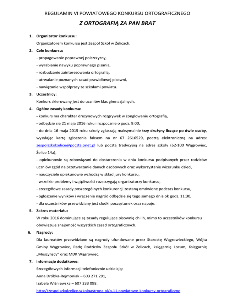 REGULAMIN VI POWIATOWEGO KONKURSU ORTOGRAFICZNEGO Z ORTOGRAFIĄ ZA PAN BRAT 1. Organizator konkursu: Organizatorem konkursu jest Zespół Szkół w Żelicach. 2. Cele konkursu: - propagowanie poprawnej polszczyzny, - wyrabianie nawyku poprawnego pisania, - rozbudzanie zainteresowania ortografią, - utrwalanie poznanych zasad prawidłowej pisowni, - nawiązanie współpracy ze szkołami powiatu. 3. Uczestnicy: Konkurs skierowany jest do uczniów klas gimnazjalnych. 4. Ogólne zasady konkursu: - konkurs ma charakter drużynowych rozgrywek w żonglowaniu ortografią, - odbędzie się 21 maja 2016 roku i rozpocznie o godz. 9:00, - do dnia 16 maja 2015 roku szkoły zgłaszają maksymalnie trzy drużyny liczące po dwie osoby, wysyłając kartę zgłoszenia faksem na nr 67 2616529, pocztą elektroniczną na adres: [email protected] lub pocztą tradycyjną na adres szkoły (62-100 Wągrowiec, Żelice 14a), - opiekunowie są zobowiązani do dostarczenia w dniu konkursu podpisanych przez rodziców uczniów zgód na przetwarzanie danych osobowych oraz wykorzystanie wizerunku dzieci, - nauczyciele opiekunowie wchodzą w skład jury konkursu, - wszelkie problemy i wątpliwości rozstrzygają organizatorzy konkursu, - szczegółowe zasady poszczególnych konkurencji zostaną omówione podczas konkursu, - ogłoszenie wyników i wręczenie nagród odbędzie się tego samego dnia ok godz. 11:30, - dla uczestników przewidziany jest słodki poczęstunek oraz napoje. 5. Zakres materiału: W roku 2016 dominujące są zasady regulujące pisownię ch i h, mimo to uczestników konkursu obowiązuje znajomość wszystkich zasad ortograficznych. 6. Nagrody: Dla laureatów przewidziane są nagrody ufundowane przez Starostę Wągrowieckiego, Wójta Gminy Wągrowiec, Radę Rodziców Zespołu Szkół w Żelicach, księgarnię Locum, Księgarnię „Muszyńscy” oraz MDK Wągrowiec. 7. Informacje dodatkowe: Szczegółowych informacji telefonicznie udzielają: Anna Dróbka-Rejmoniak – 603 271 291, Izabela Wiśniewska – 607 233 098. http://zespolszkolzelice.szkolnastrona.pl/p,11,powiatowe-konkursy-ortograficzne Załącznik: 1. Karta zgłoszenia drużyny 2. Oświadczenie o zgodzie na przetwarzanie danych osobowych oraz wykorzystanie wizerunku ucznia/nauczyciela. KARTA ZGŁOSZENIA DRUŻYNY Powiatowy Konkurs Ortograficzny Z ORTOGRAFIĄ ZA PAN BRAT Zespół Szkół Żelice, 21.05.2016, godz. 9:00 tel./fax 67-26 16 887 67-26 16 529 e-mail: [email protected] *Proszę uzupełnić drukowanymi literami. Nazwa, adres i tel. szkoły Opiekun grupy: Imię i nazwisko uczestnika (2): Klasa: Imię i nazwisko uczestnika (1): Nazwa, adres i tel. szkoły Opiekun grupy: Imię i nazwisko uczestnika (2): Klasa: Imię i nazwisko uczestnika (1): Nazwa, adres i tel. szkoły Opiekun grupy: Imię i nazwisko uczestnika (2): Klasa: Imię i nazwisko uczestnika (1): OŚWIADCZENIE (UCZEŃ) W związku z udziałem (imię i nazwisko ucznia)___________________________________ w V Powiatowym Konkursie Ortograficznym Z ORTOGRAFIĄ ZA PAN BRAT organizowanym przez Zespół Szkół w Żelicach, wyrażam zgodę na przetwarzanie danych osobowych zawartych w dokumentach zebranych na potrzeby konkursu, zgodnie z ustawą z dnia 29.08.1997 r. o Ochronie Danych Osobowych (Dz. U. Nr 133 poz. 883). Oświadczam również, że wyrażam zgodę na rejestrowanie podczas konkursu wizerunku mojego dziecka oraz wykorzystanie go poprzez umieszczanie zdjęć na stronie internetowej szkoły, tablicach ściennych i folderze szkolnym w celu informacji i promocji szkoły, zgodnie z ustawą o prawie autorskim i prawach pokrewnych (tekst jednolity: Dz. U. 2006 nr 90, poz. 631 ze zm.). ____________________ miejscowość i data _____________________________________ czytelny podpis (imię i nazwisko rodzica/prawnego opiekuna) OŚWIADCZENIE (NAUCZYCIEL) W związku z udziałem w V Powiatowym Konkursie Ortograficznym Z ORTOGRAFIĄ ZA PAN BRAT organizowanym przez Zespół Szkół w Żelicach, wyrażam zgodę na przetwarzanie danych osobowych zawartych w dokumentach zebranych na potrzeby konkursu, zgodnie z ustawą z dnia 29.08.1997 r. o Ochronie Danych Osobowych (Dz. U. Nr 133 poz. 883). Oświadczam również, że wyrażam zgodę na rejestrowanie podczas konkursu mojego wizerunku oraz wykorzystanie go poprzez umieszczanie zdjęć na stronie internetowej szkoły, tablicach ściennych i folderze szkolnym w celu informacji i promocji Szkoły, zgodnie z ustawą o prawie autorskim i prawach pokrewnych (tekst jednolity: Dz. U. 2006 nr 90, poz. 631 ze zm.). ______________________ miejscowość i data _____________________________________ czytelny podpis
