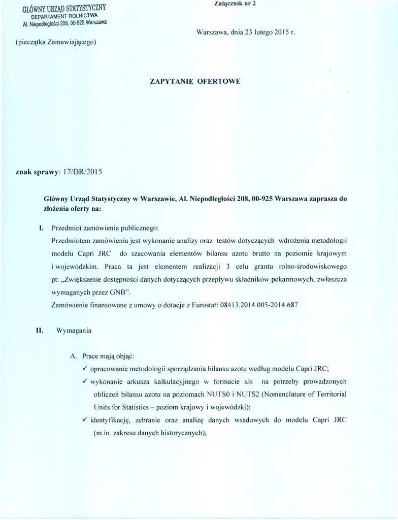 GŁÓWNY URZĄD STATYSTYCZNY Załącznik »r 2 DEPARTAMENT ROLNICTWA Al. Niepodległości 208,00-925 Warszawa W arszawa, dnia 23 lutego 2015 r. (pieczątka Zam awiającego) ZAPYTANIE OFERTOWE zn a k sp raw y: 17/D R /2015 Główny Urząd Statystyczny w Warszawie, Al. Niepodległości 208, 00-925 Warszawa zaprasza do złożenia oferty na: I. Przedmiot zam ów ienia publicznego: Przedmiotem zam ów ienia je st w ykonanie analizy oraz testów dotyczących w drożenia metodologii modelu Capri JRC i wojewódzkim. do szacow ania elem entów bilansu azotu brutto na poziom ie krajowym Praca ta jest elem entem realizacji 3 celu grantu rolno-środow iskow ego pt: „Zwiększenie dostępności danych dotyczących przepływu składników pokarm owych, zw łaszcza wym aganych przez G N B ” . Zam ówienie finansow ane z um owy o dotacje z Eurostat: 08413.2014.005-2014.687 II. W ym agania A. Prace m ają objąć: S opracowanie m etodologii sporządzania bilansu azotu w edług modelu Capri JRC; S w ykonanie arkusza kalkulacyjnego w form acie xls na potrzeby prowadzonych obliczeń bilansu azotu na poziom ach NUTS0 i NUTS2 (N om enclature o f Territorial Units for Statistics - poziom krajow y i wojewódzki); S identyfikację, zebranie oraz analizę danych wsadow ych do m odelu Capri JRC (m.in. zakresu danych historycznych); S sporządzenie raportu z przeprow adzonych prac zaw ierającego wnioski oraz rekom endacje dla GUS dotyczące możliwości w drożenia m odelu Capri JRC do obliczeń przepływu składników pokarmowych. B. U w zględnienie w analizie założeń z następujących dokumentów: S W. Britz, P. W itzke „CAPRI model docum entation 2014” ; S A. Leip “ M odelling the gross nitrogen balance in Europę with CAPRI: from country-scale to the pixel”; S W. Britz “The Graphical User Interface for CAPRI version 2014” ; S „N utrient Budget Handbook” v. 1.02; S 201202_gnb_regionalisation_dataneed.xls; ^ dokum entacji z grupy roboczej Eurostat „Rolnictwo i Środowisko” z lutego 2012 r. - point 2.1.2 Regionalisation. C. W ym agania dotyczące podmiotu: O udzielenie niniejszego zam ów ienia m ogą ubiegać się W ykonawcy dysponujący odpowiednim potencjałem naukow ym oraz zasobam i zdolnym i do w ykonania zam ów ienia, a także: S co najmniej 5 letnim doświadczeniem w prowadzeniu prac naukow o-badaw czych dotyczących przepływów składników pokarm owych, w tym azotu oraz bilansowaniem składników nawozowych; S co najmniej tytułem doktora; S doświadczeniem w realizacji/koordynacji projektów finansow anych ze środków unijnych; S dorobkiem min. 3 publikacji z zakresu gospodarki nawozam i, bilansu azotu oraz wpływu działalności rolniczej na środowisko naturalne. D. W ym agane dokumenty: 1) CV osoby zdolnej do w ykonania zamówienia; 2) E. W ykaz publikacji, o których m owa w pkt. II.C. W ramach realizacji pracy badawczej W ykonawca będzie zobow iązany do przedstaw ienia przedm iotu zam ów ienia w następujących formach: 1) Raport pośredni techniczny do 20 lipca 2015 r. - zaw ierający inform acje o postępie w pracach, w tym: S w stępne uwagi co do m ożliwości zastosow ania m odelu Capri JRC do szacowania GNB; * inw entaryzację danych wsadow ych i w skazanie brakujących danych; S arkusz kalkulacyjny opracowany na potrzeby prowadzonych obliczeń bilansu azotu na poziom ie kraju i województw. 2) Raport końcowy - do 4 m aja 2016 r. zawierający: ■S m etodologię kalkulacji bilansu GNB przy pom ocy m odelu Capri JRC; S listę danych wsadowych do modelu w raz z inform acją o ich dostępności i zakresie danych historycznych; S syntezę przeprowadzonych prac wraz z wnioskam i (rekom endacjam i) dla GUS dotyczącym i możliwości w drożenia m odelu Capri JRC w Polsce. 3) Streszczenie raportu końcowego zaw ierające krótki opis i podsum owanie prac. F. Zam aw iający wym aga, aby w ykonaw ca przygotow ał i przedłożył Zam aw iającem u jeden kom plet m ateriałów w wersji elektronicznej (w formacie W ord) na 10 dni przed ostatecznym term inem przekazania pracy (raport pośredni techniczny, raport końcowy) w celu ich akceptacji bądź naniesienia poprawek. G. W przypadku stw ierdzenia wad w ykonaw ca zobow iązany je st niezwłocznie, nie później niż w term inie 2 dni roboczych nanieść poprawki oraz ponownie przekazać m ateriały Zam awiającem u w celu ich akceptacji. H. Zam aw iający zastrzega sobie prawo do dwukrotnego spraw dzenia przedm iotu zam ów ienia przed term inem wykonania. I. W zawartej pom iędzy Zam awiającym a w ykonaw cą um owie zostanie zaw arty zapis 0 przeniesieniu m ajątkowych praw autorskich w polach eksploatacji wskazanych w art. 50 pkt 1 1 2, U stawy o praw ach autorskich i prawach pokrewnych (Dz. U. 1994 r., N r 26, poz. 83, z późn. zm.). J. W ykonawca przekaże raporty w wersji papierowej (2 egz.) oraz elektronicznej na nośniku CD w formatach doc/xls. III. T erm in w y k o n a n ia z a m ó w ie n ia W okresie od dnia podpisania umowy do 4.05.2016 r. IV. Płatność na realizację przedm iotu zamówienia: Płatność za w ykonaną usługę nastąpi w dwóch ratach, w ciągu 30 dni od m om entu przekazania Zam aw iającem u prawidłow o w ystawionego rachunku, faktury VAT, na podstawie podpisanego bez zastrzeżeń protokołu zdawczo-odbiorczego dotyczącego poszczególnych R aportow opisanych w punktach ILE. 1 i II.E.2, na rachunek bankowy w skazany przez W ykonawcę. V. M iejsce i term in złożenia oferty: Oferty należy składać do .!... m arca 2015 r. do godziny 12.00 w Głównym Urzędzie Statystycznym w W arszawie, al. N iepodległości 208, 00-925 W arszawa, pokój 359, III piętro, faxem na nr (22) 608 .3 j? 65 . lub na adres m ailowy m .w oiciechow ski@ stat.gov.pl VI. Kryteria oceny oferty: 100% cena Zostanie wybrana oferta wykonawcy, który przedstawi najkorzystniejszą cenę i spełni warunki określone w pkt II zapytania. V II. Do kontaktów w sprawie zapytania je st upoważniony: M ariusz W ojciechowsk