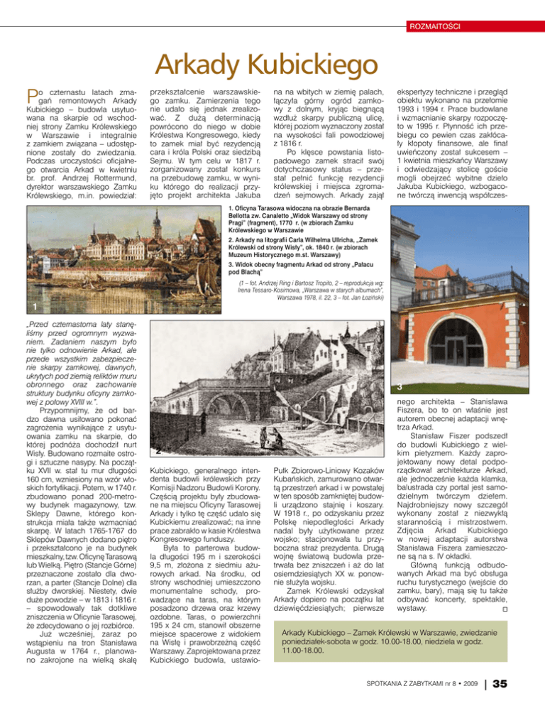 ROZMAITOŚCI Arkady Kubickiego P o czternastu latach zmagań remontowych Arkady Kubickiego – budowla usytuowana na skarpie od wschodniej strony Zamku Królewskiego w Warszawie i integralnie z zamkiem związana – udostępnione zostały do zwiedzania. Podczas uroczystości oficjalnego otwarcia Arkad w kwietniu br. prof. Andrzej Rottermund, dyrektor warszawskiego Zamku Królewskiego, m.in. powiedział: przekształcenie warszawskiego zamku. Zamierzenia tego nie udało się jednak zrealizować. Z dużą determinacją powrócono do niego w dobie Królestwa Kongresowego, kiedy to zamek miał być rezydencją cara i króla Polski oraz siedzibą Sejmu. W tym celu w 1817 r. zorganizowany został konkurs na przebudowę zamku, w wyniku którego do realizacji przyjęto projekt architekta Jakuba na na wbitych w ziemię palach, łączyła górny ogród zamkowy z dolnym, kryjąc biegnącą wzdłuż skarpy publiczną ulicę, której poziom wyznaczony został na wysokości fali powodziowej z 1816 r. Po klęsce powstania listopadowego zamek stracił swój dotychczasowy status – przestał pełnić funkcję rezydencji królewskiej i miejsca zgromadzeń sejmowych. Arkady zajął ekspertyzy techniczne i przegląd obiektu wykonano na przełomie 1993 i 1994 r. Prace budowlane i wzmacnianie skarpy rozpoczęto w 1995 r. Płynność ich przebiegu co pewien czas zakłócały kłopoty finansowe, ale finał uwieńczony został sukcesem – 1 kwietnia mieszkańcy Warszawy i odwiedzający stolicę goście mogli obejrzeć wybitne dzieło Jakuba Kubickiego, wzbogacone twórczą inwencją współczes- 1. Oficyna Tarasowa widoczna na obrazie Bernarda Bellotta zw. Canaletto „Widok Warszawy od strony Pragi” (fragment), 1770 r. (w zbiorach Zamku Królewskiego w Warszawie 2. Arkady na litografii Carla Wilhelma Ullricha, „Zamek Królewski od strony Wisły”, ok. 1840 r. (w zbiorach Muzeum Historycznego m.st. Warszawy) 3. Widok obecny fragmentu Arkad od strony „Pałacu pod Blachą” (1 – fot. Andrzej Ring i Bartosz Tropiło, 2 – reprodukcja wg: Irena Tessaro-Kosimowa, „Warszawa w starych albumach”, Warszawa 1978, il. 22, 3 – fot. Jan Łoziński) 1 „Przed czternastoma laty stanęliśmy przed ogromnym wyzwaniem. Zadaniem naszym było nie tylko odnowienie Arkad, ale przede wszystkim zabezpieczenie skarpy zamkowej, dawnych, ukrytych pod ziemią reliktów muru obronnego oraz zachowanie struktury budynku oficyny zamkowej z połowy XVIII w.”. Przypomnijmy, że od bardzo dawna usiłowano pokonać zagrożenia wynikające z usytuowania zamku na skarpie, do której podnóża dochodził nurt Wisły. Budowano rozmaite ostrogi i sztuczne nasypy. Na początku XVII w. stał tu mur długości 160 cm, wzniesiony na wzór włoskich fortyfikacji. Potem, w 1740 r. zbudowano ponad 200-metrowy budynek magazynowy, tzw. Sklepy Dawne, którego konstrukcja miała także wzmacniać skarpę. W latach 1765-1767 do Sklepów Dawnych dodano piętro i przekształcono je na budynek mieszkalny, tzw. Oficynę Tarasową lub Wielką. Piętro (Stancje Górne) przeznaczone zostało dla dworzan, a parter (Stancje Dolne) dla służby dworskiej. Niestety, dwie duże powodzie – w 1813 i 1816 r. – spowodowały tak dotkliwe zniszczenia w Oficynie Tarasowej, że zdecydowano o jej rozbiórce. Już wcześniej, zaraz po wstąpieniu na tron Stanisława Augusta w 1764 r., planowano zakrojone na wielką skalę 3 2 Kubickiego, generalnego intendenta budowli królewskich przy Komisji Nadzoru Budowli Korony. Częścią projektu były zbudowane na miejscu Oficyny Tarasowej Arkady i tylko tę część udało się Kubickiemu zrealizować; na inne prace zabrakło w kasie Królestwa Kongresowego funduszy. Była to parterowa budowla długości 195 m i szerokości 9,5 m, złożona z siedmiu ażurowych arkad. Na środku, od strony wschodniej umieszczono monumentalne schody, prowadzące na taras, na którym posadzono drzewa oraz krzewy ozdobne. Taras, o powierzchni 195 x 24 cm, stanowił obszerne miejsce spacerowe z widokiem na Wisłę i prawobrzeżną część Warszawy. Zaprojektowana przez Kubickiego budowla, ustawio- Pułk Zbiorowo-Liniowy Kozaków Kubańskich, zamurowano otwartą przestrzeń arkad i w powstałej w ten sposób zamkniętej budowli urządzono stajnię i koszary. W 1918 r., po odzyskaniu przez Polskę niepodległości Arkady nadal były użytkowane przez wojsko; stacjonowała tu przyboczna straż prezydenta. Drugą wojnę światową budowla przetrwała bez zniszczeń i aż do lat osiemdziesiątych XX w. ponownie służyła wojsku. Zamek Królewski odzyskał Arkady dopiero na początku lat dziewięćdziesiątych; pierwsze nego architekta – Stanisława Fiszera, bo to on właśnie jest autorem obecnej adaptacji wnętrza Arkad. Stanisław Fiszer podszedł do budowli Kubickiego z wielkim pietyzmem. Każdy zaprojektowany nowy detal podporządkował architekturze Arkad, ale jednocześnie każda klamka, balustrada czy portal jest samodzielnym twórczym dziełem. Najdrobniejszy nowy szczegół wykonany został z niezwykłą starannością i mistrzostwem. Zdjęcia Arkad Kubickiego w nowej adaptacji autorstwa Stanisława Fiszera zamieszczone są na s. IV okładki. Główną funkcją odbudowanych Arkad ma być obsługa ruchu turystycznego (wejście do zamku, bary), mają się tu także odbywać koncerty, spektakle, wystawy. Arkady Kubickiego – Zamek Królewski w Warszawie, zwiedzanie poniedziałek-sobota w godz. 10.00-18.00, niedziela w godz. 11.00-18.00. Spotkania z zabytkami nr 8 • 2009 35