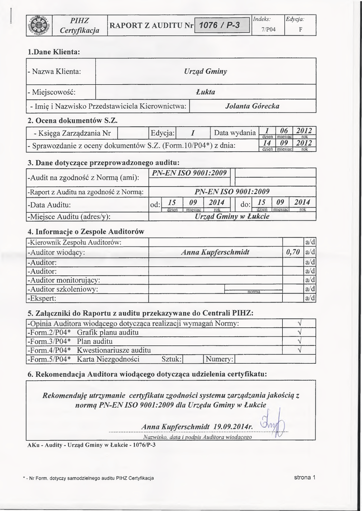 PIHZ Certyfikacja RAPORT Z AUDITU Nr 1076 / P