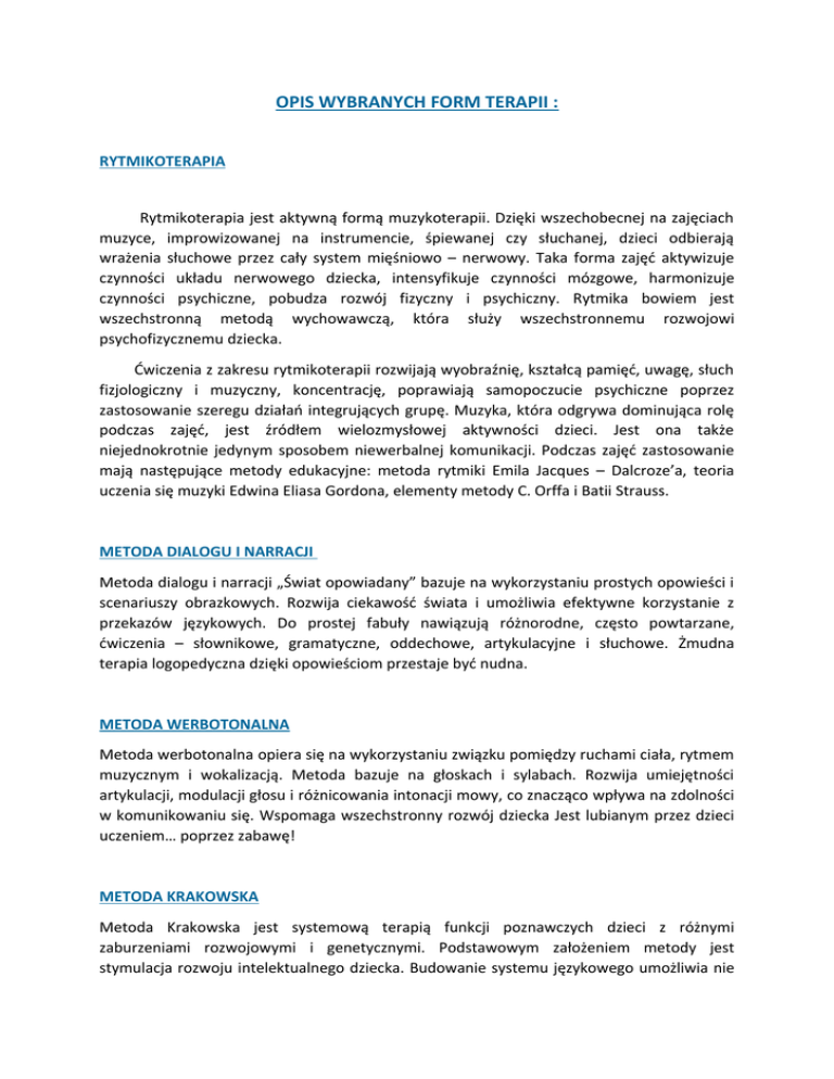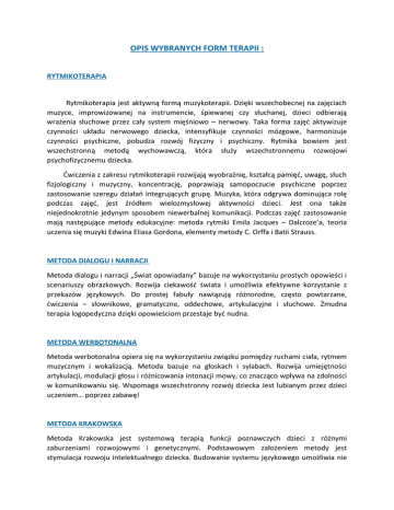 OPIS WYBRANYCH FORM TERAPII : RYTMIKOTERAPIA Rytmikoterapia jest aktywną formą muzykoterapii. Dzięki wszechobecnej na zajęciach muzyce, improwizowanej na instrumencie, śpiewanej czy słuchanej, dzieci odbierają wrażenia słuchowe przez cały system mięśniowo – nerwowy. Taka forma zajęć aktywizuje czynności układu nerwowego dziecka, intensyfikuje czynności mózgowe, harmonizuje czynności psychiczne, pobudza rozwój fizyczny i psychiczny. Rytmika bowiem jest wszechstronną metodą wychowawczą, która służy wszechstronnemu rozwojowi psychofizycznemu dziecka. Ćwiczenia z zakresu rytmikoterapii rozwijają wyobraźnię, kształcą pamięć, uwagę, słuch fizjologiczny i muzyczny, koncentrację, poprawiają samopoczucie psychiczne poprzez zastosowanie szeregu działań integrujących grupę. Muzyka, która odgrywa dominująca rolę podczas zajęć, jest źródłem wielozmysłowej aktywności dzieci. Jest ona także niejednokrotnie jedynym sposobem niewerbalnej komunikacji. Podczas zajęć zastosowanie mają następujące metody edukacyjne: metoda rytmiki Emila Jacques – Dalcroze’a, teoria uczenia się muzyki Edwina Eliasa Gordona, elementy metody C. Orffa i Batii Strauss. METODA DIALOGU I NARRACJI Metoda dialogu i narracji „Świat opowiadany” bazuje na wykorzystaniu prostych opowieści i scenariuszy obrazkowych. Rozwija ciekawość świata i umożliwia efektywne korzystanie z przekazów językowych. Do prostej fabuły nawiązują różnorodne, często powtarzane, ćwiczenia – słownikowe, gramatyczne, oddechowe, artykulacyjne i słuchowe. Żmudna terapia logopedyczna dzięki opowieściom przestaje być nudna. METODA WERBOTONALNA Metoda werbotonalna opiera się na wykorzystaniu związku pomiędzy ruchami ciała, rytmem muzycznym i wokalizacją. Metoda bazuje na głoskach i sylabach. Rozwija umiejętności artykulacji, modulacji głosu i różnicowania intonacji mowy, co znacząco wpływa na zdolności w komunikowaniu się. Wspomaga wszechstronny rozwój dziecka Jest lubianym przez dzieci uczeniem… poprzez zabawę! METODA KRAKOWSKA Metoda Krakowska jest systemową terapią funkcji poznawczych dzieci z różnymi zaburzeniami rozwojowymi i genetycznymi. Podstawowym założeniem metody jest stymulacja rozwoju intelektualnego dziecka. Budowanie systemu językowego umożliwia nie tylko komunikację, opisywanie i wyjaśnianie świata, ale także budowanie własnej tożsamości. Celem metody jest osiągnięcie kolejnych etapów w rozwoju wszystkich funkcji poznawczych. Terapia neurobiologiczna stymuluje wszystkie funkcje poznawcze, naśladując etapy ich kształtowania się obserwowane u dzieci bez trudności rozwojowych. Źródło: www.metodakrakowska.pl KOMUNIKACJA ALTERNATYWNA I WSPOMAGAJĄCA AAC Termin AAC (Augmentative and Alternative Communication) oznacza komunikację wspomagającą i alternatywną. Komunikacja wspomagająca zawiera wszelkie działania, których celem jest pomoc w porozumiewaniu się osób nieposługujących się mową lub posługujących się nią w ograniczonym stopniu. Istnieje wiele wspomagających i alternatywnych sposobów porozumiewania się, które dają dziecku możliwość komunikowania się. Należą do nich systemy gestów, różnorodne systemy obrazkowe, piktogramy lub symbole abstrakcyjne. Możliwości i potrzeby każdego dziecka oceniane są przez interdyscyplinarne zespoły specjalistów i na tej podstawie odpowiedni sposób porozumiewania się wprowadzany jest w życie. Zródło: http://aac.org.pl/