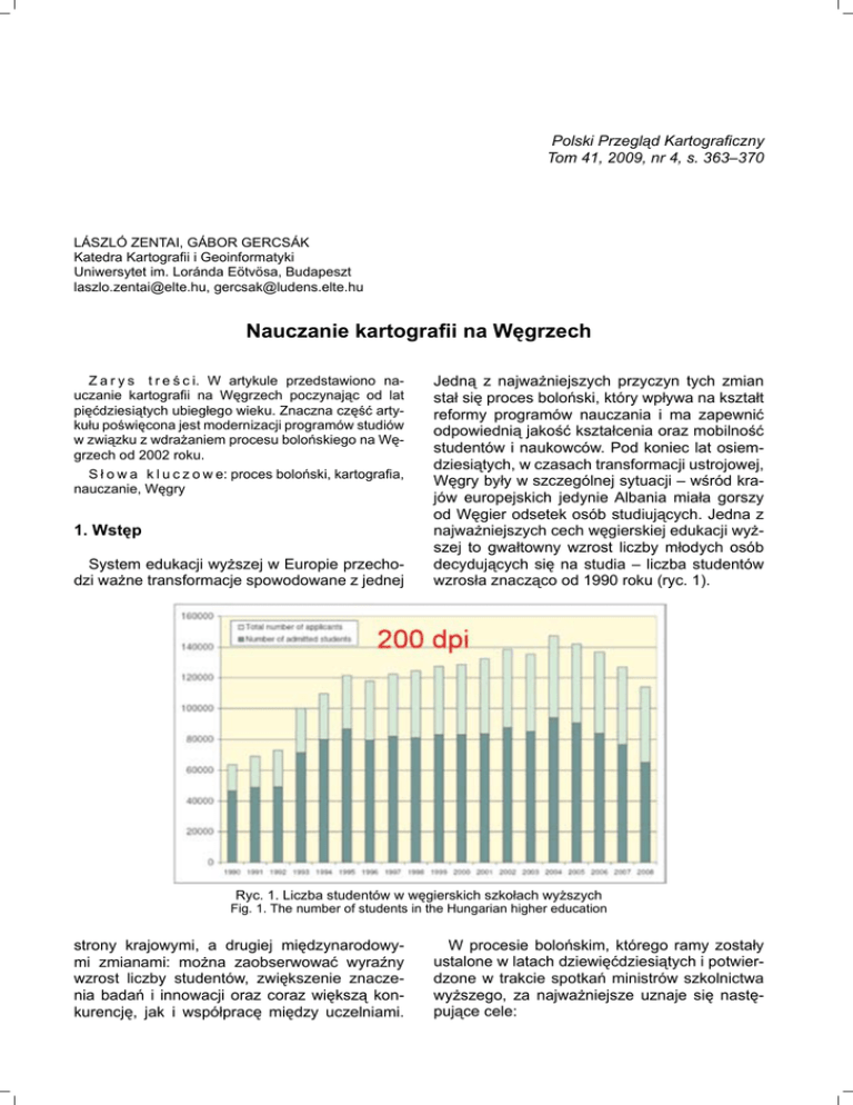 Polski Przegląd Kartograficzny Tom 41, 2009, nr 4, s. 363–370 László Zentai, Gábor Gercsák Katedra Kartografii i Geoinformatyki Uniwersytet im. Loránda Eötvösa, Budapeszt [email protected], [email protected] Nauczanie kartografii na Węgrzech Z a r y s t r e ś c i. W artykule przedstawiono nauczanie kartografii na Węgrzech poczynając od lat pięćdziesiątych ubiegłego wieku. Znaczna część artykułu poświęcona jest modernizacji programów studiów w związku z wdrażaniem procesu bolońskiego na Węgrzech od 2002 roku. S ł o w a k l u c z o w e: proces boloński, kartografia, nauczanie, Węgry 1. Wstęp System edukacji wyższej w Europie przechodzi ważne transformacje spowodowane z jednej Jedną z najważniejszych przyczyn tych zmian stał się proces boloński, który wpływa na kształt reformy programów nauczania i ma zapewnić odpowiednią jakość kształcenia oraz mobilność studentów i naukowców. Pod koniec lat osiemdziesiątych, w czasach transformacji ustrojowej, Węgry były w szczególnej sytuacji – wśród krajów europejskich jedynie Albania miała gorszy od Węgier odsetek osób studiujących. Jedna z najważniejszych cech węgierskiej edukacji wyższej to gwałtowny wzrost liczby młodych osób decydujących się na studia – liczba studentów wzrosła znacząco od 1990 roku (ryc. 1). Ryc. 1. Liczba studentów w węgierskich szkołach wyższych Fig. 1. The number of students in the Hungarian higher education strony krajowymi, a drugiej międzynarodowymi zmianami: można zaobserwować wyraźny wzrost liczby studentów, zwiększenie znaczenia badań i innowacji oraz coraz większą konkurencję, jak i współpracę między uczelniami. W procesie bolońskim, którego ramy zostały ustalone w latach dziewięćdziesiątych i potwierdzone w trakcie spotkań ministrów szkolnictwa wyższego, za najważniejsze uznaje się następujące cele: 364 László Zentai, Gábor Gercsák – przyjęcie systemu czytelnych i porównywalnych stopni (tytułów zawodowych), – przyjęcie systemu kształcenia opartego zasadniczo na dwóch poziomach, prowadzących do tytułu licencjata i magistra, – wdrożenie systemu transferu i akumulacji punktów zaliczeniowych (ECTS), który ma ułat wić zwiększenie mobilności studentów, – promowanie mobilności poprzez usuwanie przeszkód stojących na drodze swobodnego przemieszczania się, – promocję współpracy europejskiej dla zapewniania jakości kształcenia oraz opracowania porównywalnych kryteriów i metodologii, – promowanie tzw. europejskiego wymiaru szkolnictwa wyższego. Wszystko to ma prowadzić do powstania do 2010 roku Europejskiego Obszaru Szkolnictwa Wyższego, w którym mobilność studentów i kadry akademickiej oraz porównywanie zdobytych kwalifikacji będą łatwiejsze. Dotychczasowy zróżnicowany krajowy system kształcenia wyższego zostanie umieszczony we wspólnych ramach opartych na trzech poziomach kształcenia. Uniwersytety węgierskie zyskały większą autonomię i niezależność od władzy państwowej na podstawie rozporządzenia z 1993 roku. Jednak system funkcjonujących równolegle szkół wyższych – uniwersytetów i kolegiów oraz dwutorowy system nauczania pozostały niezmienione. W 1996 roku wprowadzono kilka ważnych modyfikacji do wspomnianego rozporządzenia, które spowodowały, że uniwersytety musiały wdrożyć system kształcenia oparty na kilku poziomach. Węgry podpisały Deklarację Bolońską w 1999 roku, lecz w następnych latach zaszły niewielkie zmiany. Takie powolne tempo transformacji było częściowo spowodowane przeświadczeniem odpowiedzialnych instytucji, że poziom kształcenia na Węgrzech jest wyższy niż w Europie Zachodniej. W 2000 roku weszła w życie ważna uchwała, która prowadziła do łączenia instytucji szkolnictwa wyższego – włączania małych uniwersytetów do większych uczelni znajdujących się w tym samym mieście lub regionie. W rezultacie liczba uczelni zmniejszyła się o połowę. Pozostało jednak wiele problemów po starym systemie, takich jak równoległe struktury i stanowiska oraz podział zysków i zobowiązań finansowych. Dopiero w 2002 roku Węgry zaczęły wprowadzać zasady procesu bolońskiego: rządowe zarządzenie wprowadziło nowy system edukacji oparty na poziomach kształcenia (studia wie- lostopniowe) oraz określiło zasady kwalifikacji w ramach szkolnictwa wyższego. Ponadto zostały opracowane nowe procedury uruchamiania i akredytacji programów nauczania na studiach licencjackich i magisterskich. Ostatnia ustawa o szkolnictwie wyższym z 2005–2006 uprawomocniła system oparty na poziomach kształcenia, a więc spowodowała ostateczne odejście od starego systemu instytucji funkcjonujących równolegle. Od roku akademickiego 2006/2007 szkoły wyższe są prawnie zobowiązane do uruchamiania tylko takich program studiów, które opierają się na systemie studiów trójstopniowych. 2. Nauczanie kartografii w starym systemie szkół funkcjonujących równolegle W starym systemie dziesięć uniwersytetów i kolegiów miało w swoich programach nauczania kartografię i systemy informacji geograficznej (GIS). Trzy szkoły wyższe, cieszące się stosunkowo długą tradycją nauczania naszego zawodu, oferowały studia w zakresie kartografii lub dyscyplin związanych z kartografią (ryc. 2). Ryc. 2. Kierunki związane z kartografią na uniwersytetach przed wprowadzeniem modelu bolońskiego Fig. 2. Cartography-related university programmes before the Bologna system 2.1. Uniwersytet im. Loránda Eötvösa (Budapeszt) W 1953 r. na Wydziale Nauk Matematyczno-Przyrodniczych powstała Katedra Kartografii. Wtedy też pierwszy kierownik Katedry László Irméd-Molnár, wcześniej zatrudniony w wojsku, opracował niezależny trzyletni program studiów kartograficznych. Studia te mogli wybrać tylko ci studenci, którzy wcześniej ukończyli dwa lata studiów geograficznych. Przez pierwsze 20 lat Nauczanie kartograf