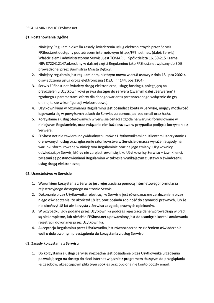 REGULAMIN USŁUG FPShost.net §1. Postanowienia Ogólne 1. Niniejszy Regulamin określa zasady świadczenia usług elektronicznych przez Serwis FPShost.net dostępny pod adresem internetowym http://FPShost.net. (dalej: Serwis) Właścicielem i administratorem Serwisu jest TOMAR ul. Spółdzielcza 16, 39-215 Czarna, NIP: 8722412147,określany w dalszej części Regulaminu jako FPShost.net wpisany do EDG prowadzonej przez Burmistrza Miasta Dębicy. 2. Niniejszy regulamin jest regulaminem, o którym mowa w art.8 ustawy z dnia 18 lipca 2002 r. o świadczeniu usług drogą elektroniczną ( Dz.U. nr 144, poz.1204). 3. Serwis FPShost.net świadczy drogą elektroniczną usługę hostingu, polegającą na przydzieleniu Użytkownikowi prawa dostępu do serwera (zwanym dalej „Serwerem”) zgodnego z parametrami oferty dla danego wariantu przeznaczonego wyłącznie do gry online, także w konfiguracji wieloosobowej. 4. Użytkownikiem w rozumieniu Regulaminu jest posiadacz konta w Serwisie, mający możliwośd logowania się w powyższych celach do Serwisu za pomocą adresu email oraz hasła. 5. Korzystanie z usług oferowanych w Serwisie oznacza zgodę na warunki formułowane w niniejszym Regulaminie, oraz związanie nim każdorazowo w przypadku podjęcia korzystania z Serwera. 6. FPShost.net nie zawiera indywidualnych umów z Użytkownikami ani Klientami. Korzystanie z oferowanych usług oraz zgłoszenie członkowstwa w Serwisie oznacza wyrażenie zgody na warunki sformułowane w niniejszym Regulaminie oraz na jego zmiany. Użytkownicy odwiedzający Serwis, którzy nie zarejestrowali się jako Użytkownicy Serwisu – tzw. Klienci, związani są postanowieniami Regulaminu w zakresie wynikającym z ustawy o świadczeniu usług drogą elektroniczną. §2. Uczestnictwo w Serwisie 1. Warunkiem korzystania z Serwisu jest rejestracja za pomocą internetowego formularza rejestracyjnego dostępnego na stronie Serwisu. 2. Dokonanie przez Użytkownika rejestracji w Serwisie jest równoznaczne ze złożeniem przez niego oświadczenia, że ukooczył 18 lat, oraz posiada zdolnośd do czynności prawnych, lub że nie ukooczył 18 lat ale korzysta z Serwisu za zgodą prawnych opiekunów. 3. W przypadku, gdy podane przez Użytkownika podczas rejestracji dane wprowadzają w błąd, są niekompletne, lub nieścisłe FPShost.net upoważniony jest do usunięcia konta i anulowania rejestracji dokonanej przez Użytkownika. 4. Akceptacja Regulaminu przez Użytkownika jest równoznaczna ze złożeniem oświadczenia woli o dobrowolnym przystąpieniu do korzystania z usług Serwisu. §3. Zasady korzystania z Serwisu 1. Do korzystania z usługi Serwisu niezbędne jest posiadanie przez Użytkownika urządzenia pozwalającego na dostęp do sieci Internet włącznie z programem służącym do przeglądania jej zasobów, akceptującym pliki typu cookies oraz opcjonalnie konto poczty email. 2. 3. 4. 5. 6. 7. 8. 9. Użytkownik i Klient są wyłącznie odpowiedzialni za zapewnienie technicznej zgodności pomiędzy swoim systemem komputerowym, a Serwerem. Warunkiem korzystania z Serwisu jest założenie konta przez Użytkownika. Każdy Użytkownik może mied tylko jedno konto. Założenie więcej niż jednego konta wymaga zgody FPShost.net. Płatnośd realizowana jest poprzez wysłanie SMS o podwyższonej wartości z kodem na numer wskazany w Serwisie lub poprzez dokonanie przelewu bankowego. Cennik usług zamieszony jest na stronie Serwisu. Użytkownikowi nie wolno udostępniad swojego konta innym osobom, jak też nie może on korzystad z kont należących do innych osób. Konto Użytkownika służy do naliczania wpływów i odpływów związanych z udziałem Użytkownika w grze. Uzupełnienie konta następuje w drodze doładowania przez Użytkownika przy użyciu SMS PREMIUM, przelewu bankowego, konta PayPal bądź kodu PaySafeCard. Dodane środki nie mogą byd wykorzystywane w jakikolwiek sposób poza Serwisem , nie podlegają one wymianie na środki płatnicze i nie mogą byd przedmiotem obrotu pomiędzy pozostałymi Użytkownikami Serwisu. Wraz z usunięciem konta Użytkownika zgromadzone na nim środki zostają anulowane. Użytkownik może używad Serwisu wyłącznie do celów gry, co oznacza, że Użytkownik nie może: a. korzystad z Serwisu w jakichkolwiek innych celach; b. wprowadzad do Serwisu jakichkolwiek materiałów lub korzystad z niego w inny sposób, dla celów prowadzenia działalności gospodarczej, reklamy czy handlu; c. korzystad z dostępu do Serwisu dla celów wysyłki nie zamówionej informacji handlowej; d. przetrzymywad zgromadzonych środków w Serwisie bez wykupionych Usług przez okres dłuższy niż 31 dni od daty wygaśnięcia ostatniej Usługi, Serwis zastrzega sobie prawo do usunięcia wszystkich zgromadzonych środków na koncie Użytkownika. Użytkownikowi może zostad odebrany lub zawieszony czasowo dostęp do konta lub serwera, w przypadkach określonych w ust.4 a ponadto gdy: a. swoim zachowaniem narusza prawa osób trzecich; b. używa w stosunku do innych użytkowników słów powszechnie uznanych za obelżywe; c. narusza prawo w tym prawa własności intelektualnej, postanowienia Regulaminu, dobre obyczaje i zasady współżycia społecznego; d. korzysta z zakupionego serwera niezgodnie z jego przeznaczeniem lub wykracza parametrami poza limity dla danej oferty; e. używa Serwera do celów innych niż gra sieciowa oraz używa Serwera FTP jako miejsca wymiany plików, f. zmienia porty serwerów wcześniej ustalone przez Serwis, W przypadku odebrania Użytkownikowi prawa dostępu do konta zgromadzone przez niego środki nie podlegają zwrotowi Nazwa Serwisu, szata graficzna, znaki graficzne, oprogramowanie podlegają ochronie prawno autorskiej. To oznacza, że żadna częśd jak i całośd utworów zawartych w Serwerze nie może byd powielana i rozpowszechniana w jakiejkolwiek formie i w jakikolwiek sposób na żadnym polu eksploatacji – bez pisemnej zgody FPShost.net. §4. Polityka prywatno