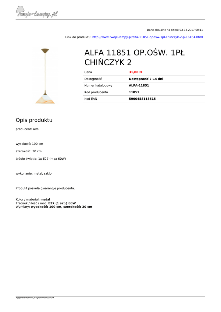Dane aktualne na dzień: 03-03-2017 00:11 Link do produktu: http://www.twoje-lampy.pl/alfa-11851-oposw-1pl-chinczyk-2-p-16164.html ALFA 11851 OP.OŚW. 1PŁ CHIŃCZYK 2 Cena 31,88 zł Dostępność Dostępność 7-14 dni Numer katalogowy ALFA-11851 Kod producenta 11851 Kod EAN 5900458118515 Opis produktu producent: Alfa wysokość: 100 cm szerokość: 30 cm źródło światła: 1x E27 (max 60W) wykonanie: metal, szkło Produkt posiada gwarancje producenta. Kolor / materiał: metal Trzonek / ilość / moc: E27 (1 szt.) 60W Wymiary: wysokość: 100 cm, szerokość: 30 cm wygenerowano w programie shopGold Powered by TCPDF (www.tcpdf.org)