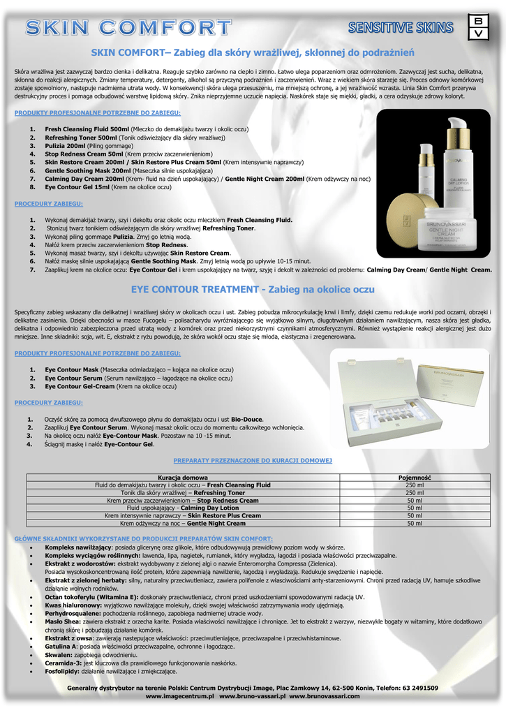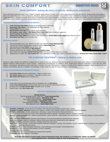 SKIN COMFORT– Zabieg dla skóry wrażliwej, skłonnej do podrażnień Skóra wrażliwa jest zazwyczaj bardzo cienka i delikatna. Reaguje szybko zarówno na ciepło i zimno. Łatwo ulega poparzeniom oraz odmrożeniom. Zazwyczaj jest sucha, delikatna, skłonna do reakcji alergicznych. Zmiany temperatury, detergenty, alkohol są przyczyną podrażnień i zaczerwienień. Wraz z wiekiem skóra starzeje się. Proces odnowy komórkowej zostaje spowolniony, następuje nadmierna utrata wody. W konsekwencji skóra ulega przesuszeniu, ma mniejszą ochronę, a jej wrażliwość wzrasta. Linia Skin Comfort przerywa destrukcyjny proces i pomaga odbudować warstwę lipidową skóry. Znika nieprzyjemne uczucie napięcia. Naskórek staje się miękki, gładki, a cera odzyskuje zdrowy koloryt. PRODUKTY PROFESJONALNE POTRZEBNE DO ZABIEGU: 1. 2. 3. 4. 5. 6. 7. 8. Fresh Cleansing Fluid 500ml (Mleczko do demakijażu twarzy i okolic oczu) Refreshing Toner 500ml (Tonik odświeżający dla skóry wrażliwej) Pulizia 200ml (Piling gommage) Stop Redness Cream 50ml (Krem przeciw zaczerwienieniom) Skin Restore Cream 200ml / Skin Restore Plus Cream 50ml (Krem intensywnie naprawczy) Gentle Soothing Mask 200ml (Maseczka silnie uspokajająca) Calming Day Cream 200ml (Krem- fluid na dzień uspokajający) / Gentle Night Cream 200ml (Krem odżywczy na noc) Eye Contour Gel 15ml (Krem na okolice oczu) PROCEDURY ZABIEGU: 1. 2. 3. 4. 5. 6. 7. Wykonaj demakijaż twarzy, szyi i dekoltu oraz okolic oczu mleczkiem Fresh Cleansing Fluid. Stonizuj twarz tonikiem odświeżającym dla skóry wrażliwej Refreshing Toner. Wykonaj piling gommage Pulizia. Zmyj go letnią wodą. Nałóż krem przeciw zaczerwienieniom Stop Redness. Wykonaj masaż twarzy, szyi i dekoltu używając Skin Restore Cream. Nałóż maskę silnie uspokajającą Gentle Soothing Mask. Zmyj letnią wodą po upływie 10-15 minut. Zaaplikuj krem na okolice oczu: Eye Contour Gel i krem uspokajający na twarz, szyję i dekolt w zależności od problemu: Calming Day Cream/ Gentle Night Cream. EYE CONTOUR TREATMENT - Zabieg na okolice oczu Specyficzny zabieg wskazany dla delikatnej i wrażliwej skóry w okolicach oczu i ust. Zabieg pobudza mikrocyrkulację krwi i limfy, dzięki czemu redukuje worki pod oczami, obrzęki i delikatne zasinienia. Dzięki obecności w masce Fucogelu – polisacharydu wyróżniającego się wyjątkowo silnym, długotrwałym działaniem nawilżającym, nasza skóra jest gładka, delikatna i odpowiednio zabezpieczona przed utratą wody z komórek oraz przed niekorzystnymi czynnikami atmosferycznymi. Również wystąpienie reakcji alergicznej jest dużo mniejsze. Inne składniki: soja, wit. E, ekstrakt z ryżu powodują, że skóra wokół oczu staje się młoda, elastyczna i zregenerowana. PRODUKTY PROFESJONALNE POTRZEBNE DO ZABIEGU: 1. 2. 3. Eye Contour Mask (Maseczka odmładzająco – kojąca na okolice oczu) Eye Contour Serum (Serum nawilżająco – łagodzące na okolice oczu) Eye Contour Gel-Cream (Krem na okolice oczu) PROCEDURY ZABIEGU: 1. 2. 3. 4. Oczyść skórę za pomocą dwufazowego płynu do demakijażu oczu i ust Bio-Douce. Zaaplikuj Eye Contour Serum. Wykonaj masaż okolic oczu do momentu całkowitego wchłonięcia. Na okolicę oczu nałóż Eye-Contour Mask. Pozostaw na 10 -15 minut. Ściągnij maskę i nałóż Eye-Contour Gel. PREPARATY PRZEZNACZONE DO KURACJI DOMOWEJ Kuracja domowa Fluid do demakijażu twarzy i okolic oczu – Fresh Cleansing Fluid Tonik dla skóry wrażliwej – Refreshing Toner Krem przeciw zaczerwienieniom – Stop Redness Cream Fluid uspokajający - Calming Day Lotion Krem intensywnie naprawczy – Skin Restore Plus Cream Krem odżywczy na noc – Gentle Night Cream Pojemność 250 ml 250 ml 50 ml 50 ml 50 ml 50 ml GŁÓWNE SKŁADNIKI WYKORZYSTANE DO PRODUKCJI PREPARATÓW SKIN COMFORT: Kompleks nawilżający: posiada glicerynę oraz glikole, które odbudowywują prawidłowy poziom wody w skórze. Kompleks wyciągów roślinnych: lawenda, lipa, nagietek, rumianek, który wygładza, łagodzi i posiada właściwości przeciwzapalne. Ekstrakt z wodorostów: ekstrakt wydobywany z zielonej algi o nazwie Enteromorpha Compressa (Zielenica). Posiada wysokoskoncentrowaną ilość protein, które zapewniają nawilżenie, łagodzą i wygładzają. Redukuje swędzenie i napięcie. Ekstrakt z zielonej herbaty: silny, naturalny przeciwutleniacz, zawiera polifenole z własciwościami anty-starzeniowymi. Chroni przed radacją UV, hamuje szkodliwe działąnie wolnych rodników. Octan tokoferylu (Witamina E): doskonały przeciwutleniacz, chroni przed uszkodzeniami spowodowanymi radacją UV. Kwas hialuronowy: wyjątkowo nawilżające molekuły, dzięki swojej właściwości zatrzymywania wody ujędrniają. Perhydrosqualene: pochodzenia roślinnego, zapobiega nadmiernej utracie wody. Masło Shea: zawiera ekstrakt z orzecha karite. Posiada właściwości nawilżające i chroniące. Jet to ekstrakt z warzyw, niezwykle bogaty w witaminy, które dodatkowo chronią skórę i pobudzają działanie komórek. Ekstrakt z owsa: zawierają nastepujące właściwości: przeciwutleniające, przeciwzapalne i przeciwhistaminowe. Gatulina A: posiada właściwości przeciwzapalne, ochronne i łagodzące. Skwalen: zapobiega odwodnieniu. Ceramida-3: jest kluczowa dla prawidłowego funkcjonowania naskórka. Fosfolipidy: działanie nawilżające i zmiękczające. Generalny dystrybutor na terenie Polski: Centrum Dystrybucji Image, Plac Zamkowy 14, 62-500 Konin, Telefon: 63 2491509 www.imagecentrum.pl www.bruno-vassari.pl www.brunovassari.com