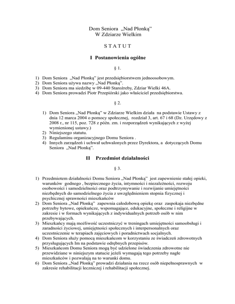 Dom Seniora „Nad Płonką” W Zdziarze Wielkim S TAT U T I Postanowienia ogólne § 1. 1) 2) 3) 4) Dom Seniora „Nad Płonką” jest przedsiębiorstwem jednoosobowym. Dom Seniora używa nazwy „Nad Płonką”. Dom Seniora ma siedzibę w 09-440 Staroźreby, Zdziar Wielki 46A. Dom Seniora prowadzi Piotr Przepiórski jako właściciel przedsiębiorstwa. § 2. 1) Dom Seniora „Nad Płonką” w Zdziarze Wielkim działa na podstawie Ustawy z dnia 12 marca 2004 o pomocy społecznej, rozdział 3, art. 67 i 68 (Dz. Urzędowy z 2008 r., nr 115, poz. 728 z późn. zm. i rozporządzeń wynikających z wyżej wymienionej ustawy.) 2) Niniejszego statutu. 3) Regulaminu organizacyjnego Domu Seniora . 4) Innych zarządzeń i uchwał uchwalonych przez Dyrektora, a dotyczących Domu Seniora „Nad Płonką”. II Przedmiot działalności § 3. 1) Przedmiotem działalności Domu Seniora „Nad Płonką” jest zapewnienie stałej opieki, warunków godnego , bezpiecznego życia, intymności i niezależności, rozwoju osobowości i samodzielności oraz podtrzymywanie i rozwijanie umiejętności niezbędnych do samodzielnego życia z uwzględnieniem stopnia fizycznej i psychicznej sprawności mieszkańców 2) Dom Seniora „Nad Płonką” zapewnia całodobową opiekę oraz zaspokaja niezbędne potrzeby bytowe, opiekuńcze, wspomagające, edukacyjne, społeczne i religijne w zakresie i w formach wynikających z indywidualnych potrzeb osób w nim przebywających. 3) Mieszkańcy mają możliwość uczestniczyć w treningach umiejętności samoobsługi i zaradności życiowej, umiejętności społecznych i interpersonalnych oraz uczestniczenie w terapiach zajęciowych i poradnictwach socjalnych. 4) Dom Seniora służy pomocą mieszkańcom w korzystaniu ze świadczeń zdrowotnych przysługujących Im na podstawie odrębnych przepisów. 5) Mieszkańcom Domu Seniora mogą być udzielone świadczenia zdrowotne nie przewidziane w niniejszym statucie jeżeli wymagają tego potrzeby nagłe mieszkańców i pozwalają na to warunki domu. 6) Dom Seniora „Nad Płonką” prowadzi działania na rzecz osób niepełnosprawnych w zakresie rehabilitacji leczniczej i rehabilitacji społecznej. § 4. 1) Dom Seniora jest domem pobytu stałego i czasowego oraz świadczy usługi dla osób niepełnosprawnych, przewlekle chorych, lub osób w podeszłym wieku obu płci. 2) Prawo do umieszczenia w Domu Seniora przysługuje osobom na warunkach oddzielnie określonych w umowie przyjęcia do Domu Seniora. § 5. 1) Decyzje o skierowaniu do Domu Seniora i warunków o odpłatności wydaje dyrektor Domu Seniora „Nad Płonką” na podstawie przepisów wewnętrznych . III Organizacja i zasady działania Domu Pomocy Społecznej §6. 1) Dom Seniora jest przedsiębiorstwem jednoosobowym. 2) Domem Seniora „Nad Płonką” kieruje Dyrektor wraz z zespołem kierowniczym powołanym na Jego wniosek. 3) Kierując Domem Seniora, Dyrektor odpowiada za jego działalność i realizację działań statutowych oraz prawidłowe gospodarowanie jego mieniem i środkami finansowymi. § 7. 1) Strukturę organizacyjną i szczegółowy zakres zadań funkcjonowania Domu Seniora oraz praw i obowiązków Jego mieszkańców określa opracowany przez Dyrektora Domu regulamin organizacyjny. IV Gospodarka finansowa Domu Pomocy Społecznej § 8. 1) Gospodarka finansowa Domu Seniora realizowana jest w oparciu o przepisy ogólne funkcjonowania przedsiębiorstw i zasad prowadzenia pełnej księgowości. § 9. 1) Dom Seniora „Nad Płonką” pokrywa swoje wydatki bezpośrednio z budżetu własnego, a dochody odprowadza na rachunek główny firmy. § 10. Źródłem dochodu Domu Seniora są: 1) Wpływy z usług w postaci odpłatności za pobyt w Domu Seniora „Nad Płonką” 2) Wpływy z usług dodatkowo świadczonych dla mieszkańców Domu i innych osób o podobnym zakresie potrzeb. 3) Inne dochody. V Postanowienia końcowe § 11. 1) Dom Seniora podlega wpisowi do prowadzonego przez Wojewodę Województwa Mazowieckiego rejestru Domów Pomocy Społecznej. § 12 1) Zmiany statusu może dokonać Dyrektor Domu Seniora.