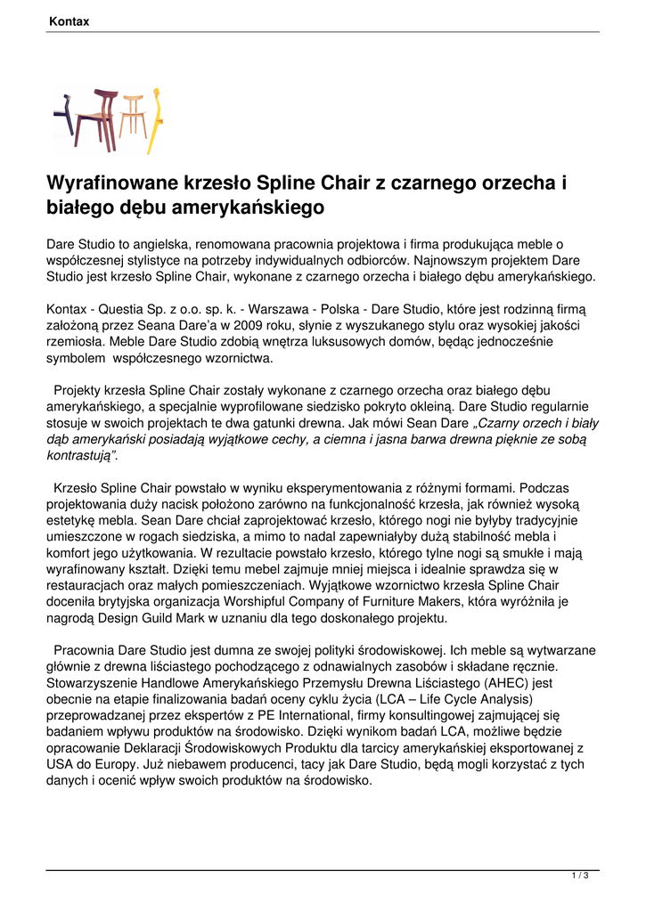 Kontax Wyrafinowane krzesło Spline Chair z czarnego orzecha i białego dębu amerykańskiego Dare Studio to angielska, renomowana pracownia projektowa i firma produkująca meble o współczesnej stylistyce na potrzeby indywidualnych odbiorców. Najnowszym projektem Dare Studio jest krzesło Spline Chair, wykonane z czarnego orzecha i białego dębu amerykańskiego. Kontax - Questia Sp. z o.o. sp. k. - Warszawa - Polska - Dare Studio, które jest rodzinną firmą założoną przez Seana Dare’a w 2009 roku, słynie z wyszukanego stylu oraz wysokiej jakości rzemiosła. Meble Dare Studio zdobią wnętrza luksusowych domów, będąc jednocześnie symbolem współczesnego wzornictwa. Projekty krzesła Spline Chair zostały wykonane z czarnego orzecha oraz białego dębu amerykańskiego, a specjalnie wyprofilowane siedzisko pokryto okleiną. Dare Studio regularnie stosuje w swoich projektach te dwa gatunki drewna. Jak mówi Sean Dare „Czarny orzech i biały dąb amerykański posiadają wyjątkowe cechy, a ciemna i jasna barwa drewna pięknie ze sobą kontrastują”. Krzesło Spline Chair powstało w wyniku eksperymentowania z różnymi formami. Podczas projektowania duży nacisk położono zarówno na funkcjonalność krzesła, jak również wysoką estetykę mebla. Sean Dare chciał zaprojektować krzesło, którego nogi nie byłyby tradycyjnie umieszczone w rogach siedziska, a mimo to nadal zapewniałyby dużą stabilność mebla i komfort jego użytkowania. W rezultacie powstało krzesło, którego tylne nogi są smukłe i mają wyrafinowany kształt. Dzięki temu mebel zajmuje mniej miejsca i idealnie sprawdza się w restauracjach oraz małych pomieszczeniach. Wyjątkowe wzornictwo krzesła Spline Chair doceniła brytyjska organizacja Worshipful Company of Furniture Makers, która wyróżniła je nagrodą Design Guild Mark w uznaniu dla tego doskonałego projektu. Pracownia Dare Studio jest dumna ze swojej polityki środowiskowej. Ich meble są wytwarzane głównie z drewna liściastego pochodzącego z odnawialnych zasobów i składane ręcznie. Stowarzyszenie Handlowe Amerykańskiego Przemysłu Drewna Liściastego (AHEC) jest obecnie na etapie finalizowania badań oceny cyklu życia (LCA – Life Cycle Analysis) przeprowadzanej przez ekspertów z PE International, firmy konsultingowej zajmującej się badaniem wpływu produktów na środowisko. Dzięki wynikom badań LCA, możliwe będzie opracowanie Deklaracji Środowiskowych Produktu dla tarcicy amerykańskiej eksportowanej z USA do Europy. Już niebawem producenci, tacy jak Dare Studio, będą mogli korzystać z tych danych i ocenić wpływ swoich produktów na środowisko. 1/3 Kontax Informacje o AHEC Stowarzyszenie Handlowe Amerykańskiego Przemysłu Drewna Liściastego (AHEC) jest wiodącą międzynarodową organizacją handlową, która reprezentuje amerykański przemysł drewna liściastego, w tym głównych eksporterów oraz wszystkie kluczowe stowarzyszenia zrzeszające producentów amerykańskiego drewna liściastego. AHEC koncentruje się na dostarczaniu informacji na temat dostępnych gatunków amerykańskiego drewna liściastego, źródeł jego pochodzenia oraz oferowanych produktów architektom, projektantom oraz użytkownikom. Więcej informacji znajduje się na stronie internetowej: www.americanhardwood .org. Biały dąb amerykański Drewno bielu białego dębu amerykańskiego jest koloru kremowobrązowego, a drewno twardzieli ma barwę od jasno do ciemnobrązowej. Ma najczęściej prosty układ włókien, o średnio szorstkiej lub chropowatej strukturze. W porównaniu z czerwonym dębem, biały dąb amerykański ma dłuższe promienie rdzeniowe, dzięki czemu rysunek jego włókien jest bardzo oryginalny i atrakcyjny. Biały dąb amerykański jest powszechnie dostępnym gatunkiem amerykańskiego drewna liściastego, często importowanym przez producentów mebli, podłóg i stolarki ze względu na jednolitą barwę oraz dostępność kantówek i forniru z tego surowca. Jego drewno jest twarde i ciężkie, wykazuje średnią odporność na gięcie i zgniatanie. Czarny orzech amerykański Drewno bielu czarnego orzecha amerykańskiego jest kremowobiałe, a drewno twardzieli ma kolor od jasnobrązowego do ciemnego czekoladowego brązu, na którym czasem pojawiają się ciemniejsze lub fioletowawe smugi. Ten gatunek drewna charakteryzuje się prostym układem włókien, choć może też wystąpić ich falistość. Czarny orzech amerykański jest bardzo modnym drewnem, używanym w produkcji mebli, szafek kuchennych, elementów wykończenia wnętrz oraz wysokiej klasy wyrobów stolarskich. Drewno orzecha jest twarde, wytrzymałe, o średniej gęstości, umiarkowanej wytrzymałości na zginanie i zgniecenia oraz niskiej sprężystości. Kontakt dla mediów: Belinda Cobden-Ramsay Stowarzyszenie Handlowe Amerykańskiego Przemysłu Drewna Liściastego (AHEC) tel.: +44 20 7 626 4111 e-mail: [email protected] lub Jarosław Soroczyński Questia Sp. z o.o. sp. k. Communications Management Consultants tel.: +48 22 623 07 00 e-mail: [email protected] 2/3 Kontax 3/3