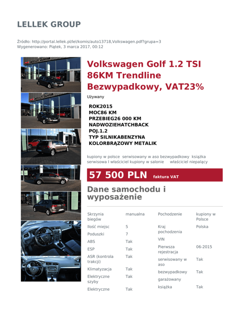 LELLEK GROUP Źródło: http://portal.lellek.pl/lel/komis/auto13718,Volkswagen.pdf?grupa=3 Wygenerowano: Piątek, 3 marca 2017, 00:12 Volkswagen Golf 1.2 TSI 86KM Trendline Bezwypadkowy, VAT23% Używany ROK2015 MOC86 KM PRZEBIEG26 000 KM NADWOZIEHATCHBACK POJ.1.2 TYP SILNIKABENZYNA KOLORBRĄZOWY METALIK kupiony w polsce serwisowany w aso bezwypadkowy książka serwisowa I właściciel kupiony w salonie właściciel niepalący 57 500 PLN faktura VAT Dane samochodu i wyposażenie Skrzynia biegów manualna Pochodzenie kupiony w Polsce Ilość miejsc 5 Polska Poduszki 7 Kraj pochodzenia ABS Tak ESP Tak ASR (kontrola trakcji) Tak Klimatyzacja Tak Elektryczne szyby Tak Elektryczne Tak VIN Pierwsza rejestracja 06-2015 serwisowany w aso Tak bezwypadkowy Tak garażowany książka Tak lusterka Handlowiec Wiesław Fiszer zapytaj mobile +48 663 000 673 Gwarancja Gwarancja dostępna Ubezpieczenie Ubezpieczenie dostępne Kredyt Kredyt dostępny serwisowa Wspomaganie kierownicy Tak I właściciel Tak Tak kupiony w salonie Tak Komputer Radioodtwarza cz Tak tunning Alarm Tak Immobilizer Tak Centralny zamek Tak Światła przeciwmgieln e Tak Czujnik deszczu Tak Czujniki parkowania Tak System Start-Stop Tak Asystent parkowania Tak Czujniki parkowania przód Tak Alufelgi Tak Miejsce postoju Gliwice ul. Portowa 2 homologacja stan idealny właściciel niepalący Opis dodatkowy Zeskanuj kod, aby zobaczyć ofertę online AUDI CENTRUM GLIWICE autoryzowany salon i serwis Audi LELLEK GROUP oferuje do sprzedania samochód VW Golf Trendline Samochód objęty programem AUDI SELECT PLUS sprawdzone 117 punktów w samochodzie gwarancja przebiegu i stanu technicznego Kolor nadwozia: Limestone/brąz metalizowany Tapicerka: Tkanina czarny/szary Pochodzenie: krajowy, I-właściciel, I-użytkownik I-rejestracja 30.06.2016 gwarancja fabryczna: do 06.2018r lub 90.000km Wyposażenie dodatkowe: Przyciemniane szyby w tylnej części nadwozia Tak Podłokietnik ze schowkiem Obudowy lusterek zewnętrznych i klamki w kolorze nadwozia Kierownica trójramienna oraz dźwignia hamulca ręcznego obszyta skórą Obręcze ze stopów lekkich "Lyon" 15" Czujnik deszczu - uruchamia oraz dopasowuje prędkość wycieraczek do panujących warunków Fotochromatyczne lusterko wsteczne Autoalarm z niezależnym zasilaniem (back-up-Horn), funkcją dozoru wnętrza i czujnikiem przechyłu Czujniki parkowania z przodu i tyłu z wizualizacja na ekranie radia System radiowy "Compostion Media" - 8 głośników, 5,8 - calowy, kolorowy ekran dotykowy, czytnik kart SD Klimatyzacja manualna Elektromechaniczny hamulec postojowy Elektryczne szyby dla kierowcy oraz pasażera Poduszka powietrzna chroniąca kolana kierowcy Poduszka powietrzna dla kierowcy oraz pasażera Kurtyny powietrzne chroniące głowy pasażerów podczas kolizji System Start/Stop Isofix Światła do jazdy dziennej PRZYJMUJEMY W ROZLICZENIU SAMOCHODY WSZYSTKICH MAREK!!! Kontakt: Wiesław Fiszer + 48 663 000 673, Mariusz Budziński +48 663 000 670 Adrian Gabor 032-335-92-83 Szanowny Kliencie przed przyjazdem upewnij się telefonicznie, że auto czeka na Twoją wizytę. Niniejsze ogłoszenie jest wyłącznie informacją handlową i nie stanowi oferty w myśl art. 66, §1. Kodeksu Cywilnego. Sprzedający nie odpowiada za ewentualne błędy lub nieaktualność ogłoszenia. Nota prawna Informacja nie stanowi oferty w rozumieniu art. 66 Kodeksu Cywilnego. Podane dane mają charakter wyłącznie informacyjny. Pełna informacja dostępna jest u handlowca. Sprzedający nie odpowiada za ewentualne błędy lub nieaktualność ogłoszenia.