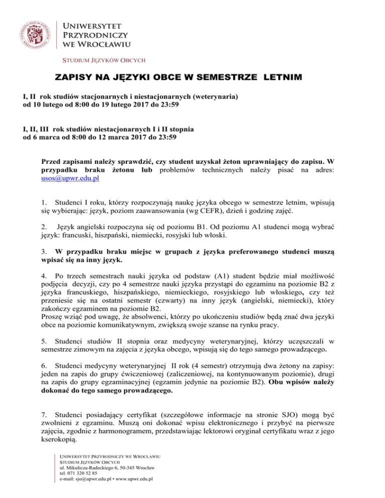 STUDIUM JĘZYKÓW OBCYCH ZAPISY NA JĘZYKI OBCE W SEMESTRZE LETNIM I, II rok studiów stacjonarnych i niestacjonarnych (weterynaria) od 10 lutego od 8:00 do 19 lutego 2017 do 23:59 I, II, III rok studiów niestacjonarnych I i II stopnia od 6 marca od 8:00 do 12 marca 2017 do 23:59 Przed zapisami należy sprawdzić, czy student uzyskał żeton uprawniający do zapisu. W przypadku braku żetonu lub problemów technicznych należy pisać na adres: [email protected] 1. Studenci I roku, którzy rozpoczynają naukę języka obcego w semestrze letnim, wpisują się wybierając: język, poziom zaawansowania (wg CEFR), dzień i godzinę zajęć. 2. Język angielski rozpoczyna się od poziomu B1. Od poziomu A1 studenci mogą wybrać język: francuski, hiszpański, niemiecki, rosyjski lub włoski. 3. W przypadku braku miejsc w grupach z języka preferowanego studenci muszą wpisać się na inny język. 4. Po trzech semestrach nauki języka od podstaw (A1) student będzie miał możliwość podjęcia decyzji, czy po 4 semestrze nauki języka przystąpi do egzaminu na poziomie B2 z języka francuskiego, hiszpańskiego, niemieckiego, rosyjskiego lub włoskiego, czy też przeniesie się na ostatni semestr (czwarty) na inny język (angielski, niemiecki), który zakończy egzaminem na poziomie B2. Proszę wziąć pod uwagę, że absolwenci, którzy po ukończeniu studiów będą znać dwa języki obce na poziomie komunikatywnym, zwiększą swoje szanse na rynku pracy. 5. Studenci studiów II stopnia oraz medycyny weterynaryjnej, którzy uczęszczali w semestrze zimowym na zajęcia z języka obcego, wpisują się do tego samego prowadzącego. 6. Studenci medycyny weterynaryjnej II rok (4 semestr) otrzymują dwa żetony na zapisy: jeden na zapis do grupy ćwiczeniowej (zaliczeniowej, na kontynuowanym poziomie), drugi na zapis do grupy egzaminacyjnej (egzamin jedynie na poziomie B2). Obu wpisów należy dokonać do tego samego prowadzącego. 7. Studenci posiadający certyfikat (szczegółowe informacje na stronie SJO) mogą być zwolnieni z egzaminu. Muszą oni dokonać wpisu elektronicznego i przybyć na pierwsze zajęcia, zgodnie z harmonogramem, przedstawiając lektorowi oryginał certyfikatu wraz z jego kserokopią. UNIWERSYTET PRZYRODNICZY WE WROCŁAWIU STUDIUM JĘZYKÓW OBCYCH ul. Mikulicza-Radeckiego 6, 50-345 Wrocław tel. 071 320 52 85 e-mail: [email protected] • www.upwr.edu.pl STUDIUM JĘZYKÓW OBCYCH 8. Na studiach II stopnia zgodnie z Rozporządzeniem Ministra zajęcia odbywają się na poziomie B2+. 9. Studenci studiów II stopnia – w przypadku języka francuskiego, hiszpańskiego i rosyjskiego wpisują się na poziom B2 do grup międzywydziałowych II0 niezależnie od semestru języka, który Państwo realizują. 10. Liczebność w grupach językowych wynosi maksymalnie 18 osób. 11. Ze względu na zbyt małą liczbę studentów, niektóre grupy mogą nie powstać. W takiej sytuacji student musi w sekretariacie SJO (pokój 206) przepisać się do innej grupy. 12. Prowadzący zajęcia w danej grupie może zostać zmieniony po zapisach (względy organizacyjne). 13. Studenci nie mogą zapisywać się na lektoraty kolidujące z innymi zajęciami. Nie wolno zlecać zapisu innej osobie. 14. Po zapisie na lektoraty student ma obowiązek sprawdzenia na swoim koncie poprawności dokonanego zapisu. W przypadku jakichkolwiek niezgodności z zapisem prosimy o natychmiastowe wyjaśnienie osobiście lub telefonicznie w SJO. 15. Każdy student ma obowiązek wpisywania się na język obcy zgodnie z Zarządzeniem Rektora 51/2016 z dnia 13 czerwca 2016 roku. Brak wpisu w terminie, oznacza brak możliwości uczestniczenia w zajęciach oraz brak zaliczenia w danym semestrze. mgr Ewa Hajdasz Dyrektor SJO UNIWERSYTET PRZYRODNICZY WE WROCŁAWIU STUDIUM JĘZYKÓW OBCYCH ul. Mikulicza-Radeckiego 6, 50-345 Wrocław tel. 071 320 52 85 e-mail: [email protected] • www.upwr.edu.pl
