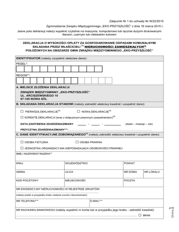 Załącznik Nr 1 do uchwały Nr III/22/2015 Zgromadzenia Związku Międzygminnego „EKO-PRZYSZŁOŚĆ” z dnia 16 marca 2015 r. Jasne pola deklaracji należy wypełnić czytelnie na maszynie, komputerowo lub ręcznie dużymi drukowanymi literami, czarnym lub niebieskim kolorem …......................................................................................................................................................................... DEKLARACJA O WYSOKOŚCI OPŁATY ZA GOSPODAROWANIE ODPADAMI KOMUNALNYMI (1) SKŁADANA PRZEZ WŁAŚCICIELI NIERUCHOMOŚCI ZAMIESZKAŁYCH(2) POŁOŻONYCH NA OBSZARZE GMIN ZWIĄZKU MIĘDZYGMINNEGO „EKO-PRZYSZŁOŚĆ” IDENTYFIKATOR (należy uzupełnić właściwe dane): PESEL*: REGON**: A. A. MIEJSCE ZŁOŻENIA DEKLARACJI: ZWIĄZEK MIĘDZYGMINNY „EKO-PRZYSZŁOŚĆ” UL. ARCISZEWSKIEGO 10 67-100 NOWA SÓL B. SKŁADANA DEKLARACJA STANOWI (należy zakreślić właściwy kwadrat i uzupełnić dane): □ PIERWSZĄ DEKLARACJĘ □ NOWĄ DEKLARACJĘ □ KOREKTĘ DEKLARACJI (wraz z dołączonym pisemnym uzasadnieniem) (3) (3) DATA ZAISTNIENIA ZDARZENIA/ZMIANY: - (4) - (dzień – miesiąc – rok) PRZYCZYNA ZDARZENIA/ZMIANY***:………………………………………………………………………………… C. DANE IDENTYFIKACYJNE ZOBOWIĄZANEGO (5) (należy zakreślić właściwy kwadrat i uzupełnić dane): □ OSOBA FIZYCZNA □ OSOBA PRAWNA □ JEDNOSTKA ORGANIZACYJNA NIEPOSIADAJĄCA OSOBOWOŚCI PRAWNEJ IMIĘ I NAZWISKO*/NAZWA** KRAJ WOJEWÓDZTWO POWIAT GMINA ULICA NR DOMU KOD POCZTOWY MIEJSCOWOŚĆ POCZTA NR LOKALU NR EWIDENCYJNY NIERUCHOMOŚCI W REJESTRZE GRUNTÓW: ……………………………………..………………………………………… (należy podać w przypadku braku nadania numeru nieruchomości) NR RACHUNKU BANKOWEGO (należy wypełnić nr konta lub w przypadku jego braku - zakreślić kwadrat): …………………………………………………………………………………………………………………….. □ BRAK 1 E-MAIL*** Strona NR TELEFONU*** C. 1. RODZAJ ZOBOWIĄZANEGO (5) (należy zakreślić właściwy kwadrat): □ WŁAŚCICIEL □ WSPÓLNOŚĆ MAJĄTKOWA MAŁŻEŃSKA □ WSPÓŁWŁAŚCICIEL – INNY □ SPÓŁDZIELNIA MIESZKANIOWA / WSPÓLNOTA MIESZKANIOWA □ INNY PODMIOT FAKTYCZNIE WŁADAJĄCY NIERUCHOMOŚCIĄ (wpisać jaki): …………………………………………………………………………………………………… C.2 DANE IDENTYFIKACYJNE POZOSTAŁYCH ZOBOWIĄZANYCH (należy wypełnić dane współwłaścicieli lub innych podmiotów faktycznie współwładających nieruchomością): IMIĘ I NAZWISKO*/ NAZWA** ADRES ZAMIESZKANIA*/ ADRES SIEDZIBY** PESEL*/REGON** NR TELEFONU*** D. MIESIĘCZNA OPŁATA ZA GOSPODAROWANIE ODPADAMI KOMUNALNYMI DLA NIERUCHOMOŚCI (2) ZAMIESZKAŁEJ : Oświadczam, że na terenie nieruchomości zamieszkałej odpady będą zbierane w sposób (należy zakreślić właściwy kwadrat): □ SELEKTYWNY □ NIESELEKTYWNY Wysokość opłaty dla nieruchomości zamieszkałych stanowi iloczyn liczby mieszkańców zamieszkujących nieruchomość oraz stawek opłat ustalonych uchwałą Zgromadzenia Związku Międzygminnego „EKO-PRZYSZŁOŚĆ”. Wysokość opłaty należy obliczyć w następujący sposób: liczba osób zamieszkujących nieruchomość (kolumna [1]) x stawka opłaty za osobę dla wybranego w części D. sposobu zbiórki odpadów komunalnych (kolumna [2]) = miesięczna wysokość opłaty (kolumna [3]) MIESIĘCZNA WYSOKOŚĆ OPŁATY: [2] □ zgłaszam kompostownik i rezygnuję z pojemnika na odpady biodegradowalne*** (można zakreślić kwadrat jedynie w przypadku wyboru zbiórki odpadów w sposób selektywny) [3]=[1]x[2] 2 [1] MIESIĘCZNA STAWKA OPŁATY ZA (6) MIESZKAŃĆA : Strona LICZBA OSÓB ZAMIESZKUJĄCYCH NIERUCHOMOŚĆ: E. ADRES NIERUCHOMOŚCI, Z KTÓREJ ODBIERANE BĘDĄ ODPADY KOMUNALNE (należy uzupełnić dane): KRAJ WOJEWÓDZTWO POWIAT GMINA ULICA NR DOMU KOD POCZTOWY MIEJSCOWOŚĆ POCZTA NR LOKALU NR EWIDENCYJNY NIERUCHOMOŚCI W REJESTRZE GRUNTÓW: ……………………………………..………………………………………. (należy podać w przypadku braku nadania numeru nieruchomości) F. DANE KORESPONDENCYJNE (należy zakreślić właściwy kwadrat): □ ZGODNE Z PODANYMI W CZĘŚCI C. □ INNE (należy wypełnić poniżej): IMIĘ I NAZWISKO*/NAZWA** KRAJ WOJEWÓDZTWO POWIAT GMINA ULICA NR DOMU KOD POCZTOWY MIEJSCOWOŚĆ POCZTA G. DANE PEŁNOMOCNIKA SKŁADAJĄCEGO DEKLARACJĘ NR LOKALU (7) IMIĘ I NAZWISKO PESEL NR TELEFONU*** E-MAIL*** H. OŚWIADCZENIE ORAZ PODPIS LUB PODPISY SKŁADAJĄCYCH DEKLARACJĘ: Oświadczam, że wskazane przeze mnie dane są zgodne ze stanem faktycznym. …........................................................................... (miejscowość i data) ........................................................................... (czytelny podpis lub podpisy ) Podstawa prawna: Ustawa z dnia 13 września 1996 r. o utrzymaniu czystości i porządku w gminach (t. j. Dz. U. z 2013 r. poz. 1399 z późn. zm.). Niniejsza deklaracja stanowi podstawę do wystawienia tytułu wykonawczego, zgodnie z przepisami ustawy z dnia 17 czerwca 1966 r. o postępowaniu egzekucyjnym w administracji (t.j.Dz.U.z 2014r. poz.1619 z późn. zm.). Strona 3 I. ADNOTACJE ORGANU Objaśnienia: * wypełnia tylko podmiot będący osobą fizyczną; ** wypełnia tylko podmiot nie będący osobą fizyczną; *** pola nieobowiązkowe. (1) właściciel nieruchomości to także współwłaściciel, użytkownik wieczysty oraz jednostki organizacyjne i osoby posiadające nieruchomości w zarządzie lub użytkowaniu, a także inne podmioty władające nieruchomością, a w przypadku nieruchomości wielolokalowej, w której ustanowiono odrębną własność lokalu obowiązki właściciela nieruchomości wspólnej oraz właściciela lokalu obciążają wspólnotę mieszkaniową lub spółdzielnię mieszkaniową. (2)