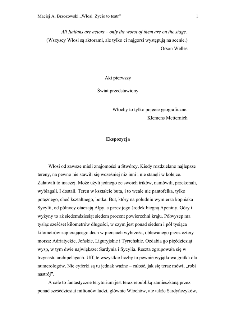 Maciej A. Brzozowski „Włosi. Życie to teatr” 1 All Italians are actors – only the worst of them are on the stage. (Wszyscy Włosi są aktorami, ale tylko ci najgorsi występują na scenie.) Orson Welles Akt pierwszy Świat przedstawiony Włochy to tylko pojęcie geograficzne. Klemens Metternich Ekspozycja Włosi od zawsze mieli znajomości u Stwórcy. Kiedy rozdzielano najlepsze tereny, na pewno nie stawili się wcześniej niż inni i nie stanęli w kolejce. Załatwili to inaczej. Może użyli jednego ze swoich trików, namówili, przekonali, wybłagali. I dostali. Teren w kształcie buta, i to wcale nie pantofelka, tylko potężnego, choć kształtnego, botka. But, który na południu wymierza kopniaka Sycylii, od północy otaczają Alpy, a przez jego środek biegną Apeniny. Góry i wyżyny to aż siedemdziesiąt siedem procent powierzchni kraju. Półwysep ma tysiąc sześćset kilometrów długości, w czym jest ponad siedem i pół tysiąca kilometrów zapierającego dech w piersiach wybrzeża, oblewanego przez cztery morza: Adriatyckie, Jońskie, Liguryjskie i Tyrreńskie. Ozdabia go pięćdziesiąt wysp, w tym dwie największe: Sardynia i Sycylia. Reszta zgrupowała się w trzynastu archipelagach. Uff, te wszystkie liczby to pewnie wyjątkowa gratka dla numerologów. Nie cyferki są tu jednak ważne – całość, jak się teraz mówi, „robi nastrój”. A całe to fantastyczne terytorium jest teraz republiką zamieszkaną przez ponad sześćdziesiąt milionów ludzi, głównie Włochów, ale także Sardyńczyków, Maciej A. Brzozowski „Włosi. Życie to teatr” 2 Tyrolczyków, Słoweńców, Albańczyków czy Francuzów. Kraj podzielony jest na dwadzieścia regionów. Pięć z nich (Dolina Aosty, Sycylia, Sardynia, TrydentGórna Adyga, Friuli-Wenecja Julijska) to tak zwane regiony specjalne (mają szerokie kompetencje ustawodawcze i wykonawcze), ale i tak różnorodność, krajobrazowa, kulturowa, gastronomiczna czy wreszcie lingwistyczna sprawia, że każdy region wydaje się oddzielnym państwem. Co ma zresztą swoje uwarunkowania w historii Półwyspu Apenińskiego, który teraz nazywamy Włochami. Włochy niemal w całości leżą w strefie klimatu podzwrotnikowego w jego śródziemnomorskiej odmianie. Ale typowy klimat śródziemnomorski nie występuje nigdzie poza wąskim pasem wybrzeża: ani w centrum kraju, ani w górach. Stąd – często – gorące lata, dokuczliwe, chłodne i deszczowe zimy, na północy kraju w dodatku śnieżne, a osławiona włoska pogoda wcale nie jest aż tak wyjątkowa – lubi zaskakiwać chłodem w maju czy wrześniu, powala tropikalnymi upałami i wilgocią w czerwcu. W rzeczywistości klimat Włoch północnych jest mniej więcej taki sam jak ten w większości krajów Europy kontynentalnej. W Mediolanie i Turynie jest chłodniej zimą niż w Kopenhadze, cieplej latem niż w La Valletcie czy Algierze. Włochy środkowe i południowe mają mniej więcej ten sam klimat co inne kraje śródziemnomorskie – na wybrzeżu bardziej łagodny niż w głębi lądu, z pewnością nie tak dobry zimą jak w Hongkongu czy na Krymie. Zima jest o wiele przyjemniejsza w Egipcie, na Florydzie czy na Saharze […]. Rzym wszyscy znają z powodu warunków klimatycznych, jednych z najbardziej nieprzyjemnych na świecie: sirocco wieje przez prawie dwieście dni w roku. Ten duszący ciepły wietrzyk, który wypełnia niebo niskimi, szarymi chmurami nasączonymi wilgocią, sprawia, że grzyb pojawia się wszędzie, pokrywa ściany plamami wilgoci, a ludzie czują się zmęczeni, podenerwowani, otumanieni. Maciej A. Brzozowski „Włosi. Życie to teatr” Tak podsumowuje klimatyczne uroki półwyspu dziennikarz Luigi Barzini w książce Gli Italiani (Włosi)1. Ale tak do końca nie powinniśmy mu wierzyć. Jak przystało na Włocha – trochę dramatyzuje. Nam, podobnie jak i innym przybyszom z północy, apeniński klimat najczęściej kojarzy się z rajem. 3