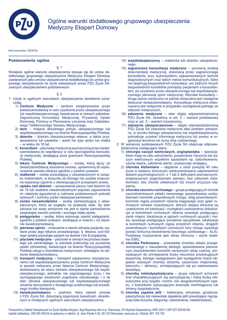 Ogólne warunki dodatkowego grupowego ubezpieczenia Medyczny Ekspert Domowy Kod warunków: KZGP32 Postanowienia ogólne § 1 Niniejsze ogólne warunki ubezpieczenia stosuje się do umów dodatkowego grupowego ubezpieczenia Medyczny Ekspert Domowy zawieranych jako umowy ubezpieczenia dodatkowego do umów grupowego ubezpieczenia na życie wskazanych przez PZU Życie SA, zwanych ubezpieczeniem podstawowym. § 2 1. Użyte w ogólnych warunkach ubezpieczenia określenia oznaczają: 1) Centrum Medyczne – centrum zorganizowane przez świadczeniodawcę w celu uzyskania przez ubezpieczonego lub współubezpieczonego świadczenia w ramach pakietów: Zagranicznej Konsultacji Medycznej, Prywatnej Opieki Domowej, Pomocy w Planowaniu Leczenia oraz Całodobowego Telefonicznego Serwisu Medycznego, 2) dom – miejsce aktualnego pobytu ubezpieczonego lub współubezpieczonego na terenie Rzeczypospolitej Polskiej, 3) dziecko – dziecko ubezpieczonego własne, a także przysposobione lub pasierba – jeżeli nie żyje ojciec lub matka – w wieku do 18 lat, 4) konsultant – placówkę medyczną wyznaczoną przez świadczeniodawcę do współpracy w celu sporządzenia konsultacji medycznej, działającą poza granicami Rzeczypospolitej Polskiej, 5) lekarz Centrum Medycznego – osobę, którą łączy ze świadczeniodawcą stosowna umowa, uprawnioną do wykonywania zawodu lekarza zgodnie z polskim prawem, 6) małżonek – osobę pozostającą z ubezpieczonym w związku małżeńskim, w stosunku do którego nie została orzeczona separacja zgodnie z obowiązującymi przepisami prawa, 7) opieka nad dziećmi – sprawowanie pieczy nad dziećmi do lat 15 lub osobami niesamodzielnymi poprzez zapewnienie im należytej egzystencji w zakresie podstawowych potrzeb bytowych i ochrony przed niebezpieczeństwami, 8) osoba niesamodzielna – osobę zamieszkującą z ubezpieczonym, która ze względu na podeszły wiek, zły stan zdrowia lub wady wrodzone nie jest w stanie samodzielnie zaspokajać swoich potrzeb i wymaga stałej opieki, 9) pielęgniarka – osobę, która wykonuje zawód pielęgniarki, zgodnie z polskim prawem, działającą w imieniu i na zlecenie świadczeniodawcy, 10) pierwsza opinia – orzeczenie o stanie zdrowia pacjenta, wydane przez jego lekarza prowadzącego, tj. lekarza, pod którego opieką pozostaje pacjent na terenie Unii Europejskiej, 11) placówki medyczne – placówki w ramach lecznictwa otwartego lub zamkniętego, w zakresie publicznej lub prywatnej opieki zdrowotnej, świadczące na terenie Rzeczypospolitej Polskiej usługi o charakterze medycznym, działające na zlecenie świadczeniodawcy, 12) transport medyczny – transport zapewniony ubezpieczonemu lub współubezpieczonemu przez Centrum Medyczne w sposób wskazany przez lekarza Centrum Medycznego, dostosowany do stanu zdrowia ubezpieczonego lub współubezpieczonego, jednakże nie zagrażającego życiu i nie wymagającego świadczeń pogotowia ratunkowego i o ile stan zdrowia ubezpieczonego lub współubezpieczonego utrudnia skorzystanie z dostępnego publicznego lub prywatnego środka transportu, 13) świadczeniodawca – podmiot, który zawarł umowę z PZU Życie SA, dotyczącą organizacji świadczeń, określonych w niniejszych ogólnych warunkach ubezpieczenia, 14) współubezpieczony – małżonka lub dziecko ubezpieczonego, 15) zagraniczna konsultacja medyczna – ponowną analizę dokumentacji medycznej, dokonaną przez zagranicznego konsultanta, przy wykorzystaniu zaawansowanych technik diagnostycznych oraz takich metod komunikacyjnych, które nie obejmują bezpośrednich konsultacji, ani żadnych innych bezpośrednich kontaktów pomiędzy pacjentem a konsultantem, po uzyskaniu przez ubezpieczonego lub współubezpieczonego pierwszej opinii medycznej. Rezultat konsultacji – druga opinia medyczna na piśmie doręczana jest następnie lekarzowi świadczeniodawcy. Konsultacja medyczna dokonywana jest wyłącznie w przypadku wystąpienia jednego ze zdarzeń medycznych, 16) zdarzenie medyczne – stan objęty odpowiedzialnością PZU Życie SA, określony w ust. 2 – wariant podstawowy oraz w ust. 3 – wariant rozszerzony, 17) zdarzenie ubezpieczeniowe – objęte odpowiedzialnością PZU Życie SA zdarzenie medyczne albo problem zdrowotny, w wyniku którego ubezpieczony lub współubezpieczony potrzebuje uzyskać informację medyczną lub pomoc w organizacji leczenia lub życia dnia codziennego. 2. W wariancie podstawowym PZU Życie SA obejmuje odpowiedzialnością następujące stany: 1) chirurgia naczyń wieńcowych, angioplastyka – operacje, które mają na celu udrożnienie, poszerzenie naczynia lub naczyń wieńcowych wszelkimi sposobami np. balonikowanie, użycie lasera, założenie stentu, przeszczep omijający, 2) choroba Alzheimera – otępienie u osób powyżej 40 roku życia w badaniu klinicznym udokumentowane odpowiednimi testami psychologicznymi, z 1 lub 2 deficytami poznawczymi, progresywnym pogorszeniem pamięci, bez zaburzeń świadomości, bez chorób układowych lub innych przyczyn otępienia, 3) choroba neuronu ruchowego – grupa postępujących chorób zwyrodnieniowych układu nerwowego spowodowana uszkodzeniem komórek piramidowych mózgu, dróg piramidowych, komórek rogów przednich rdzenia kręgowego oraz jąder ruchowych nerwów czaszkowych, których objawy kliniczne są uzależnione od lokalizacji i rozległości uszkodzenia (lokalizacja w komórkach ruchowych rdzenia wywołuje postępujący zanik mięśni, lokalizacja w jądrach ruchowych opuszki i mostu wywołuje postępujące porażenie opuszkowe, lokalizacja w komórkach ruchowych rogów przednich rdzenia, drogach piramidowych i komórkach ruchowych kory mózgu wywołuje postać kliniczną stwardnienia bocznego zanikowego – SLA). Podstawą rozpoznania jest obraz kliniczny i wynik badania EMG, 4) choroba Parkinsona – przewlekła choroba układu pozapiramidowego o nieustalonej etiologii, spowodowana pierwotnym zwyrodnieniem komó