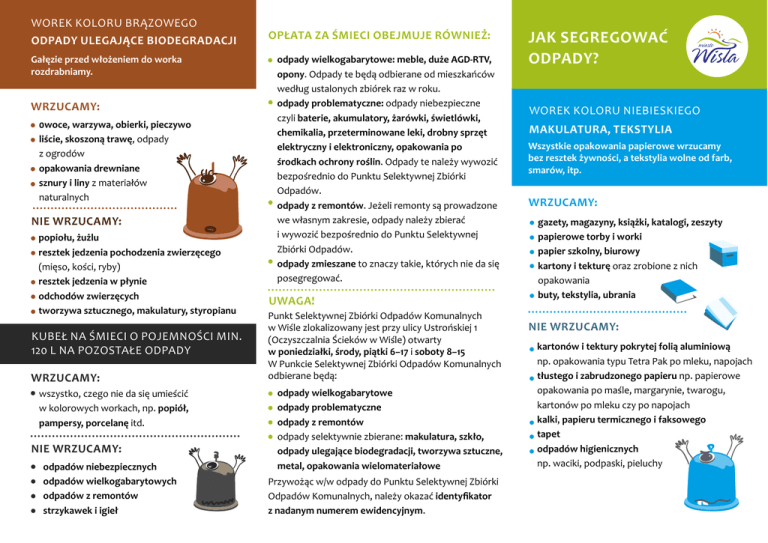 WOREK KOLORU BRĄZOWEGO ODPADY ULEGAJĄCE BIODEGRADACJI Gałęzie przed włożeniem do worka rozdrabniamy. WRZUCAMY: 0woce, warzywa, obierki, pieczywo liście, skoszoną trawę, odpady z ogrodów opakowania drewniane sznury i liny z materiałów naturalnych NIE WRZUCAMY: popiołu, żużlu resztek jedzenia pochodzenia zwierzęcego (mięso, kości, ryby) resztek jedzenia w płynie odchodów zwierzęcych tworzywa sztucznego, makulatury, styropianu KUBEŁ NA ŚMIECI O POJEMNOŚCI MIN. 120 L NA POZOSTAŁE ODPADY WRZUCAMY: wszystko, czego nie da się umieścić w kolorowych workach, np. popiół, pampersy, porcelanę itd. NIE WRZUCAMY: odpadów niebezpiecznych odpadów wielkogabarytowych odpadów z remontów strzykawek i igieł OPŁATA ZA ŚMIECI OBEJMUJE RÓWNIEŻ: odpady wielkogabarytowe: meble, duże AGD-RTV, opony. Odpady te będą odbierane od mieszkańców według ustalonych zbiórek raz w roku. odpady problematyczne: odpady niebezpieczne czyli baterie, akumulatory, żarówki, świetlówki, chemikalia, przeterminowane leki, drobny sprzęt elektryczny i elektroniczny, opakowania po środkach ochrony roślin. Odpady te należy wywozić bezpośrednio do Punktu Selektywnej Zbiórki Odpadów. odpady z remontów. Jeżeli remonty są prowadzone we własnym zakresie, odpady należy zbierać i wywozić bezpośrednio do Punktu Selektywnej Zbiórki Odpadów. odpady zmieszane to znaczy takie, których nie da się posegregować. UWAGA! Punkt Selektywnej Zbiórki Odpadów Komunalnych w Wiśle zlokalizowany jest przy ulicy Ustrońskiej 1 (Oczyszczalnia Ścieków w Wiśle) otwarty w poniedziałki, środy, piątki 6–17 i soboty 8–15 W Punkcie Selektywnej Zbiórki Odpadów Komunalnych odbierane będą: odpady wielkogabarytowe odpady problematyczne odpady z remontów odpady selektywnie zbierane: makulatura, szkło, odpady ulegające biodegradacji, tworzywa sztuczne, metal, opakowania wielomateriałowe Przywożąc w/w odpady do Punktu Selektywnej Zbiórki Odpadów Komunalnych, należy okazać identyfikator z nadanym numerem ewidencyjnym. JAK SEGREGOWAĆ ODPADY? WOREK KOLORU NIEBIESKIEGO MAKULATURA, TEKSTYLIA Wszystkie opakowania papierowe wrzucamy bez resztek żywności, a tekstylia wolne od farb, smarów, itp. WRZUCAMY: gazety, magazyny, książki, katalogi, zeszyty papierowe torby i worki papier szkolny, biurowy kartony i tekturę oraz zrobione z nich opakowania buty, tekstylia, ubrania NIE WRZUCAMY: kartonów i tektury pokrytej folią aluminiową np. opakowania typu Tetra Pak po mleku, napojach tłustego i zabrudzonego papieru np. papierowe opakowania po maśle, margarynie, twarogu, kartonów po mleku czy po napojach kalki, papieru termicznego i faksowego tapet odpadów higienicznych np. waciki, podpaski, pieluchy WOREK KOLORU ZIELONEGO SZKŁO WOREK KOLORU ŻÓŁTEGO TWORZYWA SZTUCZNE, METAL WOREK KOLORU POMARAŃCZOWEGO OPAKOWANIA WIELOMATERIAŁOWE Wszystkie opakowania szklane wrzucamy bez kapsli, nakrętek i resztek! Wrzucamy tylko dokładnie opróżnione opakowania! Wszystkie opakowania wrzucamy dokładnie opróżnione! WRZUCAMY: WRZUCAMY: WRZUCAMY: szklane butelki po sokach i napojach słoiki po dżemach i przetworach opakowania szklane po pokarmach dla dzieci szklane butelki po napojach alkoholowych szklane opakowania po kosmetykach NIE WRZUCAMY: luster, szkła okiennego i zbrojonego porcelany, ceramiki, płytek ceramicznych doniczek (plastikowych czy ceramicznych) wyrobów ze szkła kryształowego zakrętek, kapsli, korków żarówek, świetlówek, lamp jarzeniowych kineskopów naczyń żaroodpornych (luminarc, arcoroc, itp.) szyb okiennych i samochodowych puste, odkręcone i zgniecione butelki plastikowe po napojach np. typu PET puste butelki plastikowe po kosmetykach i środkach czystości plastikowe opakowania po żywności np. po jogurtach, serkach, kefirach, margarynach plastikowe zakrętki folię i torebki z tworzyw sztucznych puszki po napojach, konserwach drobny złom żelazny oraz d robny złom metali kolorowych NIE WRZUCAMY: butelek po olejach spożywczych i samochodowych opakowań po olejach s pożywczych czy silnikowych, smarach styropianu, gumy butelek z jakąkolwiek zawartością puszek po farbach, baterii, o pakowań po aerozolach, l ekach opakowań po środkach chwasto- i owadobójczych sprzętu AGD opakowania po mleku (tzw. Tetra Pak) opakowania po sokach i napojach (tzw. Tetra Pak) opakowania po zupkach opakowania po przyprawach opakowania po lekarstwach, pigułkach NIE WRZUCAMY: opakowań po lekarstwach w postaci płynnej np. po syropach tworzyw piankowych, styropianu i naczyń jednorazowych styropianowych opakowań z zawartością np. z resztkami żywności, wapnem, cementem papierowych wkładów wodoodpornych pieluch jednorazowych i wielomateriałowych artykułów higienicznych W celu uzyskania szerszych informacji skontaktuj się z nami pod numerem tel 33 851 38 86, wysyłając e-mail [email protected] lub na stronie www.wisla.pl