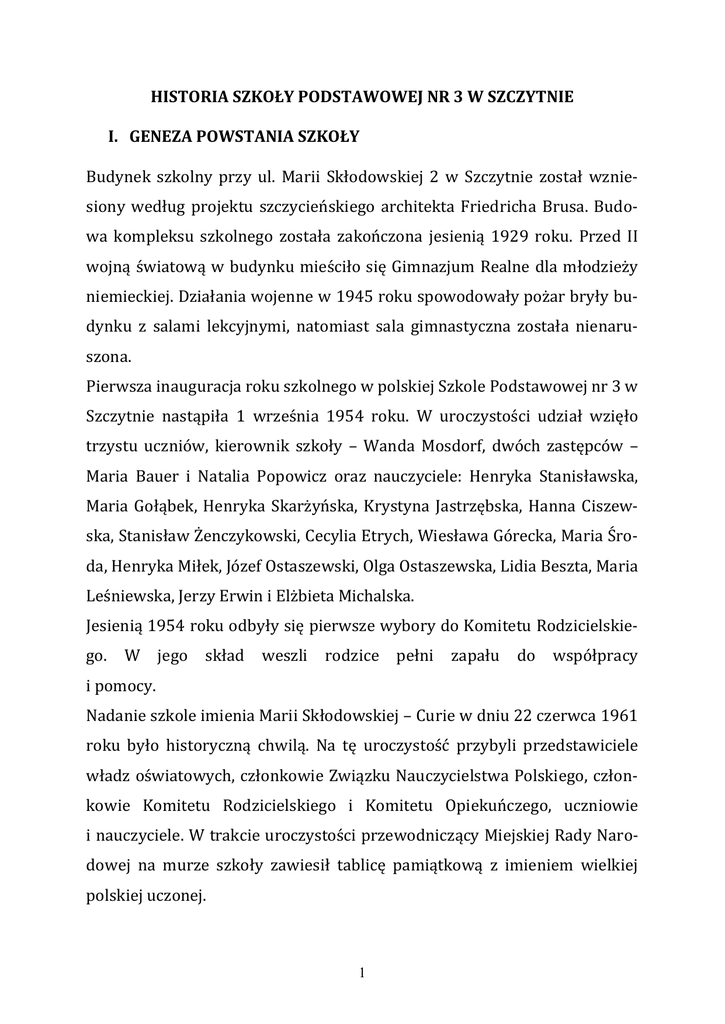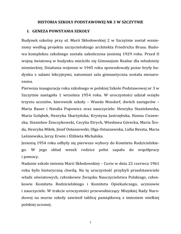 HISTORIA SZKOŁY PODSTAWOWEJ NR 3 W SZCZYTNIE I. GENEZA POWSTANIA SZKOŁY Budynek szkolny przy ul. Marii Skłodowskiej 2 w Szczytnie został wzniesiony według projektu szczycieńskiego architekta Friedricha Brusa. Budowa kompleksu szkolnego została zakończona jesienią 1929 roku. Przed II wojną światową w budynku mieściło się Gimnazjum Realne dla młodzieży niemieckiej. Działania wojenne w 1945 roku spowodowały pożar bryły budynku z salami lekcyjnymi, natomiast sala gimnastyczna została nienaruszona. Pierwsza inauguracja roku szkolnego w polskiej Szkole Podstawowej nr 3 w Szczytnie nastąpiła 1 września 1954 roku. W uroczystości udział wzięło trzystu uczniów, kierownik szkoły – Wanda Mosdorf, dwóch zastępców – Maria Bauer i Natalia Popowicz oraz nauczyciele: Henryka Stanisławska, Maria Gołąbek, Henryka Skarżyńska, Krystyna Jastrzębska, Hanna Ciszewska, Stanisław Żenczykowski, Cecylia Etrych, Wiesława Górecka, Maria Środa, Henryka Miłek, Józef Ostaszewski, Olga Ostaszewska, Lidia Beszta, Maria Leśniewska, Jerzy Erwin i Elżbieta Michalska. Jesienią 1954 roku odbyły się pierwsze wybory do Komitetu Rodzicielskiego. W jego skład weszli rodzice pełni zapału do współpracy i pomocy. Nadanie szkole imienia Marii Skłodowskiej – Curie w dniu 22 czerwca 1961 roku było historyczną chwilą. Na tę uroczystość przybyli przedstawiciele władz oświatowych, członkowie Związku Nauczycielstwa Polskiego, członkowie Komitetu Rodzicielskiego i Komitetu Opiekuńczego, uczniowie i nauczyciele. W trakcie uroczystości przewodniczący Miejskiej Rady Narodowej na murze szkoły zawiesił tablicę pamiątkową z imieniem wielkiej polskiej uczonej. 1 Podczas akademii pierwszomajowej w 1968 roku nastąpiło uroczyste wręczenie sztandaru ufundowanego przez Komitet Rodzicielski. Jubileusz 25-lecia działalności szkoły odbył się w październiku 1979 roku. Na uroczystą akademię przybyły władze oświatowe, działacze Związku Polaków w Niemczech, pracownicy szkół polskich z terenu Warmii i Mazur, uczniowie i nauczyciele. Podczas uroczystości nagrodzono wyróżniających się nauczycieli odznaką „Zasłużonym dla Warmii i Mazur”, a albumy „Spod Znaku Rodła” wręczono nauczycielom pracującym w placówce od pierwszych dni jej działalności. Kolejnym, niezmiernie ważnym wydarzeniem było uzyskanie w dniu 11 czerwca 1990 roku miana Szkoły Grunwaldu. Miano to przyznawano tym placówkom, które były przodujące w nauczaniu, wychowaniu jak również w opiece nad młodzieżą, a także postępowały zgodnie z normami etycznymi. Szkoła została uznana za najlepszą szkołę w mieście i w powiecie. W roku szkolnym 1994/1995 miała miejsce uroczystość 40-lecia działalności szkoły, na którą przybyło wiele zaproszonych gości z Kuratorium Oświaty i Wychowania, Urzędu Miasta, absolwentów oraz nauczycieli, którzy przed czterdziestoma laty rozpoczynali pracę w tej szkole. Zawiadomieniem Warmińsko - Mazurskiego Wojewódzkiego Konserwatora Zabytków w Olsztynie wszczęto z urzędu postępowanie administracyjne w sprawie wpisania do rejestru zabytków: budynek Szkoły Podstawowej nr 3 przy ul. Marii Skłodowskiej - Curie 2 w Szczytnie. II. BAZA LOKALOWA W pierwszym roku nauki w szkole do dyspozycji uczniów i nauczycieli przeznaczono 15 izb lekcyjnych, salę gimnastyczną, kuchnię, świetlicę, która w porze obiadowej pełniła rolę stołówki, pokój dla nauczycieli, szatnię, gabinet kierownika szkoły, wygospodarowano nawet miejsce na harcówkę. W tym czasie warunki do nauki były trudne, w szkole nie było centralnego 2 ogrzewania. W okresie jesienno – zimowym zajęcia lekcyjne odbywały się w sali gimnastycznej. Z każdym rokiem szkolnym przybywało uczniów i w placówce sukcesywnie uruchamiano kolejne pomieszczenia. Zwiększyła się liczba sal lekcyjnych do 23. Tworzono gabinety przedmiotowe: biologiczny, chemiczny, fizyczny, historyczny, geograficzny, matematyczny, muzyczny, języka polskiego, języka rosyjskiego, pracy - techniki dla dziewcząt i chłopców. Każdy z gabinetów wyposażony był w pomoce naukowe, które sukcesywnie uzupełniano. Założono bibliotekę a z czasem zaadaptowano część korytarza na czytelnię dla uczniów. Wygospodarowano dwa pomieszczenia do prowadzenia zajęć dydaktyczno - wyrównawczych i salę do gimnastyki korekcyjnej, którą wyposażono w materace, ławeczki i drabinki gimnastyczne do specjalistycznych ćwiczeń. W zaadaptowanej części strychu wydzielono salę do tenisa stołowego, która wyposażona jest w dwa stoły. W szkole przez wiele lat był gabinet stomatologiczny i lekarski. Poprzez wprowadzanie różnorodnych reform w służbie zdrowia, od paru lat funkcjonuje tylko gabinet higienistki szkolnej. Dla pedagoga szkolnego w 1979 roku oraz logopedy w 2004 roku wygospodarowano pomieszczenia na gabinety do prowadzenia konsultacji z uczniami potrzebującymi pomocy specjalistycznej. W latach osiemdziesiątych założono Izbę Tradycji Szkoły, w której gromadzone były pamiątki związane ze szkołą od początku jej istnienia, albumy, medale, dyplomy, wyróżnienia i nagrody. Goście odwiedzający szkołę w związku z obchodzonymi w placówce uroczystościami dokonywali wpisu w księdze pamiątkowej wyłożonej w tym miejscu. Z biegiem lat eksponaty przeniesiono do gabinetu historii a w tym pomieszczeniu powstał szkolny radiowęzeł. 3 Poprzez modernizację niektórych pomieszczeń powstała nowa szatnia dla uczniów, pokój nauczycieli wychowania fizycznego oraz pracownia informatyki, która w roku szkolnym 1991/1992 wyposażona była w dwa komputery „386” i jeden komputer „Atarii”. Przy tak skromnym wyposażeniu pracowni odbywały się tylko zajęcia pozalekcyjne dla nielicznej grupy uczniów a także zajęcia dla pracowników szkoły. W kolejnych latach liczba komputerów w pracowni informatyki sukcesywnie wzrasta i osiąga liczbę czternastu sztuk. Dla uczniów z 
