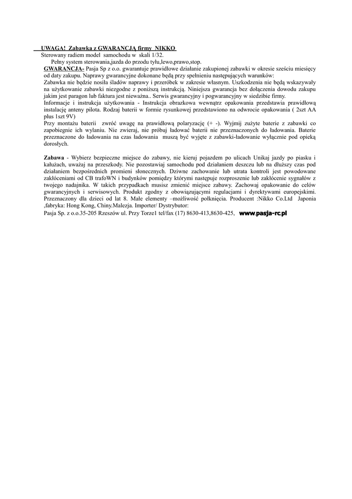 UWAGA! Zabawka z GWARANCJĄ firmy NIKKO Sterowany radiem model samochodu w skali 1/32. Pełny system sterowania,jazda do przodu tyłu,lewo,prawo,stop. GWARANCJA- Pasja Sp z o.o. gwarantuje prawidłowe działanie zakupionej zabawki w okresie sześciu miesięcy od daty zakupu. Naprawy gwarancyjne dokonane będą przy spełnieniu następujących warunków: Zabawka nie będzie nosiła śladów naprawy i przeróbek w zakresie własnym. Uszkodzenia nie będą wskazywały na użytkowanie zabawki niezgodne z poniższą instrukcją. Niniejsza gwarancja bez dołączenia dowodu zakupu jakim jest paragon lub faktura jest nieważna.. Serwis gwarancyjny i pogwarancyjny w siedzibie firmy. Informacje i instrukcja użytkowania - Instrukcja obrazkowa wewnątrz opakowania przedstawia prawidłową instalację anteny pilota. Rodzaj baterii w formie rysunkowej przedstawiono na odwrocie opakowania ( 2szt AA plus 1szt 9V) Przy montażu baterii zwróć uwagę na prawidłową polaryzację (+ -). Wyjmij zużyte baterie z zabawki co zapobiegnie ich wylaniu. Nie zwieraj, nie próbuj ładować baterii nie przeznaczonych do ładowania. Baterie przeznaczone do ładowania na czas ładowania muszą być wyjęte z zabawki-ładowanie wyłącznie pod opieką dorosłych. Zabawa - Wybierz bezpieczne miejsce do zabawy, nie kieruj pojazdem po ulicach Unikaj jazdy po piasku i kałużach, uważaj na przeszkody. Nie pozostawiaj samochodu pod działaniem deszczu lub na dłuższy czas pod działaniem bezpośrednich promieni słonecznych. Dziwne zachowanie lub utrata kontroli jest powodowane zakłóceniami od CB trafoWN i budynków pomiędzy którymi następuje rozproszenie lub zakłócenie sygnałów z twojego nadajnika. W takich przypadkach musisz zmienić miejsce zabawy. Zachowaj opakowanie do celów gwarancyjnych i serwisowych. Produkt zgodny z obowiązującymi regulacjami i dyrektywami europejskimi. Przeznaczony dla dzieci od lat 8. Małe elementy –możliwość połknięcia. Producent :Nikko Co.Ltd Japonia ,fabryka: Hong Kong, Chiny.Malezja. Importer/ Dystrybutor: Pasja Sp. z o.o.35-205 Rzeszów ul. Przy Torze1 tel/fax (17) 8630-413,8630-425, www.pasja-rc.pl