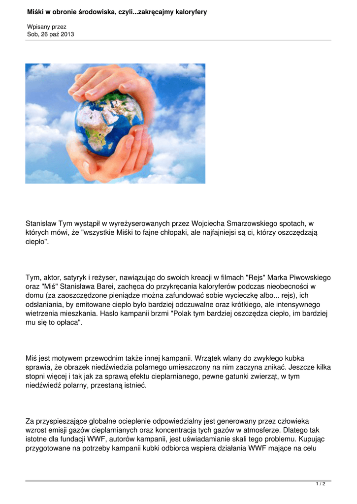 Miśki w obronie środowiska, czyli...zakręcajmy kaloryfery Wpisany przez Sob, 26 paź 2013 Stanisław Tym wystąpił w wyreżyserowanych przez Wojciecha Smarzowskiego spotach, w których mówi, że "wszystkie Miśki to fajne chłopaki, ale najfajniejsi są ci, którzy oszczędzają ciepło". Tym, aktor, satyryk i reżyser, nawiązując do swoich kreacji w filmach "Rejs" Marka Piwowskiego oraz "Miś" Stanisława Barei, zachęca do przykręcania kaloryferów podczas nieobecności w domu (za zaoszczędzone pieniądze można zafundować sobie wycieczkę albo... rejs), ich odsłaniania, by emitowane ciepło było bardziej odczuwalne oraz krótkiego, ale intensywnego wietrzenia mieszkania. Hasło kampanii brzmi "Polak tym bardziej oszczędza ciepło, im bardziej mu się to opłaca". Miś jest motywem przewodnim także innej kampanii. Wrzątek wlany do zwykłego kubka sprawia, że obrazek niedźwiedzia polarnego umieszczony na nim zaczyna znikać. Jeszcze kilka stopni więcej i tak jak za sprawą efektu cieplarnianego, pewne gatunki zwierząt, w tym niedźwiedź polarny, przestaną istnieć. Za przyspieszające globalne ocieplenie odpowiedzialny jest generowany przez człowieka wzrost emisji gazów cieplarnianych oraz koncentracja tych gazów w atmosferze. Dlatego tak istotne dla fundacji WWF, autorów kampanii, jest uświadamianie skali tego problemu. Kupując przygotowane na potrzeby kampanii kubki odbiorca wspiera działania WWF mające na celu 1/2 Miśki w obronie środowiska, czyli...zakręcajmy kaloryfery Wpisany przez Sob, 26 paź 2013 ochronę wybranych gatunków przed zagładą. Pomysł na kampanię nie jest innowacyjny, pojawiał się już w przeszłości, z pewnością jednak każda forma dotarcia do odbiorcy, w tym z wykorzystaniem przedmiotów codziennego użytku, może mieć znaczenie. Jak mówi Tobiasz Adamczewski z WWF Polska, wpływ człowieka na globalne ocieplenie nie jest kwestią wiary, ale potwierdzonym przez 97% naukowców faktem. Źródło: www.kampaniespoleczne.pl 2/2