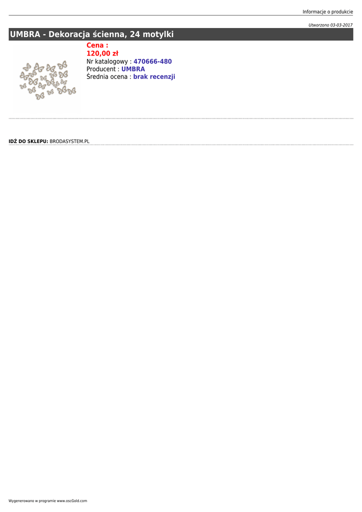 Informacje o produkcie Utworzono 03-03-2017 UMBRA - Dekoracja ścienna, 24 motylki Cena : 120,00 zł Nr katalogowy : 470666-480 Producent : UMBRA Średnia ocena : brak recenzji IDŹ DO SKLEPU: BRODASYSTEM.PL Wygenerowano w programie www.oscGold.com