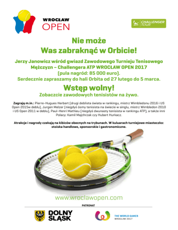 ATP TM CHALLENGER TOUR Zawodowy Turniej Tenisowy Mê¿czyzn Challenger ATP 15–21 lutego 2016, hala Orbita Nie może Was zabraknąć w Orbicie! Zawodowy Turniej Tenisowy Mê¿czyzn Challenger ATP 15–21 lutego 2016, hala Orbita Jerzy Janowicz wśród gwiazd Zawodowego Turnieju Tenisowego Mężczyzn – Challengera ATP WROCŁAW OPEN 2017 (pula nagród: 85 000 euro). Serdecznie zapraszamy do hali Orbita od 27 lutego do 5 marca. Wstęp wolny! Zobaczcie zawodowych tenisistów na żywo. Zagrają m.in.: Pierre-Hugues Herbert (drugi deblista świata w rankingu, mistrz Wimbledonu 2016 i US Open 2015w deblu), Jurgen Melzer (niegdyś ósmy tenisista na świecie w singlu, mistrz Wimbledon 2010 i US Open 2011 w deblu), Paul-Henri Mathieu (niegdyś dwunasty tenisista w rankingu ATP), a także inni Polacy: Kamil Majchrzak czy Hubert Hurkacz. Atrakcje i nagrody czekają na kibiców obecnych na trybunach. W kuluarach turniejowe miasteczko: stoiska handlowe, sponsorskie i gastronomiczne. www.wroclawopen.com PATRONAT