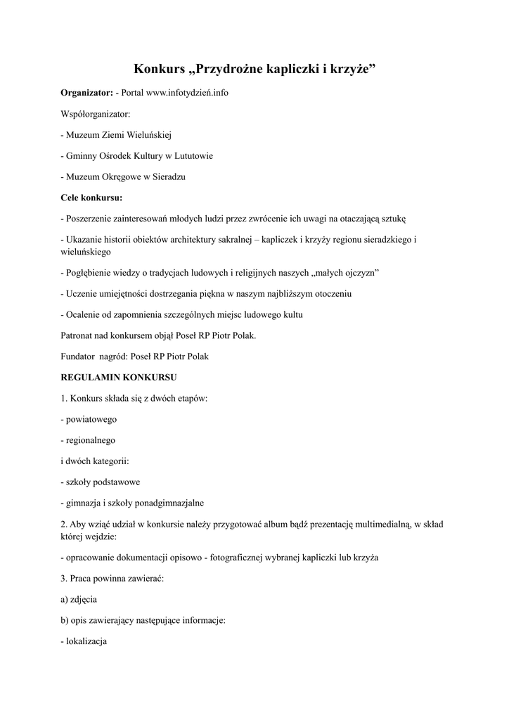 Konkurs „Przydrożne kapliczki i krzyże” Organizator: - Portal www.infotydzień.info Współorganizator: - Muzeum Ziemi Wieluńskiej - Gminny Ośrodek Kultury w Lututowie - Muzeum Okręgowe w Sieradzu Cele konkursu: - Poszerzenie zainteresowań młodych ludzi przez zwrócenie ich uwagi na otaczającą sztukę - Ukazanie historii obiektów architektury sakralnej – kapliczek i krzyży regionu sieradzkiego i wieluńskiego - Pogłębienie wiedzy o tradycjach ludowych i religijnych naszych „małych ojczyzn” - Uczenie umiejętności dostrzegania piękna w naszym najbliższym otoczeniu - Ocalenie od zapomnienia szczególnych miejsc ludowego kultu Patronat nad konkursem objął Poseł RP Piotr Polak. Fundator nagród: Poseł RP Piotr Polak REGULAMIN KONKURSU 1. Konkurs składa się z dwóch etapów: - powiatowego - regionalnego i dwóch kategorii: - szkoły podstawowe - gimnazja i szkoły ponadgimnazjalne 2. Aby wziąć udział w konkursie należy przygotować album bądź prezentację multimedialną, w skład której wejdzie: - opracowanie dokumentacji opisowo - fotograficznej wybranej kapliczki lub krzyża 3. Praca powinna zawierać: a) zdjęcia b) opis zawierający następujące informacje: - lokalizacja - miejsce i rok powstania kapliczki lub krzyża - szczegółowy jej opis ( rodzaj - np. nadrzewna, figura przydrożna, kogo przedstawia, czy to jest krzyż czy kapliczka, charakterystykę otoczenia, w którym się znajduje, itp.) - imię i nazwisko fundatora - intencję powstania obiektu - informacje dotyczące artysty ludowego, będącego wykonawcą rzeźby, figury, malowidła stanowiącego treść kapliczki (mile widziany wywiad) lub krzyża - informacje dotyczące osób opiekujących się wybraną kapliczką lub krzyżem ( wywiad dotyczący renowacji obiektów sakralnych oraz wszelkie wiadomości na temat szkód powstałych w wyniku działań atmosferycznych, bądź zniszczeń dokonanych przez ludzi) - ciekawostki, anegdoty związane z opisywaną kapliczką lub krzyżem - informacja, czy dana kapliczka lub krzyż jest zabytkiem - fotografie, ilustracje. 4. W konkursie mogą wziąć udział uczniowie szkół podstawowych, gimnazjów i szkół ponadgimnazjalnych z terenu powiatów poddębickiego, sieradzkiego, wieluńskiego i wieruszowskiego. 5. Prace należy złożyć w: - dla powiatu wieluńskiego w Muzeum Ziemi Wieluńskiej, 98-300 Wieluń, ul. Narutowicza 13, adres e-mail: [email protected] - dla powiatu wieruszowskiego w Gminnym Ośrodku Kultury w Lututowie, 98-360 Lututów, ul. Wieruszowska 17, adres e-mail: [email protected] - dla powiatu sieradzkiego w Muzeum Okręgowym w Sieradzu, 98-200 Sieradz, ul. Dominikańska 2, adres e-mail: [email protected] w nieprzekraczalnym terminie do 31 maja 2015 r. 6. Prace można także nadsyłać pocztą lub drogą mailową na wskazane wyżej adresy. 7. Rozstrzygnięcie etapu powiatowego konkursu nastąpi na początku czerwca 2015 r. Szczegółowa data zostanie ogłoszona na stronie portalu Infotydzień oraz stronach poszczególnych organizatorów powiatowych. 8. Laureaci (trzy miejsca) etapu powiatowego wezmą udział w etapie regionalnym. 9. Wybrane przez organizatorów prace zostaną opublikowane bezpłatnie na stronach portalu Infotydzień, z zachowaniem autorów prac. 10. Uczestnicy konkursu przekazują prawa autorskie, dotyczące wykonanych prac na rzecz organizatorów i współorganizatorów konkursu. 11. W sprawach spornych organizatorzy zastrzegają sobie prawo interpretacji regulaminu. 12. Organizatorzy przewidują nagrody: - nagrody książkowe i dyplomy na etapie powiatowym - tablety i nagrody książkowe na etapie regionalnym