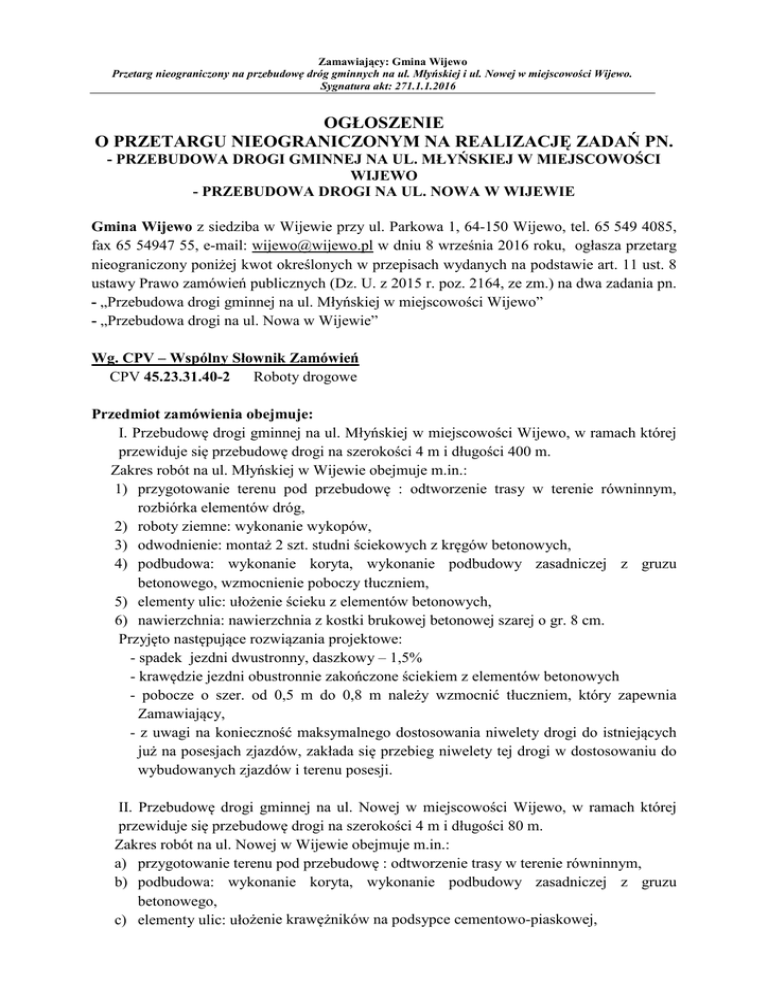 Zamawiający: Gmina Wijewo Przetarg nieograniczony na przebudowę dróg gminnych na ul. Młyńskiej i ul. Nowej w miejscowości Wijewo. Sygnatura akt: 271.1.1.2016 OGŁOSZENIE O PRZETARGU NIEOGRANICZONYM NA REALIZACJĘ ZADAŃ PN. - PRZEBUDOWA DROGI GMINNEJ NA UL. MŁYŃSKIEJ W MIEJSCOWOŚCI WIJEWO - PRZEBUDOWA DROGI NA UL. NOWA W WIJEWIE Gmina Wijewo z siedziba w Wijewie przy ul. Parkowa 1, 64-150 Wijewo, tel. 65 549 4085, fax 65 54947 55, e-mail: [email protected] w dniu 8 września 2016 roku, ogłasza przetarg nieograniczony poniżej kwot określonych w przepisach wydanych na podstawie art. 11 ust. 8 ustawy Prawo zamówień publicznych (Dz. U. z 2015 r. poz. 2164, ze zm.) na dwa zadania pn. - „Przebudowa drogi gminnej na ul. Młyńskiej w miejscowości Wijewo” - „Przebudowa drogi na ul. Nowa w Wijewie” Wg. CPV – Wspólny Słownik Zamówień CPV 45.23.31.40-2 Roboty drogowe Przedmiot zamówienia obejmuje: I. Przebudowę drogi gminnej na ul. Młyńskiej w miejscowości Wijewo, w ramach której przewiduje się przebudowę drogi na szerokości 4 m i długości 400 m. Zakres robót na ul. Młyńskiej w Wijewie obejmuje m.in.: 1) przygotowanie terenu pod przebudowę : odtworzenie trasy w terenie równinnym, rozbiórka elementów dróg, 2) roboty ziemne: wykonanie wykopów, 3) odwodnienie: montaż 2 szt. studni ściekowych z kręgów betonowych, 4) podbudowa: wykonanie koryta, wykonanie podbudowy zasadniczej z gruzu betonowego, wzmocnienie poboczy tłuczniem, 5) elementy ulic: ułożenie ścieku z elementów betonowych, 6) nawierzchnia: nawierzchnia z kostki brukowej betonowej szarej o gr. 8 cm. Przyjęto następujące rozwiązania projektowe: - spadek jezdni dwustronny, daszkowy – 1,5% - krawędzie jezdni obustronnie zakończone ściekiem z elementów betonowych - pobocze o szer. od 0,5 m do 0,8 m należy wzmocnić tłuczniem, który zapewnia Zamawiający, - z uwagi na konieczność maksymalnego dostosowania niwelety drogi do istniejących już na posesjach zjazdów, zakłada się przebieg niwelety tej drogi w dostosowaniu do wybudowanych zjazdów i terenu posesji. II. Przebudowę drogi gminnej na ul. Nowej w miejscowości Wijewo, w ramach której przewiduje się przebudowę drogi na szerokości 4 m i długości 80 m. Zakres robót na ul. Nowej w Wijewie obejmuje m.in.: a) przygotowanie terenu pod przebudowę : odtworzenie trasy w terenie równinnym, b) podbudowa: wykonanie koryta, wykonanie podbudowy zasadniczej z gruzu betonowego, c) elementy ulic: ułożenie krawężników na podsypce cementowo-piaskowej, Zamawiający: Gmina Wijewo Przetarg nieograniczony na przebudowę dróg gminnych na ul. Młyńskiej i ul. Nowej w miejscowości Wijewo. Sygnatura akt: 271.1.1.2016 d) nawierzchnia: nawierzchnia z kostki brukowej betonowej szarej o gr. 8 cm. Przyjęto następujące rozwiązania projektowe: - spadek jezdni daszkowy – 1,5% - krawędzie jezdni obustronnie zakończone krawężnikiem betonowym - z uwagi na konieczność maksymalnego dostosowania niwelety drogi do istniejących już na posesjach zjazdów, zakłada się przebieg niwelety tej drogi w dostosowaniu do wybudowanych zjazdów i terenu posesji. UWAGA! Zamawiający zapewnia materiał, który znajduje się na składowisku w Wijewie na potrzeby wykonania podbudowy zasadniczej z gruzu betonowego o gr. 20 cm na ul. Młyńskiej oraz ul. Nowej w miejscowości Wijewo. Wykonawca zobowiązany jest do zapewnienia obsługi geodezyjnej podczas prowadzenia robót i sporządzenia powykonawczej inwentaryzacji geodezyjnej. Szczegółowy opis elementów przedmiotu zamówienia stanowią załączniki: - Przedmiar robót (ul. Młyńska) – załącznik nr 1 do SIWZ - Przedmiar robót (ul. Nowa) – załącznik nr 2 do SIWZ Termin wykonania zamówienia: Przedmiot zamówienia należy zrealizować w terminie do dnia 10 listopada 2016 r. Nie przewiduje się zamiaru ustanowienia dynamicznego systemu zakupów, Zamawiający nie dopuszcza składania ofert wariantowych, Zamawiający nie dopuszcza składania ofert częściowych, Zamawiający nie przewiduje udzielenia zamówień o których mowa w art. 67 ust.1 pkt. 6 ustawy pzp Zamawiający żąda wskazania przez Wykonawcę w ofercie części zamówienia, które zamierza powierzyć do wykonania podwykonawcy, Nie przewiduje się zawarcia umowy ramowej, Nie przewiduje się wyboru najkorzystniejszej oferty z zastosowaniem aukcji elektronicznej. Nie przewiduje się możliwości udzielania zaliczek na poczet wykonania zamówienia. Wadium Zamawiający nie wymaga wniesienia wadium. Warunki udziału w postępowaniu oraz podstawy wykluczenia 1. O udzielenie zamówienia mogą ubiegać się Wykonawcy, którzy spełniają warunki udziału określone w art. 22 ust. 1 ustawy Prawo zamówień publicznych, dotyczące: - Zdolności technicznej lub zawodowej. Warunek ten zostanie spełniony, jeżeli Wykonawca: wykaże się wykonaniem w okresie ostatnich pięciu lat przed upływem terminu składania ofert, a jeżeli okres prowadzenia działalności jest krótszy – w tym okresie, 2 Zamawiający: Gmina Wijewo Przetarg nieograniczony na przebudowę dróg gminnych na ul. Młyńskiej i ul. Nowej w miejscowości Wijewo. Sygnatura akt: 271.1.1.2016 co najmniej dwóch robót budowlanych obejmujących swoim zakresem budowę, przebudowę lub remont drogi publicznej lub drogi wewnętrznej lub ich części , w tym minimum jedną robotą budowlaną najważniejszą, odpowiadającą swoim rodzajem przedmiotowi zamówienia, polegającą na budowie, przebudowie lub remoncie drogi o nawierzchni z kostki betonowej o minimalnej powierzchni 1500 m2 w ramach jednej roboty budowlanej (z podaniem rodzaju, wartości, daty i miejsca wykonania robót, podmiotów, na rzecz których roboty te zostały wykonane oraz załączeniem dowodów określających czy robota budowlana najważniejsza została wykonana należycie, w szczególności czy została wykonana zgodnie z przepisami prawa budowlanego i prawidłowo ukończona). Ocena spełnienia tego war