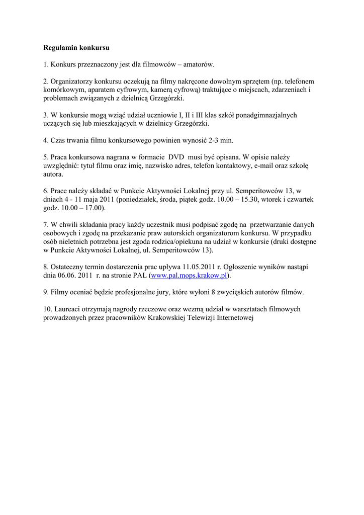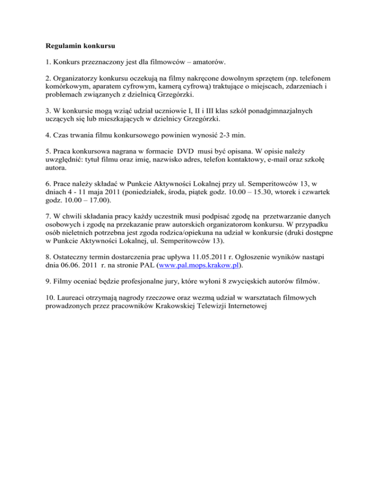 Regulamin konkursu 1. Konkurs przeznaczony jest dla filmowców – amatorów. 2. Organizatorzy konkursu oczekują na filmy nakręcone dowolnym sprzętem (np. telefonem komórkowym, aparatem cyfrowym, kamerą cyfrową) traktujące o miejscach, zdarzeniach i problemach związanych z dzielnicą Grzegórzki. 3. W konkursie mogą wziąć udział uczniowie I, II i III klas szkół ponadgimnazjalnych uczących się lub mieszkających w dzielnicy Grzegórzki. 4. Czas trwania filmu konkursowego powinien wynosić 2-3 min. 5. Praca konkursowa nagrana w formacie DVD musi być opisana. W opisie należy uwzględnić: tytuł filmu oraz imię, nazwisko adres, telefon kontaktowy, e-mail oraz szkołę autora. 6. Prace należy składać w Punkcie Aktywności Lokalnej przy ul. Semperitowców 13, w dniach 4 - 11 maja 2011 (poniedziałek, środa, piątek godz. 10.00 – 15.30, wtorek i czwartek godz. 10.00 – 17.00). 7. W chwili składania pracy każdy uczestnik musi podpisać zgodę na przetwarzanie danych osobowych i zgodę na przekazanie praw autorskich organizatorom konkursu. W przypadku osób nieletnich potrzebna jest zgoda rodzica/opiekuna na udział w konkursie (druki dostępne w Punkcie Aktywności Lokalnej, ul. Semperitowców 13). 8. Ostateczny termin dostarczenia prac upływa 11.05.2011 r. Ogłoszenie wyników nastąpi dnia 06.06. 2011 r. na stronie PAL (www.pal.mops.krakow.pl). 9. Filmy oceniać będzie profesjonalne jury, które wyłoni 8 zwycięskich autorów filmów. 10. Laureaci otrzymają nagrody rzeczowe oraz wezmą udział w warsztatach filmowych prowadzonych przez pracowników Krakowskiej Telewizji Internetowej