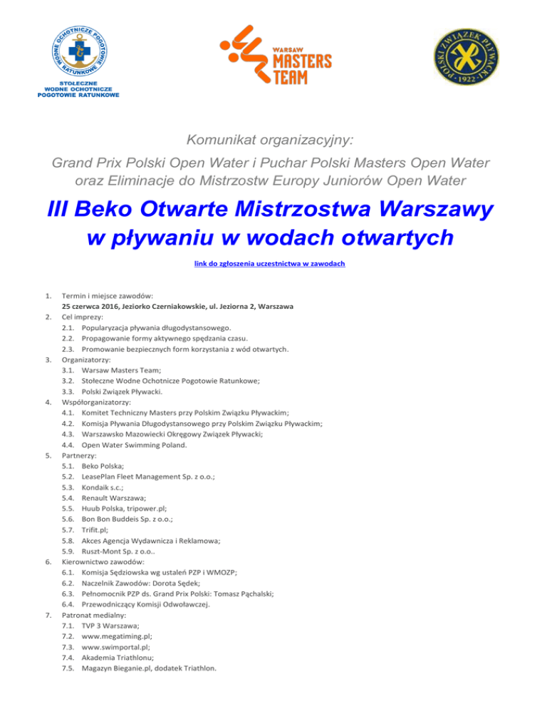 Komunikat organizacyjny: Grand Prix Polski Open Water i Puchar Polski Masters Open Water oraz Eliminacje do Mistrzostw Europy Juniorów Open Water III Beko Otwarte Mistrzostwa Warszawy w pływaniu w wodach otwartych link do zgłoszenia uczestnictwa w zawodach 1. 2. 3. 4. 5. 6. 7. Termin i miejsce zawodów: 25 czerwca 2016, Jeziorko Czerniakowskie, ul. Jeziorna 2, Warszawa Cel imprezy: 2.1. Popularyzacja pływania długodystansowego. 2.2. Propagowanie formy aktywnego spędzania czasu. 2.3. Promowanie bezpiecznych form korzystania z wód otwartych. Organizatorzy: 3.1. Warsaw Masters Team; 3.2. Stołeczne Wodne Ochotnicze Pogotowie Ratunkowe; 3.3. Polski Związek Pływacki. Współorganizatorzy: 4.1. Komitet Techniczny Masters przy Polskim Związku Pływackim; 4.2. Komisja Pływania Długodystansowego przy Polskim Związku Pływackim; 4.3. Warszawsko Mazowiecki Okręgowy Związek Pływacki; 4.4. Open Water Swimming Poland. Partnerzy: 5.1. Beko Polska; 5.2. LeasePlan Fleet Management Sp. z o.o.; 5.3. Kondaik s.c.; 5.4. Renault Warszawa; 5.5. Huub Polska, tripower.pl; 5.6. Bon Bon Buddeis Sp. z o.o.; 5.7. Trifit.pl; 5.8. Akces Agencja Wydawnicza i Reklamowa; 5.9. Ruszt-Mont Sp. z o.o.. Kierownictwo zawodów: 6.1. Komisja Sędziowska wg ustaleń PZP i WMOZP; 6.2. Naczelnik Zawodów: Dorota Sędek; 6.3. Pełnomocnik PZP ds. Grand Prix Polski: Tomasz Pąchalski; 6.4. Przewodniczący Komisji Odwoławczej. Patronat medialny: 7.1. TVP 3 Warszawa; 7.2. www.megatiming.pl; 7.3. www.swimportal.pl; 7.4. Akademia Triathlonu; 7.5. Magazyn Bieganie.pl, dodatek Triathlon. 8. 9. Harmonogram zawodów: 08:30 Otwarcie biura zawodów 09:00 Odprawa techniczna konkurencji “Grand Prix Polski” 09:15 Otwarcie zawodów Grand Prix Polski OW” 09:30 Start do konkurencji “Grand Prix Polski OW” (stroje zgodne z przepisami FINA) 5,0 km, 7,5 km, 10,0 km (zawodnicy z licencją PZP) 11:00 Otwarcie zawodów Puchar Polski Masters 11:15 Odprawa techniczna do konkurencji „Tri i OW” 0,75 km, 1,5 km, 3,0 km 11:45 Start do konkurencji „MW Tri” 0,75 km i 1,5 km (dopuszcza się pianki neoprenowe) 12:00 Dekoracje konkurencji „Grand Prix Polski” 12:30 Start do konkurencji „MW Open Water” 0,75 km i 1,5 km (stroje zgodne z przepisami FINA) 13:15 Start do konkurencji “MW Open Water” 3,0 km (stroje zgodne z przepisami FINA) 13:30 Dekoracje konkurencji „Tri” i „OW” 0,75 km i 3,0 km 15:00 Dekoracje „MW Open Water” 3,0 km 15:30 Oficjalne zakończenie zawodów Konkurencje: nazwa dystans il. pętli limit czasu GRAND PRIX POLSKI (dla zawodników z licencją PZP) 5,0 km 7,5 km 10,0 km 5 6,6 10 75 min 105 min 135 min Mistrzostwa Warszawy TRI i OW 0,75 km 1,5 km 1 2 45 min 3,0 km 4 90 min Mistrzostwa Warszawy OW 9.1. Start i meta znajdują się przy pomoście na Kąpielisku Jeziorko Czerniakowskie. 9.2. Start odbywa się z wody na linii między bojami kierunkowymi. 9.3. Meta wyścigu stanowi bramka z napisem "meta". 9.4. Trasa wyścigu oznaczona będzie bojami koloru pomarańczowego tworzącymi kształt trójkąta. 9.5. Trasa wyścigu będzie prawoskrętna - to oznacza że zawodnicy każdą boję omijają prawym ramieniem. 10. Informacje techniczne: 10.1. Pomiar czasu elektroniczny. 10.2. Każdy zawodnik może wystartować tylko w jednej konkurencji. 10.3. Zawodnicy mogą startować w strojach dopuszczonych przez FINA do rywalizacji na wodach otwartych za wyjątkiem konkurencji „Tri”. 10.4. Zawodnicy nie mogą korzystać z karmienia i picia w trakcie startu. 10.5. Zawodnicy znajdujący się w wodzie po przekroczeniu limitu czasu kończą udział w wyścigu i z przyczyn technicznych nie będą sklasyfikowani. 11. Zawodnicy uczestniczący w zawodach mają prawo: 11.1. Pokryć ciało substancją zabezpieczającą przed obniżeniem temperatury w wodzie; 11.2. Użyć okularków, klipsów na nos i zatyczek do uszu; 11.3. Wezwać pomoc lub przerwać wyścig poprzez uniesienie ręki nad głowę w pozycji „ na plecach”. 12. Zawodnicy uczestniczący w MW nie mogą : 12.1. Korzystać w czasie wyścigu ze sprzętu ułatwiającego pływanie; 12.2. Używać pianek (z wyłączeniem biegu dopuszczającego używanie pianek); 12.3. Korzystać z pomocy osób niezwiązanych z wyścigiem w czasie jego trwania. 13. Zawodnicy uczestniczący w MW Open Water i Grand Prix Polski zobowiązani są do: 13.1. okazania dowodu tożsamości lub licencji PZP przy rejestracji. 13.2. podpisania własnoręcznie oświadczenia przygotowanego przez organizatora, w którym stwierdzają swoją zdolność do udziału w zwodach oraz że startują na własną odpowiedzialność i nie będą wnosić żadnych pretensji do organizatorów w razie ewentualnego uszczerbku na zdrowiu w wyniku startu w zawodach; 13.3. w przypadku zawodników startujących na dystansach 5, 7,5 i 10 km oraz osób niepełnoletnich: - okazania aktualnej licencji zawodniczej PZP, - aktualnych badań lekarskich, - dostarczenia pisemnej, osobiście podpisanej zgody prawnego opiekuna niepełnoletniego zawodnika; 13.4. podporządkowania się decyzjom Komisji Sędziowskiej; 13.5. przestrzegania regulaminu zawodów; 13.6. umożliwienia organizatorowi wpisania w widocznym miejscu wskazanym przez organizatora numeru startowego; 13.7. startu i kontynuowania wyścigu aż do mety w czepku przekazanym przez organizatora. 14. Zawodnicy pokonujący trasę w sposób niedozwolony zostaną zdyskwalifikowani na wniosek Sędziego Głównego. W związku z tym zabrania się: 14.1. utrudniania płynięcia innym zawodnikom: zrywanie okularków, ciągnięcie, odpychanie, wpływanie na plecy itp.; 14.2 chodzenia po dnie poza bojami wyznaczającymi linię startu i mety; 14.3 kontaktu fizycznego z łodzią zabezpieczającą. 15. Trasa wyścigu: 16. Kategorie wiekowe zostają określone po konsultacjach z Komisją Pływania Długodystansowego PZP i KT Masters PZP 16.1. Kategoria 1 – 12-13 lat (12 lat tylko 0,75 km; 13 lat tylko 0,75 km i 1,5 km) 16.2. Kategoria 2 – 14-16 lat 16.3. Kategoria 3 – 1
