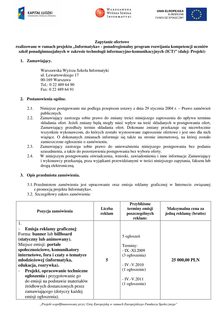 Zapytanie ofertowe realizowane w ramach projektu „Informatyka+ - ponadregionalny program rozwijania kompetencji uczniów szkół ponadgimnazjalnych w zakresie technologii informacyjno-komunikacyjnych (ICT)” (dalej: Projekt) 1. Zamawiający. Warszawska Wyższa Szkoła Informatyki ul. Lewartowskiego 17 00-169 Warszawa Tel.: 0 22 489 64 90 Fax: 0 22 489 64 91 2. Postanowienia ogólne. 2.1. 2.2. 2.3. 2.4. Niniejsze postępowanie nie podlega przepisom ustawy z dnia 29 stycznia 2004 r. – Prawo zamówień publicznych. Zamawiający zastrzega sobie prawo do zmiany treści niniejszego zaproszenia do upływu terminu składania ofert. Jeżeli zmiany będą mogły mieć wpływ na treść składanych w postępowaniu ofert, Zamawiający przedłuży termin składania ofert. Dokonane zmiany przekazuje się niezwłocznie wszystkim wykonawcom, do których zostało wystosowane zaproszenie ofertowe i jest ono dla nich wiążące. O dokonanych zmianach informuje się także na stronie internetowej, na której zostało zamieszczone ogłoszenie o zamówieniu. Zamawiający zastrzega sobie prawo do unieważnienia niniejszego postępowania bez podania uzasadnienia, a także do pozostawienia postępowania bez wyboru oferty. W niniejszym postępowaniu oświadczenia, wnioski, zawiadomienia i inne informacje Zamawiający i wykonawcy przekazują, poza wyjątkami przewidzianymi w treści niniejszego zapytania, faksem lub drogą elektroniczną. 3. Opis przedmiotu zamówienia. 3.1. Przedmiotem zamówienia jest opracowanie oraz emisja reklamy graficznej w Internecie związanej z promocją projektu Informatyka+. 3.2. Szczegółowy zakres zamówienia: Pozycja zamówienia 1. - Emisja reklamy graficznej: Forma: banner lub billboard (statyczny lub animowany). Miejsce emisji: portale społecznościowe, komunikatory internetowe, fora i czaty o tematyce młodzieżowej (informatyka, edukacja, rozrywka). - Projekt, opracowanie techniczne ogłoszenia i przygotowanie go do emisji na podstawie materiałów źródłowych dostarczonych przez zamawiającego (dotyczy każdej emisji ogłoszenia). Liczba reklam Przybliżone terminy emisji poszczególnych reklam: Maksymalna cena za jedną reklamę (brutto) 5 ogłoszeń Terminy: - IX.-XI.2009 (3 ogłoszenia) 5 25 000,00 PLN - IV.-V.2010 (1 ogłoszenie) - IV.-V.2011 (1 ogłoszenie) „Projekt współfinansowany przez Unię Europejską w ramach Europejskiego Funduszu Społecznego” 2. - Emisja reklamy graficznej: Forma: banner lub billboard (statyczny lub animowany). Miejsce emisji: portale o tematyce edukacyjnej. - Projekt, opracowanie techniczne ogłoszenia i przygotowanie go do emisji na podstawie materiałów źródłowych dostarczonych przez zamawiającego (dotyczy każdej emisji ogłoszenia). 3. - Emisja reklamy graficznej: Forma: boks śródtekstowy. Miejsce emisji: portale społecznościowe, fora i czaty o tematyce młodzieżowej (informatyka, edukacja, rozrywka). - Projekt, opracowanie techniczne ogłoszenia i przygotowanie go do emisji na podstawie materiałów źródłowych dostarczonych przez zamawiającego (dotyczy każdej emisji ogłoszenia). 3.3. 3.4. 3.5. 5 ogłoszeń Terminy: - IX.-XI.2009 (2 ogłoszenia) 5 - IV.-V.2010 (1 ogłoszenie) 25 000,00 PLN -IX.-XI.2010 (1 ogłoszenie) - IV.-V.2011 (1 ogłoszenie) 5 ogłoszeń Terminy: - IX.-XI.2009 (2 ogłoszenia) 5 25 000,00 PLN - IX.-XI.2010 (1 ogłoszenie) - IX.-XI.2011 (2 ogłoszenia) Zamawiający dopuszcza możliwość składania ofert częściowych na poszczególne części zamówienia (wymienione pozycje). Oferta, składana na każdą z pozycji (od 1 do 3), musi obejmować wszystkie ogłoszenia przewidziane dla danej pozycji. Wykonawca może złożyć tylko jedną ofertę na poszczególne pozycje, pod rygorem odrzucenia ofert zawierających podwójne oferty na poszczególne pozycje zamówienia. Wykonawca składając ofertę na poszczególne pozycje zamówienia musi założyć, że każde z ogłoszeń w poszczególnych pozycjach będzie oferowane i zrealizowane na takich samych warunkach, ocenianych zgodnie z pkt 7 niniejszego zapytania (tzn. każde z ogłoszeń oferowanych w ramach zadania będzie posiadać taki sam rozmiar, czas emisji i ewentualną możliwość targetowania). O konkretnych terminach emisji ogłoszeń wybrany wykonawca będzie powiadomiony w formie pisemnej przez właściwą osobę ze strony Zamawiającego, z wyprzedzeniem ustalonym w umowie pozwalającym na opracowanie techniczne ogłoszenia oraz przygotowanie go do emisji. 4. Warunki wymagane od wykonawców. O udzielenie niniejszego zamówienia mogą ubiegać się wykonawcy, którzy: 1. są uprawnieni do występowania w obrocie prawnym zgodnie z wymogami ustawowymi, 2. posiadają niezbędną wiedzę i doświadczenie, potencjał ekonomiczny i techniczny, a także dysponuje pracownikami zdolnymi do wykonania zamówienia, 3. dysponują powierzchnią reklamową w Internecie w mediach zgodnych ze specyfikacją wymienioną w zakresie zamówienia, „Projekt współfinansowany przez Unię Europejską w ramach Europejskiego Funduszu Społecznego” Wykonawcy nie spełniający ww. warunków zostaną wykluczeni z postępowania. 5. Sposób porozumiewania się wykonawców z Zamawiającym. 5.1 Wykonawca może zwrócić się do Zamawiającego w formie elektronicznej o wyjaśnienie treści zapytania ofertowego. Ze strony Zamawiającego uprawnionym do udzielania wyjaśnień jest Pani Justyna Gołaszewska, adres internetowy: [email protected]. Informacja zostanie udzielona w terminie 2 dni, chyba, że prośba o wyjaśnienie wpłynęła do zleceniodawcy na mniej niż 4 dni przed terminem otwarcia ofert lub pytanie wykonawcy nie ma w ocenie Zamawiającego wpływu na treść oferty. 5.2 Zamawiający jednocześnie przesyła treść wyjaśnienia wszystkim wykonawcom, którym doręczono zapytanie ofertowe, bez ujawniania źródła zapytania, a także umieszcza ją na stronie internetowej zamawiającego. 6. Sposób przygotowania ofert; miejsce i termin ich składania: 6.1. 6.