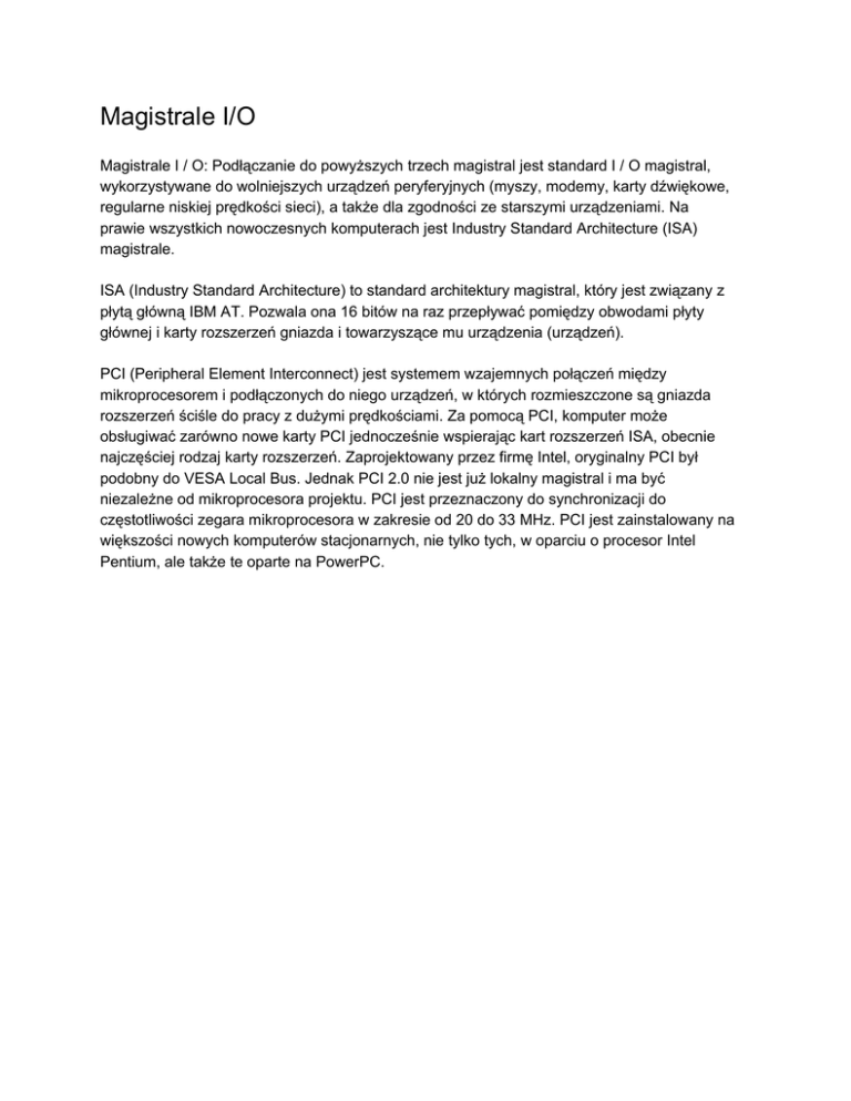 Magistrale I/O Magistrale I / O: Podłączanie do powyższych trzech magistral jest standard I / O magistral, wykorzystywane do wolniejszych urządzeń peryferyjnych (myszy, modemy, karty dźwiękowe, regularne niskiej prędkości sieci), a także dla zgodności ze starszymi urządzeniami. Na prawie wszystkich nowoczesnych komputerach jest Industry Standard Architecture (ISA) magistrale. ISA (Industry Standard Architecture) to standard architektury magistral, który jest związany z płytą główną IBM AT. Pozwala ona 16 bitów na raz przepływać pomiędzy obwodami płyty głównej i karty rozszerzeń gniazda i towarzyszące mu urządzenia (urządzeń). PCI (Peripheral Element Interconnect) jest systemem wzajemnych połączeń między mikroprocesorem i podłączonych do niego urządzeń, w których rozmieszczone są gniazda rozszerzeń ściśle do pracy z dużymi prędkościami. Za pomocą PCI, komputer może obsługiwać zarówno nowe karty PCI jednocześnie wspierając kart rozszerzeń ISA, obecnie najczęściej rodzaj karty rozszerzeń. Zaprojektowany przez firmę Intel, oryginalny PCI był podobny do VESA Local Bus. Jednak PCI 2.0 nie jest już lokalny magistral i ma być niezależne od mikroprocesora projektu. PCI jest przeznaczony do synchronizacji do częstotliwości zegara mikroprocesora w zakresie od 20 do 33 MHz. PCI jest zainstalowany na większości nowych komputerów stacjonarnych, nie tylko tych, w oparciu o procesor Intel Pentium, ale także te oparte na PowerPC.
