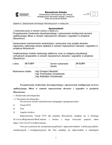 Biocentrum Ochota infrastruktura informatyczna dla rozwoju strategicznych kierunków biologii i medycyny POIG 02.03.00-00-003/09 Zadanie 6. Zastosowanie technologii informatycznych w medycynie Sprawozdanie z wykonania pracy w ramach umowy o dzieło p.t.: Przygotowanie środowiska deweloperskiego i opracowanie konfiguracji serwera aplikacyjnego JBoss w ramach repozytorium obrazów i sygnałów w projekcie Biocentrum. Opracowanie mechanizmów autentykacji i autoryzacji oraz projekt ekranów logowania i głównego ekranu aplikacji w ramach repozytorium obrazów i sygnałów w projekcie Biocentrum. Implementacja modułu testowego platformy wraz ze wstępną wizualizacją wirtualnych preparatów w ramach repozytorium obrazów i sygnałów w projekcie Biocentrum. 02.11.2011 z dnia Wykonawca dzieła: termin wykonania dzieła: 20.12.2011 mgr Grzegorz Barański mgr Przemysław Chmielewski mgr Radosław Chmielewski Przygotowanie środowiska deweloperskiego i opracowanie konfiguracji serwera aplikacyjnego JBoss w ramach repozytorium obrazów i sygnałów w projekcie Biocentrum. 1. Środowisko deweloperskie 1.1 Narzędzia developerskie Na serwerze zostało zainstalowane następujące oprogramowanie: 1. Visual SVN 2. Trac 3. Apache Archiva Repozytorium Visual SVN dla projektu Biocentrum znajduje się w katalogu D:\svn\svnRepositories\BioCentrum i można z niego korzystać poprzez adres https://10.0.10.253/svn/BioCentrum. Trac jest systemem do zarządzania projektami i zgłaszania błędów. Lokalizacja plików instalacyjnych i konfiguracyjnych dla Trac znajduje się odpowiednio w katalogach 1 D:\BioC\BitNamiTracStack i D:\BioC\dev\. Aby umożliwić zarządzanie użytkownikami dla systemu Trac został zainstalowany plugin Trac Account Manager w wersji 0.3.2, za pomocą którego można zarządzać użytkownikami, grupami a także uprawnieniami dla nich. Do konfiguracji projektu biorepozytorium w systemie Trac zostało dodane repozytorium kodów z Visual SVN, aby umożliwić przeglądanie plików z poziomu systemu Trac. Adres, pod którym dostępny jest system Trac to: http://10.0.10.253:8380/trac/BioRepozytorium/ Apache Archiva to repozytorium lokalne dla systemu budowania Apache Maven. Jest ono dostępne pod adresem http://10.0.10.253:8180/archiva/. Użytkownik dla systemu Archiwa to: admin i hasło: biorepo11. 1.2 Narzędzia deweloperskie dla programisty Aby skonfigurować środowisko developerskie należy pobrać następujące oprogramowanie: 1. Oracle Java SDK w wersji 1.6_29 2. Klient SVN np. subversion 3. Eclipse IDE for Java Developers 4. Apache Maven w wersji 3.0 5. PostgreSQL w wersji 9.1 6. serwer JBoss AS 7.0.2.GA Po zainstalowaniu Java SDK należy dodać zmienną systemową JAVA_HOME zgodnie z wybranym katalogiem instalacji, a następnie dopisać zmienną do ścieżki systemowej. Do korzystania z repozytorium Visual SVN wymagany jest klient SVN np. w postaci programu Subversion. Instalacja Eclipse IDE ogranicza się do rozpakowania pobranego archiwum zip/tar. Następnie należy zainstalować następujące pluginy: 1. Subclipse lub Subversive 2. Google Plugin for Eclipse Pluginy można zainstalować z poziomu Eclipse Marketplace lub poprzez dodanie lokalizacji pluginu w Avaible Software Site. Należy się upewnić czy wybrany plugin do korzystania z repozytorium subversion jest zgodny z zainstalowanym klientem SVN. Jeżeli jako klient SVN korzystamy z subversion 2 1.6.x to zgodnym pluginem jest Subclipse w wersji 1.6.x. Dla subversion 1.7.x należy zainstalować plugin Subclipse w wersji 1.8.x. Instalacja Apache Maven polega na rozpakowaniu pobranego archiwum, a następnie dodaniu zmiennej systemowej M2_HOME i dopisanie jej do ścieżki systemowej w postaci M2_HOME/bin. Po zainstalowaniu serwera bazy danych PostgreSQL należy utworzyć bazę danych biorepo oraz rolę biorepo. Skrypty tworzące schemat bazy danych znajdują się w kodach źródłowych w module biorepo-sql. Instalacja serwera JBoss AS 7 sprowadza się do rozpakowania pobranego archiwum ze strony jboss.org. Następnie należy wykonać poniższe kroki w celu konfiguracji serwera: 1. Moduł PostgreSQL JDBC Driver W katalogu modules, który znajduje się w katalogu instalacyjnym JBoss'a należy założyć strukturę org/postgresql/main, a następnie skopiować zawartość katalogu postgrsql z lokalizacji trunk/env/jboss/moduly w repozytorium SVN. 2. Moduł sun.jdk Należy skopiować zawartość katalogu sun.jdk z lokalizacji trunk/env/jboss/moduly/sun.jdk/ do modules/sun/sdk/main w katalogu instalacyjnym JBoss AS 7 3. Pozostałe pliki konfiguracyjne Należy skopiować plik standalone.xml lokalizacji trunk/env/jboss/pliki do katalogu instalacyjnego JBoss'a w standalone oraz plik standalone.conf z trunk/env/jboss/env/ do katalogu bin w katalogu instalacji serwera Jboss. W pliku standalone.xml zostały skonfigurowane parametry dla serwera JBoss AS 7. Są to: 1. Źródło danych (datasource) Konfiguracja parametrów połączenia do bazy danych polega na modyfikacji parametrów w tagach xml dotyczących źródła danych biorepoDS. Domyślna konfiguracja: host: localhost port: 5432 nazwa bazy danych: biorepo użytkownik bazy danych: biorepo hasło użytkownika bazy danych: biorepo 2. Security domain Została utworzona w pliku konfiguracyjnym standalone.xml. security-domain: biorepo. 3 Konfiguracja zawarta w powyższym pliku jest oparta o strukturę uprawnień zawartej w bazie danych. 4. Środowisko djatoka Konfiguracja skryptu startowego standalone.conf umożliwiająca korzystanie z silnika djatoka zamieszczona została w lokalizacji trunk/env/pliki/bin. Należy podmienić plik w katalogu bin w lokalizacji instalacji serwera aplikacyjnego jboss. Skrypt startowy start.sh umożliwia uruchomienie serwera aplikacyjnego jbossa z odpowiednimi parametrami runtime'owymi. Zawiera on konfiguracje zmiennych środowiskowych, które należy odpowiednio ustawić: • JAVA_HOME - katalog domowy Java • JBOSS_HOME - katalog domowy serwera JBoss • DJ