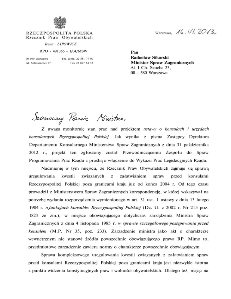 RZECZPOSPOLITA POLSKA Rzecznik Praw Obywatelskich Irena LIPOWICZ RPO - 491365 - I/04/MSW 00-090 Warszawa Pan Radosław Sikorski Minister Spraw Zagranicznych Al. I Ch. Szucha 23, 00 - 580 Warszawa Tel. centr. 22 551 77 00 Al. Solidarności 77 Fax 22 827 64 53 Z uwagą monitoruję stan prac nad projektem ustawy o konsulach i urzędach Jak wynika z pisma Zastępcy Dyrektora konsularnych Rzeczypospolitej Polskiej. Departamentu Konsularnego Ministerstwa Spraw Zagranicznych z dnia 31 października 2012 r., projekt ten zgłoszony został Przewodniczącemu Zespołu do Spraw Programowania Prac Rządu z prośbą o włączenie do Wykazu Prac Legislacyjnych Rządu. Nadmienię w tym miejscu, że Rzecznik Praw Obywatelskich zajmuje się sprawą uregulowania kwestii związanych z załatwianiem spraw przed konsulami Rzeczypospolitej Polskiej poza granicami kraju już od końca 2004 r. Od tego czasu prowadził z Ministerstwem Spraw Zagranicznych korespondencję, w której wskazywał na potrzebę wydania rozporządzenia wymienionego w art. 31 ust. 1 ustawy z dnia 13 lutego 1984 r. o funkcjach konsulów Rzeczypospolitej Polskiej (Dz. U. z 2002 r. Nr 215 poz. 1823 ze zm.), w miejsce obowiązującego dotychczas zarządzenia Ministra Spraw Zagranicznych z dnia 4 listopada 1985 r. w sprawie szczegółowego postępowania przed konsulem (M.P. Nr 35, poz. 233). Zarządzenie ministra jako akt o charakterze wewnętrznym nie stanowi źródła powszechnie obowiązującego prawa RP. Mimo to, przedmiotowe zarządzenie zawiera normy o charakterze powszechnie obowiązującym. Sprawa kompleksowego uregulowania kwestii związanych z załatwianiem spraw przed konsulami Rzeczypospolitej Polskiej poza granicami kraju jest niezwykle istotna z punktu widzenia konstytucyjnych praw i wolności obywatelskich. Dlatego też, mając na 2 uwadze przeciągające się prace nad uregulowaniem tej kwestii w akcie rangi ustawowej, działając na podstawie art. 13 ust. 1 pkt 2 ustawy z dnia 15 lipca 1987 r. o Rzeczniku Praw Obywatelskich (Dz. U. z 2001 r. Nr 14, poz. 147 ze zm.), uprzejmie proszą Pana Ministra o poinformowanie mnie o stanie prac nad wskazanym projektem.