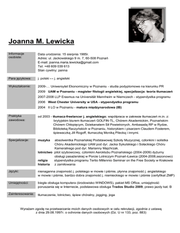 Joanna M. Lewicka Informacje osobiste: Data urodzenia: 15 sierpnia 1985r. Adres: ul. Jackowskiego 9 m. 7, 60-508 Poznań E-mail: [email protected] Tel: +48 609 039 613 Stan cywilny: panna Para językowa: j. polski ↔ j. angielski Wykształcenie: 2009-… Uniwersytet Ekonomiczny w Poznaniu - studia podyplomowe na kierunku PR 2009 UAM w Poznaniu - magister filologii angielskiej, specjalizacja: teoria tłumaczeń 2007-2008 LLP Erasmus na Universität Mannheim w Niemczech - stypendystka programu 2006 West Chester University w USA - stypendystka programu 2004 II LO w Poznaniu - matura międzynarodowa (IB) Praktyka zawodowa: od 2003 - tłumacz-freelancer j. angielskiego; współpraca w zakresie tłumaczeń m.in. z: brytyjskim biurem tłumaczeń GOLFIN-TL, Chórem Akademickim, Poznańskim Chórem Chłopięcym, Dziekanatem Sił Powietrznych, Ambasadą RP w Rydze, Biblioteką Raczyńskich w Poznaniu, historykiem i pisarzem Claudem Fosterem, śpiewaczką Jill Rogoff, tłumaczką Moniką Pilecką i innymi. Specjalizacje: muzyka Języki: nienaganna znajomość j. polskiego w mowie i piśmie, płynna znajomość j. angielskiego w mowie i piśmie, bardzo dobra znajomość j. niemieckiego w mowie i piśmie (certyfikat ZMP) Umiejętności: biegła obsługa komputera (środowisko WINDOWS), pakiet MS Office, umiejętność poruszania się w Internecie, podstawowa obsługa Trados Studio 2009, prawo jazdy kat. B Zainteresowania: tłumaczenie, lotnictwo, śpiew chóralny, jogging, joga absolwentka Poznańskiej Podstawowej Szkoły Muzycznej, członkini i solistka Chóru Akademickiego UAM pod dyr. Jacka Sykulskiego i Sołackiego Chóru Kameralnego pod dyr. Marianny Majchrzak. lotnictwo pilot szybowcowy, członkini Aeroklubu Poznańskiego (2004-2009) dyżurny obsługi pasażerskiej w Porcie Lotniczym Poznań-Ławica (2004-2008,sezonowo) religia stypendystka programu Tertio Millennio Seminar on the Free Society w Krakowie historia z zamiłowania Wyrażam zgodę na przetwarzanie moich danych osobowych w celu rekrutacji, zgodnie z ustawą z dnia 29.08.1997r. o ochronie danych osobowych (Dz. U nr 133, poz. 883)