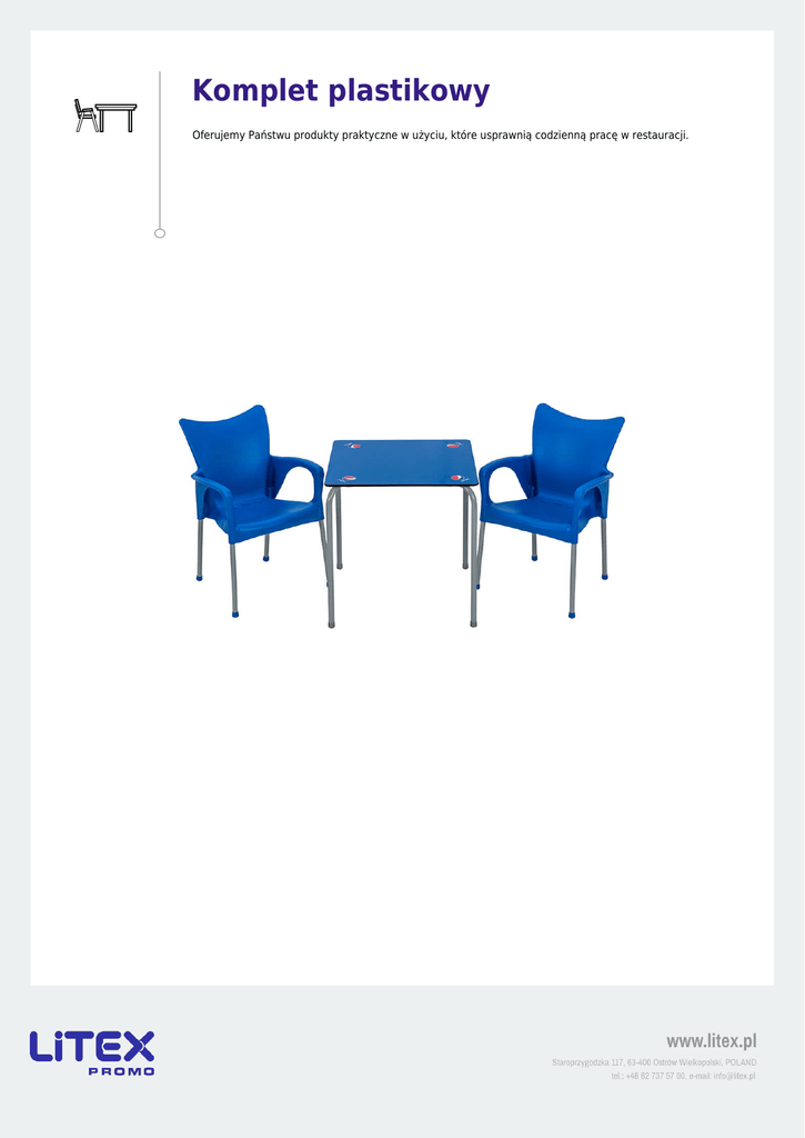 Komplet plastikowy Oferujemy Państwu produkty praktyczne w użyciu, które usprawnią codzienną pracę w restauracji. Komplet plastikowy Dane techniczne ........................................................................................................................................................... Rodzaj konstrukcja stalowa, siedzisko krzesla polipropylen, blat HPL Rozmiar krzeslo stal/polipropylen dl/szer/wys: 42cm/57cm/82cm, stol stal/plyta HPL dl/szer/wys: 70cm/70cm/75cm Rodzaj druku logotyp na oparciu siedziska, logotyp na blacie HPL Pakowanie na palecie