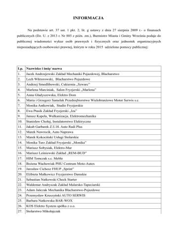 INFORMACJA Na podstawie art. 37 ust. 1 pkt. 2, lit. g ustawy z dnia 27 sierpnia 2009 r.- o finansach publicznych (Dz. U. z 2013 r. Nr 885 z późn. zm.), Burmistrz Miasta i Gminy Września podaje do publicznej wiadomości wykaz osób prawnych i fizycznych oraz jednostek organizacyjnych nieposiadających osobowości prawnej, którym w roku 2015 udzielono pomocy publicznej: Lp. Nazwisko i imię/ nazwa 1. Jacek Andrzejewski Zakład Mechaniki Pojazdowej, Blacharstwo 2. Lech Wiktorowski, Blacharstwo Pojazdowe 3. Andrzej Smodlibowski, Cukiernia „Szwarc” 4. Marlena Marciniak, Salon Fryzjerski „Marlena” 5. Anna Gładyszewska, Elektro Dom 6. Maria i Grzegorz Samelak Przedsiębiorstwo Wielobranżowe Motor Serwis s.c. 7. Monika Antkowiak, Studio Fryzjerskie 8. Ewa Ptasik Zakład Fryzjerski „Iza” 9. Janusz Kapela, Wulkanizacja, Elektromechanika 10. Stanisław Chołuj, Instalatorstwo Elektryczne 11. Jakub Garbarek Z.U.H. Auto Radi Plus 12. Marek Nawrocik, Auto Naprawa 13. Marek Kokociński Usługi Stolarskie 14. Monika Turz Zakład Fryzjerski „Monika” 15. Mariusz Sołtysiak, Elektro-Mar 16. Mariusz Leśniewski Zakład „REM-BUD” 17. HIM Tomczak s.c. Meble 18. Bożena Wachowiak PHU Centrum Moto-Autex 19. Jarosław Cichosz FHUP „Sprint” 20. Elżbieta Małkowicz Fryzjerstwo Damskie 21. Sebastian Natkowski Check Starter 22. Waldemar Andryszak Zakład Malarsko-Tapeciarski 23. Adam Jańczak Mechanika Blacharstwo-Pojazdowe 24. Przemysław Kruszyński AUTO SERWIS 25. Barbara Natkowska BAR-WOX 26. KOS Elektro System spółka z o.o. 27. Stolarstwo Mikołajczak 28. Jan Knysz, Lakiernictwo Pojazdowe 29. Wielkopolska Wojewódzka Komenda OHP 30. Tadeusz Szambelańczyk Zakład Elektromechaniki Chłodniczej 31. Anna Reszelewska Handel Artykułami Spożywczymi 32. Eugeniusz Pietraszak Blacharstwo i Mechanika Pojazdowa 33. Magdalena Sulkowska Firma Odzieżowa Tulipan 34. Michał Ratajczak 35. Manuela Borowiak, Salon Fryzjersko-Kosmetyczny „Halina” 36. Fibikowski WODCOGAZ 37. Paweł Smodlibowski, Zakład Złotniczy Upominek 38. Z.U.AUTO SERWIS s.c. 39. Zbigniew Olejniczak Mechanika Pojazdowa 40. Przemysław Kuczora, „Cukiernia” 41. P.U.P. i H. „Remo Bud” Dworek Zacisze Mirosław Urbaniak, P.U.P.H 42. Dorota Kupczak Restauracja „Pod Jesionami” 43. Barbara Frąckowiak Salon Fryzjerski Męsko-Damski 44. Zbigniew Stawny Mechanika i Blacharstwo Pojazdowe 45. Ryszard Maciejewski, Tapicerstwo U.P.H. 46. Tadeusz Wyrozumialski, Mechanika Pojazdowa i Diagnostyka 47. Anna Kosmala, Sklep Wielobranżowy „ANEX” 48. Firma Wielobranżowa AUTO-PARTNER 49. Emilia Możdżeń, Salon Fryzjerski „Emilia” 50. Salon Fryzjersko-Kosmetyczny TRENDY Monika Wysocka 51. P.H.U. MIR-POL Mirosław Owczarzak 52. P.H.U. Mechanika Pojazdowa Blacharstwo Andrzej Owczarzak 53. HANTPOL Henryk Nowaczyk