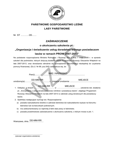 PAŃSTWOWE GOSPODARSTWO LEŚNE LASY PAŃSTWOWE Nr ST ………. /20…… ZAŚWIADCZENIE o ukończeniu szkolenia pt.: „Organizacja i świadczenie usług doradztwa leśnego posiadaczom lasów w ramach PROW 2007-2013” Na podstawie rozporządzenia Ministra Rolnictwa i Rozwoju Wsi z dnia 7 maja 2008 r. w sprawie szkoleń dla podmiotów, których dotyczą działania objęte Programem Rozwoju Obszarów Wiejskich na lata 2007-2013, oraz doradzania odnośnie do sporządzania dokumentacji niezbędnej do uzyskania pomocy finansowej (Dz.U. Nr 89, poz.545) zaświadcza się, że: IMIĘ I NAZWISKO Pan(i).................................................................................... DD-MM-RR MIEJSCE urodzony(a):…………............................r., miejsce urodzenia: .................................................... DD-MM-RR MIEJSCE 1. Odbył(a) w dniach .………………..………… w …………………...…………..szkolenie dot. działania pt.: „Korzystanie z usług doradczych przez rolników i posiadaczy lasów”, objętego Programem Rozwoju Obszarów Wiejskich na lata 2007-2013 w zakresie usług doradczych dla posiadaczy lasów. 2. Spełnił(a) następujące wymogi ww. Rozporządzenia: a) posiada wykształcenie średnie w zakresie leśnictwa lub wykształcenie wyższe na kierunku leśnictwo lub na kierunkach pokrewnych; b) ma udokumentowany co najmniej 2-letni staż pracy w leśnictwie; c) posiada przedmiotowe zaświadczenie o ukończeniu szkolenia, o którym mowa w pkt. 1. DD-MM-RR Warszawa, dnia…………………. ............................................................. (pieczęć organizatora szkolenia) INFORMACJE UZUPEŁNIAJĄCE: Szkolenie przeprowadzono na podstawie programu opracowanego przez Ośrodek Rozwojowo – Wdrożeniowy Lasów Państwowych w Bedoniu. Program szkolenia został zatwierdzony przez Dyrektora Generalnego Lasów Państwowych w dniu 10 października 2008 r., jako spełniający wymagania określone w § 4 ww. Rozporządzenia. Przedmiotem przeprowadzonych zajęć szkoleniowych były zagadnienia wchodzące w przedstawiony poniżej zakres tematyczny szkolenia, stanowiący integralną część programu szkolenia. Zakres tematyczny szkolenia Lp. 1. 2. 3. 4. 5. 6. 7. 8. Zakres zagadnień objętych szkoleniem System pomocy dla leśnictwa w ramach PROW 2007-2013. Zasady realizacji usług doradczych świadczonych posiadaczom lasów. Metodyka doradzania posiadaczom lasów. Zwykła praktyka leśna – leśnictwo zrównoważone. Ochrona leśnej różnorodności biologicznej. Rola martwego drewna w lesie. Odnowienie naturalne – planowanie, uzyskiwanie, pielęgnacja. Kształtowanie granicy lasu. Wprowadzanie domieszek biocenotycznych i podsadzeń przebudowujących. OGÓŁEM: Liczba godzin zajęć teoretycznych praktycznych 1 1 - 1 1 - 1 1 - 2,5 2,5 - 6 5 1 4 2 2 2 1 1 6 3 3 0,5 0,5 - 24 17 7 Omówienie sposobu rejestracji doradcy 9. leśnego w systemie teleinformatycznym Centrum Doradztwa Rolniczego w Brwinowie Razem godzin: Organizator szkolenia: OŚRODEK ROZWOJOWO-WDROŻENIOWY LASÓW PAŃSTWOWYCH w BEDONIU