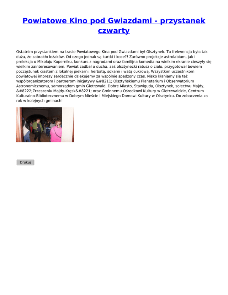Powiatowe Kino pod Gwiazdami - przystanek czwarty Ostatnim przystankiem na trasie Powiatowego Kina pod Gwiazdami był Olsztynek. Tu frekwencja była tak duża, że zabrakło leżaków. Od czego jednak są kurtki i koce?! Zarówno projekcje astrolabium, jak i prelekcja o Mikołaju Koperniku, konkurs z nagrodami oraz familijna komedia na wielkim ekranie cieszyły się wielkim zainteresowaniem. Powiat zadbał o ducha, zaś olsztynecki ratusz o ciało, przygotował bowiem poczęstunek ciastem z lokalnej piekarni, herbatą, sokami i watą cukrową. Wszystkim uczestnikom powiatowej imprezy serdecznie dziękujemy za wspólnie spędzony czas. Nisko kłaniamy się też współorganizatorom i partnerom inicjatywy – Olsztyńskiemu Planetarium i Obserwatorium Astronomicznemu, samorządom gmin Gietrzwałd, Dobre Miasto, Stawiguda, Olsztynek, sołectwu Majdy, „Zrzeszeniu Majdy-Kręsk” oraz Gminnemu Ośrodkowi Kultury w Gietrzwałdzie, Centrum Kulturalno-Bibliotecznemu w Dobrym Mieście i Miejskiego Domowi Kultury w Olsztynku. Do zobaczenia za rok w kolejnych gminach! Drukuj