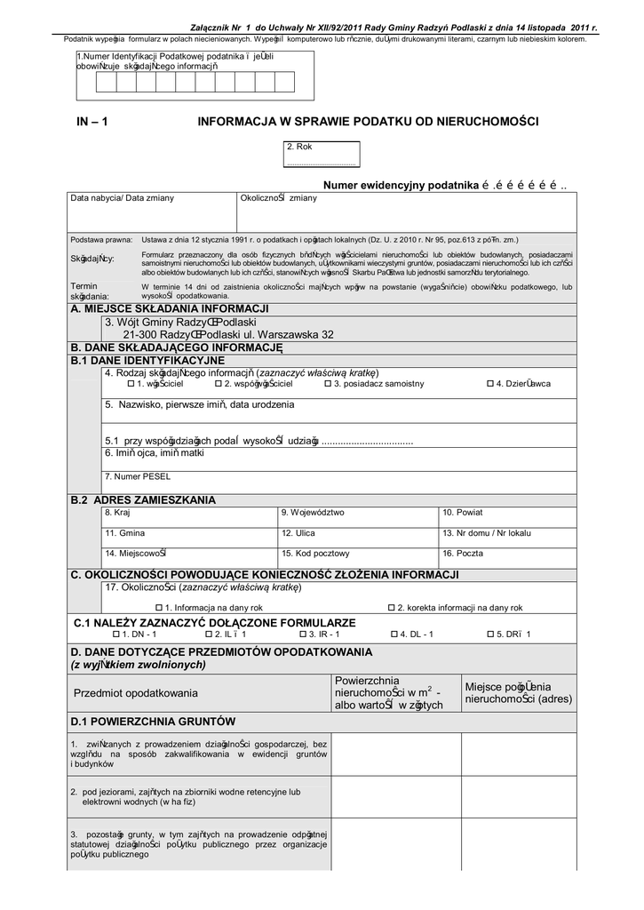 Załącznik Nr 1 do Uchwały Nr XII/92/2011 Rady Gminy Radzyń Podlaski z dnia 14 listopada 2011 r. Podatnik wypełnia formularz w polach niecieniowanych. Wypełnić komputerowo lub ręcznie, dużymi drukowanymi literami, czarnym lub niebieskim kolorem. 1.Numer Identyfikacji Podatkowej podatnika – jeżeli obowiązuje składającego informację IN – 1 INFORMACJA W SPRAWIE PODATKU OD NIERUCHOMOŚCI 2. Rok ...................................... Numer ewidencyjny podatnika ….……………….. Data nabycia/ Data zmiany Okoliczność zmiany Podstawa prawna: Ustawa z dnia 12 stycznia 1991 r. o podatkach i opłatach lokalnych (Dz. U. z 2010 r. Nr 95, poz.613 z późn. zm.) Składający: Formularz przeznaczony dla osób fizycznych będących właścicielami nieruchomości lub obiektów budowlanych, posiadaczami samoistnymi nieruchomości lub obiektów budowlanych, użytkownikami wieczystymi gruntów, posiadaczami nieruchomości lub ich części albo obiektów budowlanych lub ich części, stanowiących własność Skarbu Państwa lub jednostki samorządu terytorialnego. Termin składania: W terminie 14 dni od zaistnienia okoliczności mających wpływ na powstanie (wygaśnięcie) obowiązku podatkowego, lub wysokość opodatkowania. A. MIEJSCE SKŁADANIA INFORMACJI 3. Wójt Gminy Radzyń Podlaski 21-300 Radzyń Podlaski ul. Warszawska 32 B. DANE SKŁADAJĄCEGO INFORMACJĘ B.1 DANE IDENTYFIKACYJNE 4. Rodzaj składającego informację (zaznaczyć właściwą kratkę) o 1. właściciel o 2. współwłaściciel o 3. posiadacz samoistny o 4. Dzierżawca 5. Nazwisko, pierwsze imię, data urodzenia 5.1 przy współudziałach podać wysokość udziału .................................. 6. Imię ojca, imię matki 7. Numer PESEL B.2 ADRES ZAMIESZKANIA 8. Kraj 9. Województwo 10. Powiat 11. Gmina 12. Ulica 13. Nr domu / Nr lokalu 14. Miejscowość 15. Kod pocztowy 16. Poczta C. OKOLICZNOŚCI POWODUJĄCE KONIECZNOŚĆ ZŁOŻENIA INFORMACJI 17. Okoliczności (zaznaczyć właściwą kratkę) o 1. Informacja na dany rok o 2. korekta informacji na dany rok C.1 NALEŻY ZAZNACZYĆ DOŁĄCZONE FORMULARZE o 1. DN - 1 o 2. IL – 1 o 3. IR - 1 o 4. DL - 1 D. DANE DOTYCZĄCE PRZEDMIOTÓW OPODATKOWANIA (z wyjątkiem zwolnionych) Powierzchnia 2 nieruchomości w m Przedmiot opodatkowania albo wartość w złotych D.1 POWIERZCHNIA GRUNTÓW 1. związanych z prowadzeniem działalności gospodarczej, bez względu na sposób zakwalifikowania w ewidencji gruntów i budynków 2. pod jeziorami, zajętych na zbiorniki wodne retencyjne lub elektrowni wodnych (w ha fiz) 3. pozostałe grunty, w tym zajętych na prowadzenie odpłatnej statutowej działalności pożytku publicznego przez organizacje pożytku publicznego o 5. DR– 1 Miejsce położenia nieruchomości (adres) D.2 POWIERZCHNIA UŻYTKOWA BUDYNKÓW LUB ICH CZĘŚCI (*) 1. mieszkalnych – ogółem w tym: kondygnacji o wysokości od 1,40 do 2,20 m ( zaliczyć 50% powierzchni) Kondygnacji o wysokości powyżej 2,20 m 2. związanych z prowadzeniem działalności gospodarczej oraz od części budynków mieszkalnych zajętych na prowadzenie działalności gospodarczej - ogółem , w tym: kondygnacji o wysokości od 1,40 do 2,20 m (zaliczyć 50% powierzchni) kondygnacji o wysokości powyżej 2,20 m 3. zajęte na prowadzenie działalności gospodarczej w zakresie obrotu kwalifikowanym materiałem siewnym - ogółem, w tym: kondygnacji o wysokości od 1,40 do 2,20 m (zaliczyć 50% powierzchni) kondygnacji o wysokości powyżej 2,20 m związanych z udzielaniem świadczeń zdrowotnych w rozumieniu przepisów o działalności leczniczej, zajętych przez podmioty udzielające tych świadczeń - ogółem, w tym: kondygnacji o wysokości od 1,40 do 2,20 m (zaliczyć 50% powierzchni) kondygnacji o wysokości powyżej 2,20 m 4. 5. pozostałych, w tym zajętych na prowadzenie odpłatnej statutowej działalności pożytku publicznego przez organizacje pożytku publicznego - ogółem w tym: kondygnacji o wysokości od 1,40 do 2,20 m (zaliczyć 50% powierzchni) kondygnacji o wysokości powyżej 2,20 m D. 3 BUDOWLE 1.budowle (art. 4 ust.1 pkt. 3 ust 3-7 ustawy o podatkach i opłatach lokalnych) 27. .................................................................................. ,............... E. INFORMACJA O PRZEDMIOTACH I PODMIOTACH ZWOLNIONYCH (podać powierzchnię, bądź wartość budowli przedmiotów zwolnionych oraz przepis prawa – z jakiego tytułu występuje zwolnienie) E. INFORMACJA o współwłaścicielach: F. OŚWIADCZENIE I PODPIS SKŁADAJĄCEGO / OSOBY REPREZENTUJĄCEJ SKŁADAJĄCEGO Oświadczam, że znane jest mi odpowiedzialność karno skarbowa za podanie danych niezgodnych z rzeczywistością. Zgodnie z art. 165 Ordynacji podatkowej wnoszę o wydanie decyzji w zakresie ustalenia – zmiany – wygaśnięcia zobowiązania podatkowego. Oświadczam, że podane przeze mnie dane są zgodne z prawdą. 28. Imię 29. Nazwisko 30. Data wypełnienia (dzień – miesiąc – rok) 31. Podpis (pieczęć) składającego / osoby reprezentującej składającego G. ADNOTACJE ORGANU PODATKOWEGO 32. Uwagi organu podatkowego 33. Identyfikator przyjmującego formularz 34. Data i podpis przyjmującego formularz POUCZENIE BUDYNEK – obiekt budowlany, który jest trwale związany z gruntem, wydzielony z przestrzeni za pomocą przegród budowlanych oraz posiada fundamenty i dach. Do powierzchni użytkowej budynku lub jego części należy zaliczyć powierzchnię mierzoną , po wewnętrznej długości ścian na wszystkich kondygnacjach, z wyjątkiem powierzchni klatek schodowych oraz szybów dźwigowych. Za kondygnację uważa się również garaże podziemne, piwnice, sutereny i poddasza użytkowe.