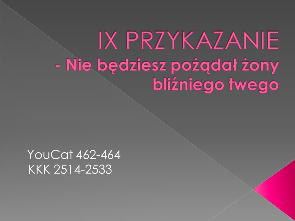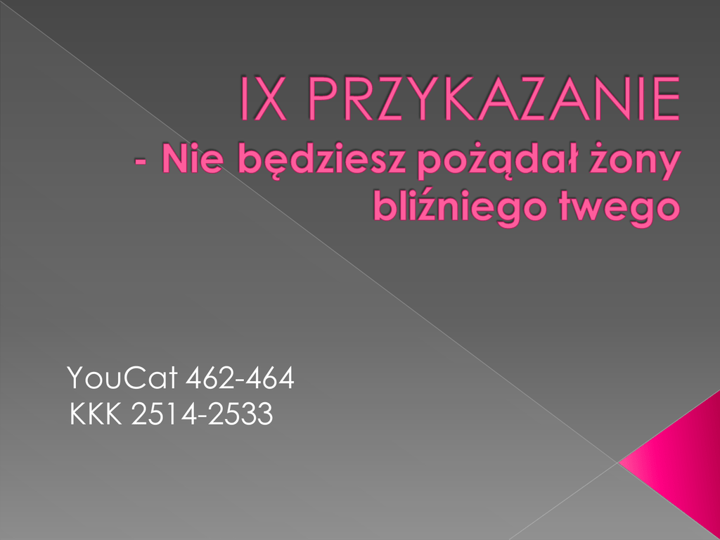 YouCat 462-464 KKK 2514-2533 Wj 20,17 «Nie będziesz pożądał domu bliźniego Pwt 5,21 «Nie będziesz pożądał żony swojego twego. Nie będziesz pożądał żony bliźniego twego, ani jego niewolnika, ani jego niewolnicy, ani jego wołu, ani jego osła, ani żadnej rzeczy, która należy do bliźniego twego». bliźniego. Nie będziesz pragnął domu swojego bliźniego ani jego pola, ani jego niewolnika, ani jego niewolnicy, ani jego wołu, ani jego osła, ani żadnej rzeczy, która należy do twojego bliźniego». Jak łatwo zauważyć 9 przykazanie łączy się z 10 przykazaniem Bożym. Jezus mówiąc o czystości używa zwrotu: „Błogosławieni czystego serca…” (Mt 5,8). W języku Biblii „serce” jest nie tylko siedliskiem ludzkiej emocjonalności, ale stanowi całe jego wnętrze (intelekt, rozum, wola). „Czystość serca niezbędną do tego, by kochać, uzyskuje się dzięki relacji z Bogiem na modlitwie. Tam, gdzie dotyka nas Boża łaska, otwiera się również droga do czystej, niepodzielnej, ludzkiej miłości. Gdy usilnie zwracamy się do Boga, On przemienia nasze serce. Daje nam siłę, byśmy postępowali zgodnie z Jego wolą i usuwa nieczyste myśli, fantazje i pragnienia.” (YC 463) „Słyszeliście, że powiedziano: «Nie cudzołóż!». A Ja wam powiadam: Każdy, kto pożądliwie patrzy na kobietę, już się w swoim sercu dopuścił z nią cudzołóstwa” (Mt 5, 27-28). Pożądanie jest to stan silnego pragnienia posiadania czegoś lub odbycia stosunku płciowego. Występuje najczęściej pod wpływem bodźców zmysłowych (wzrok, dotyk, zapach). Aby dobrze zrozumieć o jakim pożądaniu mówi 9. przykazanie należy dokonać rozróżnienia na dwa typy grzechu: - grzech wewnętrzny, czyli decyzję w umyśle i woli, aby popełnić jakieś zło. - grzech zewnętrzny, czyli zewnętrzne wykonanie podjętej decyzji. „Pożądanie nie jest grzechem. Jest ono jedną z różnych form pokus, jakich doznaje człowiek. Pokusa zaś lub skłonność do zła nie jest jeszcze grzechem. Pożądanie pobudza „człowieka do popełniania grzechów” (Sobór Trydencki; KKK 2515). Najsilniejszy jednak nacisk wywołuje pożądanie na ludzką wolę, aby je zaspokoiła przez jakieś egoistyczne, a tym samym grzeszne działanie. Nie ma jednak grzechu, dopóki nie zapadnie w sercu ludzkim jakaś dobrowolna i świadoma zła decyzja. Grzech bowiem polega na świadomym i dobrowolnym wyborze zła, na świadomej rezygnacji z poznanego przez sumienie dobra. Jest on zawsze wewnętrzną decyzją człowieka. Pożądanie do takiego wyboru skłania, lecz nim jeszcze nie jest, dlatego nie można jej uważać za grzech. Złe zewnętrzne czyny – popełniane świadomie I dobrowolnie – ujawniają grzech, który zawsze ma swoją siedzibę w sercu człowieka, ściślej – w jego złej woli. Tak więc nie jest grzechem popęd seksualny ani samo odczuwanie pożądania. Jest nim natomiast dobrowolne i świadome uleganie egoistycznemu pragnieniu, przejawiające się np. w świadomym i dobrowolnym wewnętrznym rozbudzaniu lub podtrzymywaniu grzesznych wyobrażeń lub planowaniu popełnienia cudzołóstwa.” Podsumowując, pożądanie, przed którym przestrzega 9. przykazanie, jest pożądaniem, nad którym człowiek traci panowanie i możemy je nazwać „pożądliwością”. „Wszystko bowiem, co jest na świecie, a więc: pożądliwość ciała, pożądliwość oczu i pycha tego życia, pochodzi nie od Ojca, lecz od świata. Świat zaś przemija, a z nim jego pożądliwość; kto zaś wypełnia wolę Bożą, ten trwa na wieki.” (1J 2, 16-17) aby strzec wierności i jedności w małżeństwie Aby ostrożnie obchodzić się z pożądaniem seksualnym: nie rozbudzać go przedwcześnie i nadmiernie oraz kierować we właściwą stronę (do własnego męża, do własnej żony) Do pracy nad czystością serca (YC 463) Do pielęgnowania w sobie wstydliwości (YC 46). nakazuje troskę o pełną miłość, która ma ogarniać całego człowieka, przede wszystkim zaś – jego serce. Tylko taka bowiem głęboka wewnętrzna szczera i czysta miłość owocuje w dobrych czynach zewnętrznych. Świadome i dobrowolne dopuszczanie nieskromnych myśli, wyobrażeń i pragnień. Rozbudzanie i podtrzymywanie nieskromnych myśli przez lekturę, oglądanie filmów, czasopism lub stron internetowych o treści erotycznej lub pornograficznej. Nieopanowana pożądliwość w spojrzeniu i w pragnieniach. Chęć zdrady, której się nie odrzuca. Nieczyste propozycje wobec innych. Bezwstyd. Ranienie czyjejś wrażliwości i naturalnego poczucia wstydu. Obowiązkowa dla wszystkich: Co to jest bezwstyd? Dla chętnych: Czym jest permisywizm i jaki ma związek z 9. przykazaniem? Marta Pawłowska i Natalia Buczyńska 1a SLO